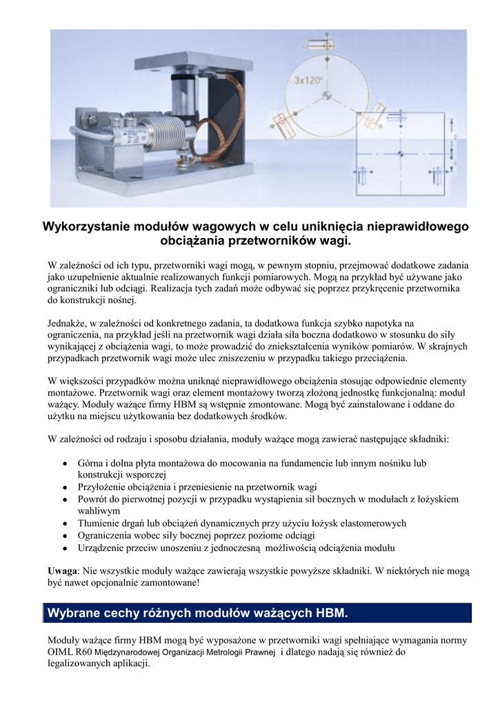Wykorzystanie modułów wagowych w celu uniknięcia nieprawidłowego obciążania przetworników wagi. W zależności od ich typu, przetworniki wagi mogą, w pewnym stopniu, przejmować dodatkowe zadania jako uzupełnienie aktualnie realizowanych funkcji pomiarowych. Mogą na przykład być używane jako ograniczniki lub odciągi. Realizacja tych zadań może odbywać się poprzez przykręcenie przetwornika do konstrukcji nośnej. Jednakże, w zależności od konkretnego zadania, ta dodatkowa funkcja szybko napotyka na ograniczenia, na przykład jeśli na przetwornik wagi działa siła boczna dodatkowo w stosunku do siły wynikającej z obciążenia wagi, to może prowadzić do zniekształcenia wyników pomiarów. W skrajnych przypadkach przetwornik wagi może ulec zniszczeniu w przypadku takiego przeciążenia. W większości przypadków można uniknąć nieprawidłowego obciążenia stosując odpowiednie elementy montażowe. Przetwornik wagi oraz element montażowy tworzą złożoną jednostkę funkcjonalną: moduł ważący. Moduły ważące firmy HBM są wstępnie zmontowane. Mogą być zainstalowane i oddane do użytku na miejscu użytkowania bez dodatkowych środków. W zależności od rodzaju i sposobu działania, moduły ważące mogą zawierać następujące składniki: Górna i dolna płyta montażowa do mocowania na fundamencie lub innym nośniku lub konstrukcji wsporczej Przyłożenie obciążenia i przeniesienie na przetwornik wagi Powrót do pierwotnej pozycji w przypadku wystąpienia sił bocznych w modułach z łożyskiem wahliwym Tłumienie drgań lub obciążeń dynamicznych przy użyciu łożysk elastomerowych Ograniczenia wobec siły bocznej poprzez poziome odciągi Urządzenie przeciw unoszeniu z jednoczesną możliwością odciążenia modułu Uwaga: Nie wszystkie moduły ważące zawierają wszystkie powyższe składniki. W niektórych nie mogą być nawet opcjonalnie zamontowane! Wybrane cechy różnych modułów ważących HBM. Moduły ważące firmy HBM mogą być wyposażone w przetworniki wagi spełniające wymagania normy OIML R60 Międzynarodowej Organizacji Metrologii Prawnej i dlatego nadają się również do legalizowanych aplikacji. Zalety modułów ważących HBM: Bezobsługowość Oszczędność miejsca poprzez minimalizację wysokości konstrukcji Łatwość montażu Dostępność wersji ocynkowanych lub ze stali nierdzewnej Możliwość zamówienia wersji EEx (i) przetwornika na życzenie Wyposażone w zależności od typu w urządzenia przeciwunoszeniowe Wyposażone w drążki odciągi Wybrane moduły dostępne z ogranicznikiem przeciw przeciążeniowym Uwaga: Nie wszystkie moduły ważące zawierają wszystkie powyższe składniki. W niektórych nie mogą być nawet opcjonalnie zamontowane! HBM stale rozszerza zakres oferowanych modułów ważących. Proszę zapoznać się z najnowszym katalogiem produktów w celu uzyskania informacji o nowych komponentach. Fot 1. Moduł ważący Z6 50-500kg Fot. 2 Moduł ważący RTN 1-33T Fot. 3 Moduł ważący C16 20-200T Fot. 4 Moduł ważący HLC 550kg-4,4T Konfiguracja modułów ważenia w zależności od zastosowania. Rys.5 Odciągi przenoszą siły boczne, aż do maksymalnej wartości określonej w instrukcji obsługi modułu ważącego. Aby uniknąć uszkodzenia, ta maksymalna wartość nie może w żadnym wypadku być przekroczona. Jeżeli nie można tego zagwarantować należy podjąć dodatkowe środki ochronny. Ponadto, istotne jest, aby zwrócić uwagę na to, że odciągi nie mogą przenieść sił bocznych. Najkorzystniejsza konfiguracja powinna być określona przed zainstalowaniem modułów w miejscu docelowym. Istotne jest, aby już w trakcie projektowania wziąć pod uwagę indywidualne okoliczności, jak na przykład obciążenia wiatrowe, objętości zbiorników, siły boczne, wpływ rozszerzalności termicznej. Z jednej strony wszystkie występujące obciążenia, bez wyjątku powinny być przenoszone w kierunku zainstalowanych odciągów, przy zachowaniu dopuszczalnych wartości granicznych, z drugiej strony, rozszerzalność termiczna, która może wywierać znaczną siłę nie może być zahamowana. Wskazówki montażowe sugerowane przez firmę HBM mogą zapewnić rozwiązanie najczęściej spotykanych sytuacji w aplikacjach. Konfiguracja modułów ważących musi być sprawdzona i dopasowana do obciążeń statycznych, dynamicznych i termicznych dla każdego projektu indywidualnie. Uwaga: Kiedy zbiornik jest podparty w czterech punktach (cztery moduły), jedna podpora powinna być zaprojektowana bez odciągu (rys. 5), tak aby uniknąć ograniczania ruchów kompensacyjnych i jednocześnie uszkodzenia modułów. Łożysko stałe jako opłacalny zamiennik modułu. Łożyska nieruchome (stałe) mogą być użyte w dwojaki sposób, jako akcesorium montażowe lub substytut modułu ważącego. Korzystanie tylko z jednego lub dwóch „modułów pomiarowych", w zależności od kształtu zbiornika, umożliwia znaczne obniżenie kosztów materiałów i instalacji. Zapewnienie wystarczająco dokładnych wyników pomiarów jest możliwe tylko w zbiornikach, których środek ciężkości zmienia się w kierunku pionowym i nie wpływa na niego proces napełniania. W większości przypadków jest to zasadne tylko w przypadku cieczy i ewentualnie materiałów sypkich. Aplikacje te wymagają również optymalnego usytuowania łożyska stałego i modułów. Łożysko stałe oferuje maksymalną sztywność w kierunku wzdłużnym i maksymalną elastyczność w kierunku prostopadłym do kierunku obciążenia. Należy przy tym uwzględnić siły wiatru i ich wpływ na wynik ważenia. Czynniki wpływające na montaż. Nierówności powierzchni styku. Nierówności powierzchni mniejszej niż 0,6 mm są dopuszczalne. Większe nierówności należy wyrównać szczeliwem, na przykład AFM-30 (Reinz). Kąt nachylenia powierzchni styku. Czułość przetwornika wagi zmniejsza się o 1-cosα. Odchylenie to jest kompen