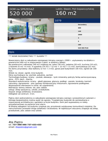 DOM na SPRZEDAŻ 520 000 Lublin, Sławin, Poli Gojawiczyńskiej 160 m2 1079 Secondary 400 140 2000 3 5 160 520 000 PLN Opis *** NOWE BUDOWNICTWO *** SŁAWIN *** Nowoczesny dom w zabudowie szeregowej (skrajny szereg) z 2000 r. usytuowany na działce o powierzchni 400 m2 w miejscowości Lublin, w dzielnicy Sławin. Na powierzchni całkowitej 140 m2 znajdują się: salon (30 m2), jadalnia (20 m2), kuchnia (10 m2), 2 łazienki (5 m2 +5 m2), 4 sypialnie (14 m2 + 12 m2 + 12 m2 + 11 m2), komunikacja (21 m2). Do domu przynależy: dwa balkony (2 m2 + 2 m2), garaż pod budynkiem (30 m2), ogród (ok 100 m2). Widok na: skwer, ogród, inne budynki. Okna wychodzące na: wschód, południe, zachód. Technologia budowy: ściany – pustak; elewacja – tynk mineralny pokryty farbą samoczyszczącą; okna – PCV; dach - blacha. Standard wykończenia: ściany - gładź gipsowa, glazura; podłogi - panele, terakota, kamień naturalny; ogrzewanie – piec gazowy kondensacyjny Viessmann, ogrzewanie podłogowe. Wyposażenie oferowane w cenie: do uzgodnienia. Rekreacja: tereny zielone. las, plac zabaw. Usługi: sklep spożywczy, szkoła, przedszkole. Dojazd: droga asfaltowa, brukowana. Odległość od centrum: 3 km. Piękny dom jednorodzinny w zabudowie szeregowej (skrajny szereg) z przeszklonym salonem z którego bezpośrednio można wyjść do ogrodu. Trzypiętrowy budynek do zamieszkania o nowoczesnej architekturze z garażem w bryle budynku. Dom jest wyposażony w rolety antywłamaniowe na parterze oraz alarm. W bliskiej odległości od budynku znajduje się: przystanek autobusowy komunikacji miejskiej. Do nieruchomości prowadzi droga asfaltowa i brukowana. W najbliższym otoczeniu znajduje się sklep, przedszkole, plac zabaw oraz szkoła. 4te Piętro tel. 737-490-490 737-433-433 email: [email protected] 4te Piętro 4te Piętro Powered by TCPDF (www.tcpdf.org)