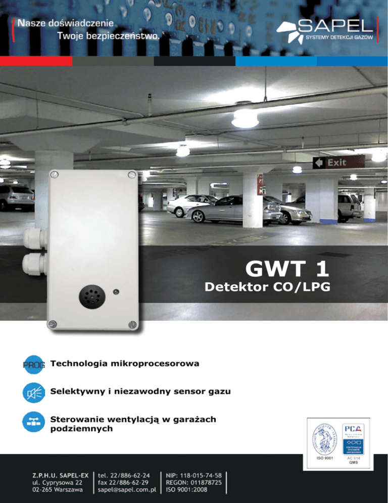 GWT 1 Detektor CO/LPG Technologia mikroprocesorowa Selektywny i niezawodny sensor gazu Sterowanie wentylacją w garażach podziemnych Opis ogólny Detektory gazów serii GWT1 to nowoczesne, oparte na technice mikroprocesorowej urządzenia, służące do monitorowania obecności gazów w otaczającej atmosferze np.: tlenku węgla (CO) lub propanbutanu (LPG). W zależności od aplikacji, detektor może być wyposażony w różne rodzaje sensorów oraz pracować w różnych zakresach pomiarowych. Przy konstruowaniu urządzenia zwrócono szczególna uwagę na funkcjonalność, niezawodność oraz ergonomię użytkowania. Podstawowe cechy funkcjonalne detektorów: • dualny, cyfrowy system kalibracji • detekcja uszkodzenia, stanów alarmowych oraz funkcji testowych • sygnalizacja statusu pracy • informacja o konieczności wykonania rekalibracji • sterowanie elementami automatyki W detektorach rozmieszczonych w chronionym obszarze następuje konwersja wartości stężenia gazu na sygnał elektryczny. Informacja o statusie pracy urządzenia (awaria, tryb specjalny, alarm itp.), sygnalizowana jest poprzez LED bezpośrednio na pulpicie urządzenia. Po przekroczeniu nastaw alarmowych zostaje uruchomiona sygnalizacja optyczna i akustyczna oraz uaktywnienie wyjść decyzyjnych umożliwiających sterowanie elementami lokalnego zabezpieczenia. Lokalną sygnalizację akustyczną można dezaktywować. Dane techniczne Napięcie zasilania Pobór mocy Typ sensora Rodzaj pracy urządzenia Indykacja wyniku pomiaru Ilość progów alarmowych Wartość progów alarmowych GWT1 (CO) GWT1 (LPG) Wyjścia decyzyjne PK1/PK2 stykowe przełączane) AWARIA (stykowe, przełączane) ALM (napięciowe 12VDC) Stopień ochrony Wymiary Waga 230VAC (-15%, +10%)/ opcja12VDC 5W półprzewodnikowy Ciągły Diody LED 2 20/100 ppm 10/30%DGW Wersja S • • • IP42 160x82x55mm ok. 0,5 kg wersja Wersja L Wersja M • • • Schemat ideowy Wkrótce Wymiary