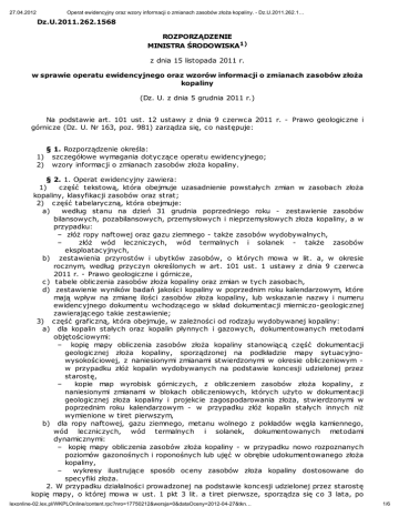 27.04.2012 Operat ewidencyjny oraz wzory informacji o zmianach zasobów złoża kopaliny. - Dz.U.2011.262.1… Dz.U.2011.262.1568 ROZPORZĄDZENIE MINISTRA ŚRODOWISKA1) z dnia 15 listopada 2011 r. w sprawie operatu ewidencyjnego oraz wzorów informacji o zmianach zasobów złoża kopaliny (Dz. U. z dnia 5 grudnia 2011 r.) Na podstawie art. 101 ust. 12 ustawy z dnia 9 czerwca 2011 r. - Prawo geologiczne i górnicze (Dz. U. Nr 163, poz. 981) zarządza się, co następuje: 1) 2) § 1. Rozporządzenie określa: szczegółowe wymagania dotyczące operatu ewidencyjnego; wzory informacji o zmianach zasobów złoża kopaliny. § 2. 1. Operat ewidencyjny zawiera: 1) część tekstową, która obejmuje uzasadnienie powstałych zmian w zasobach złoża kopaliny, klasyfikacji zasobów oraz strat; 2) część tabelaryczną, która obejmuje: a) według stanu na dzień 31 grudnia poprzedniego roku - zestawienie zasobów bilansowych, pozabilansowych, przemysłowych i nieprzemysłowych złoża kopaliny, a w przypadku: – złóż ropy naftowej oraz gazu ziemnego - także zasobów wydobywalnych, – złóż wód leczniczych, wód termalnych i solanek - także zasobów eksploatacyjnych, b) zestawienia przyrostów i ubytków zasobów, o których mowa w lit. a, w okresie rocznym, według przyczyn określonych w art. 101 ust. 1 ustawy z dnia 9 czerwca 2011 r. - Prawo geologiczne i górnicze, c) tabele obliczenia zasobów złoża kopaliny oraz zmian w tych zasobach, d) zestawienie wyników badań jakości kopaliny w poprzednim roku kalendarzowym, które mają wpływ na zmianę ilości zasobów złoża kopaliny, lub wskazanie nazwy i numeru ewidencyjnego dokumentu wchodzącego w skład dokumentacji mierniczo-geologicznej zawierającego takie zestawienie; 3) część graficzną, która obejmuje, w zależności od rodzaju wydobywanej kopaliny: a) dla kopalin stałych oraz kopalin płynnych i gazowych, dokumentowanych metodami objętościowymi: – kopię mapy obliczenia zasobów złoża kopaliny stanowiącą część dokumentacji geologicznej złoża kopaliny, sporządzonej na podkładzie mapy sytuacyjnowysokościowej, z naniesionymi zmianami stwierdzonymi w okresie obliczeniowym w przypadku złóż kopalin wydobywanych na podstawie koncesji udzielonej przez starostę, – kopie map wyrobisk górniczych, z obliczeniem zasobów złoża kopaliny, z naniesionymi zmianami w blokach obliczeniowych, których użyto w dokumentacji geologicznej złoża kopaliny i projekcie zagospodarowania złoża, stwierdzonymi w poprzednim roku kalendarzowym - w przypadku złóż kopalin stałych innych niż wymienione w tiret pierwszym, b) dla ropy naftowej, gazu ziemnego, metanu wolnego z pokładów węgla kamiennego, wód leczniczych, wód termalnych i solanek, dokumentowanych metodami dynamicznymi: – kopię mapy obliczenia zasobów złoża kopaliny - w przypadku nowo rozpoznanych poziomów gazonośnych i roponośnych lub ujęć w obrębie udokumentowanego złoża kopaliny, – wykresy ilustrujące sposób oceny zasobów złoża kopaliny dostosowane do specyfiki złoża. 2. W przypadku działalności prowadzonej na podstawie koncesji udzielonej przez starostę kopię mapy, o której mowa w ust. 1 pkt 3 lit. a tiret pierwsze, sporządza się co 3 lata, po lexonline-02.lex.pl/WKPLOnline/content.rpc?nro=17750212&wersja=0&dataOceny=2012-04-27&tkn… 1/6 27.04.2012 Operat ewidencyjny oraz wzory informacji o zmianach zasobów złoża kopaliny. - Dz.U.2011.262.1… dokonaniu obmiaru wyrobisk. § 3. Operat ewidencyjny sporządza się z zachowaniem numeracji i oznaczeń poszczególnych parceli lub bloków obliczeniowych, poziomów gazonośnych i roponośnych lub ujęć, których użyto w dokumentacji geologicznej złoża kopaliny i projekcie zagospodarowania złoża. § 4. Wzór informacji o zmianach zasobów złoża kopaliny: 1) Z-1 Zestawienie zmian zasobów złoża - innej niż wskazana w pkt 2-4, jest określony w załączniku nr 1 do rozporządzenia; 2) Z-2 Uproszczone zestawienie zmian zasobów złoża - wydobywanej ze złoża na podstawie koncesji udzielonej przez starostę, jest określony w załączniku nr 2 do rozporządzenia; 3) Z-3 Zestawienie zmian zasobów złóż ropy naftowej, gazu ziemnego i metanu pokładów węgla kamiennego jest określony w załączniku nr 3 do rozporządzenia; 4) Z-4 Zestawienie zmian zasobów złóż wód leczniczych, wód termalnych i solanek jest określony w załączniku nr 4 do rozporządzenia. § 5. Rozporządzenie wchodzi w życie z dniem 1 stycznia 2012 r.2) ______ Minister Środowiska kieruje działem administracji rządowej - środowisko, na podstawie § 1 ust. 2 pkt 2 rozporządzenia Prezesa Rady Ministrów z dnia 16 listopada 2007 r. w sprawie szczegółowego zakresu działania Ministra Środowiska (Dz. U. Nr 216, poz. 1606). 2) Niniejsze rozporządzenie było poprzedzone rozporządzeniem Ministra Środowiska z dnia 20 czerwca 2005 r. w sprawie szczegółowych wymagań, jakim powinny odpowiadać operaty ewidencyjne zasobów złóż kopalin (Dz. U. Nr 116, poz. 979), które na podstawie art. 224 ustawy z dnia 9 czerwca 2011 r. - Prawo geologiczne i górnicze (Dz. U. Nr 163, poz. 981) traci moc z dniem wejścia w życie niniejszego rozporządzenia. 1) ZAŁĄCZNIKI ZAŁĄCZNIK Nr 1 WZÓR Z-1 Zestawienie zmian zasobów złoża wzór Objaśnienia: Należy wpisać nazwę złoża zgodnie z decyzją zatwierdzającą dokumentację geologiczną złoża kopaliny lub zawiadomieniem o przyjęciu dokumentacji geologicznej złoża kopaliny. Informację wypełnia się dla złoża kopaliny, o której mowa w § 4 pkt 1 rozporządzenia Ministra Środowiska z dnia 15 listopada 2011 r. w sprawie operatu ewidencyjnego oraz wzorów informacji o zmianach zasobów złoża kopaliny (Dz. U. Nr 262, poz. 1568). 2) Należy wpisać nazwę kopaliny zgodnie z decyzją zatwierdzającą dokumentację geologiczną złoża kopaliny lub zawiadomieniem o przyjęciu dokumentacji geologicznej złoża kopaliny. 3) System prowadzo