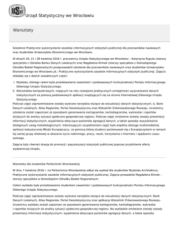 Urząd Statystyczny we Wrocławiu Warsztaty Szkolenie Praktyczne wykorzystanie zasobów informacyjnych statystyki publicznej dla pracowników naukowych oraz studentów Uniwersytetu Ekonomicznego we Wrocławiu W dniach 20, 21 i 28 kwietnia 2016 r. pracownicy Urzędu Statystycznego we Wrocławiu – Katarzyna Rypuła (starszy specjalista z Ośrodka Banku Danych Lokalnych) oraz Magdalena Klimek (starszy specjalista z Dolnośląskiego Ośrodka Badań Regionalnych) przeprowadzili szkolenie dla pracowników naukowych oraz studentów Uniwersytetu Ekonomicznego we Wrocławiu pt.: Praktyczne wykorzystanie zasobów informacyjnych statystyki publicznej. Zajęcia składały się z dwóch zasadniczych części: I. Wykładu, którego celem było przedstawienie zawartości i podstawowych funkcjonalności Portalu Informacyjnego Głównego Urzędu Statystycznego. II. Warsztatów komputerowych, mających na celu rozwijanie praktycznych umiejętności wyszukiwania danych statystycznych za pomocą podstawowych aplikacji znajdujących się na stronie Internetowej Głównego Urzędu Statystycznego. Podczas zajęć zaprezentowane zostały wybrane narzędzia służące do wizualizacji danych statystycznych, tj. Bank Danych Lokalnych, Atlas Regionów, Portal Geostatystyczny oraz Wskaźniki Zrównoważonego Rozwoju. Uczestnicy szkolenia zostali zapoznani ze sposobami generowania kartogramów, kartodiagramów, wykresów i raportów służących do analizy sytuacji społeczno-gospodarczej regionu. Podczas zajęć omówione zostały zasady prezentacji informacji statystycznych, wyjaśnienia dotyczące poziomów agregacji danych, a także sposoby wyszukiwania dostępnych uwag metodologicznych. Interesującym uzupełnieniem zajęć była wspólna obsługa multimedialnej aplikacji statystycznej Młodzi Europejczycy, za pomocą której studenci porównywali się z Europejczykami w ramach tej samej grupy wiekowej w obszarze życia rodzinnego, pracy, nauki, korzystania z Internetu i spędzaniu czasu wolnego. Zajęcia były również okazją do promocji i popularyzacji statystyki publicznej poprzez przybliżenie oferty wydawniczej Urzędu. Warsztaty dla studentów Politechniki Wrocławskiej W dniu 7 kwietnia 2016 r. na Politechnice Wrocławskiej odbył się wykład dla studentów Wydziału Architektury Praktyczne wykorzystanie zasobów informacyjnych statystyki publicznej. Zajęcia prowadziła Magdalena Klimek – starszy specjalista w Dolnośląskim Ośrodku Badań Regionalnych. Celem wykładu było przedstawienie studentom zawartości i podstawowych funkcjonalności Portalu Informacyjnego Głównego Urzędu Statystycznego. Podczas zajęć zaprezentowane zostały wybrane narzędzia służące do wizualizacji danych statystycznych: Bank Danych Lokalnych, Atlas Regionów, Portal Geostatystyczny oraz aplikacja Wskaźniki Zrównoważonego Rozwoju. Uczestnicy wykładu zostali zapoznani ze sposobami generowania kartogramów, kartodiagramów, wykresów i raportów służących do analizy sytuacji społeczno-gospodarczej regionu. Na wykładzie omówione zostały zasady prezentacji informacji statystycznych, wyjaśnienia dotyczące poziomów agregacji danych, a także sposoby wyszukiwania dostępnych uwag metodologicznych. Interesującym uzupełnieniem zajęć była wspólna obsługa multimedialnej aplikacji statystycznej Młodzi Europejczycy, za pomocą której studenci porównywali się z Europejczykami w ramach tej samej grupy wiekowej w obszarze życia rodzinnego, pracy, nauki, korzystania z Internetu i spędzania czasu wolnego. Zajęcia były również okazją do promocji i popularyzacji statystyki publicznej poprzez przybliżenie oferty wydawniczej Urzędu. Studenci otrzymali materiały okolicznościowe w postaci infografik opracowanych przez pracowników Głównego Urzędu Statystycznego oraz Urzędu Statystycznego we Wrocławiu z okazji, przypadającego w dniu 7 kwietnia, Światowego Dnia Zdrowia. Warsztaty dla studentów Uniwersytetu Wrocławskiego W dniach 9 i 16 marca 2016 r. w Urzędzie Statystycznym we Wrocławiu przeprowadzono 2 cykle warsztatów komputerowych dla studentów Uniwersytetu Wrocławskiego. Szkolenia obejmowały następujące zakresy tematyczne: I. Funkcjonowanie krajowego rejestru urzędowego podmiotów gospodarki narodowej REGON (poprowadzone przez głównego specjalistę z Wydziału Rejestrów – Rozalię Bełezinę) oraz II. Praktyczne wykorzystanie zasobów informacyjnych statystyki publicznej (przeprowadzone przez starszego specjalistę z Dolnośląskiego Ośrodka Badań Regionalnych – Magdalenę Klimek). Celem warsztatów było przekazanie informacji na temat funkcjonowania krajowego rejestru urzędowego podmiotów gospodarki narodowej REGON oraz rozwijanie praktycznych umiejętności wyszukiwania danych statystycznych za pomocą podstawowych aplikacji znajdujących się na stronie Internetowej Głównego Urzędu Statystycznego (Banku Danych Lokalnych, Atlasu Regionów oraz Portalu Geostatystycznego). Warsztaty Portal Geostatystyczny – platforma nowych możliwości w Urzędzie Statystycznym we Wrocławiu W dniach 25 i 26 listopada 2015 r. w Urzędzie Statystycznym we Wrocławiu zostały przeprowadzone 2 cykle warsztatów komputerowych pt. Portal Geostatystyczny – platforma nowych możliwości w ramach projektu Portal Geostatystyczny – Faza II. Uczestnikami zajęć byli przedstawicieli jednostek administracji publicznej w regionie oraz studenci Uniwersytetu Wrocławskiego. Celem szkolenia było zapoznanie użytkowników z możliwościami i sposobami wykorzystania informacji zawartych w Portalu Geostatystycznym poprzez geowizualizację danych statystycznych na różnych poziomach agregacji terytorialnej. Szkolenie składało się z części teoretycznej (krótkiego filmu i wykładu prezentujących podstawowe zagadnienia związane z aplikacją) oraz z ćwiczeń praktycznych rozwijających umiejętności samodzielnego generowania kartogramów i kartodiagramów zawartych w Portalu Geostatystyc