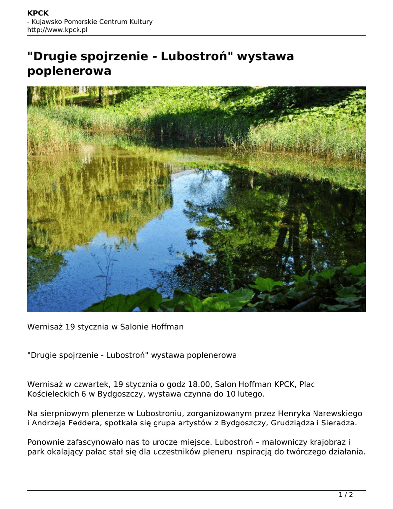KPCK - Kujawsko Pomorskie Centrum Kultury http://www.kpck.pl "Drugie spojrzenie - Lubostroń" wystawa poplenerowa Wernisaż 19 stycznia w Salonie Hoffman "Drugie spojrzenie - Lubostroń" wystawa poplenerowa Wernisaż w czwartek, 19 stycznia o godz 18.00, Salon Hoffman KPCK, Plac Kościeleckich 6 w Bydgoszczy, wystawa czynna do 10 lutego. Na sierpniowym plenerze w Lubostroniu, zorganizowanym przez Henryka Narewskiego i Andrzeja Feddera, spotkała się grupa artystów z Bydgoszczy, Grudziądza i Sieradza. Ponownie zafascynowało nas to urocze miejsce. Lubostroń – malowniczy krajobraz i park okalający pałac stał się dla uczestników pleneru inspiracją do twórczego działania. 1/2 KPCK - Kujawsko Pomorskie Centrum Kultury http://www.kpck.pl To bogactwo otoczenia wyzwoliło w nas nowy potencjał, w którym obraz malarski i fotografia stały się wyznacznikiem naszej interpretacji. Autorzy prac: Bydgoszcz reprezentują: Andrzej Fedder, Zbigniew Jastrowski, Justyna Jułga, Krzysztof Kacprzak, Andrzej Makowski, Ewa Miller i Grzegorz Pleszyński. Z Grudziądza: Izabela Fijałkowska, Marlena Kminikowska-Grzesiak, Cezary Kopik, Remigiusz Ratajczak, Joanna Zasada oraz Cezary Zbrojewski z Sieradza. 2/2 Powered by TCPDF (www.tcpdf.org)