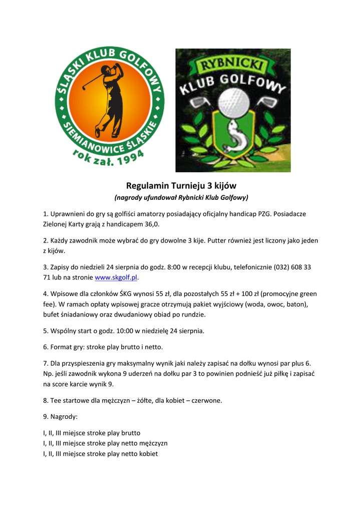 Regulamin Turnieju 3 kijów (nagrody ufundował Rybnicki Klub Golfowy) 1. Uprawnieni do gry są golfiści amatorzy posiadający oficjalny handicap PZG. Posiadacze Zielonej Karty grają z handicapem 36,0. 2. Każdy zawodnik może wybrać do gry dowolne 3 kije. Putter również jest liczony jako jeden z kijów. 3. Zapisy do niedzieli 24 sierpnia do godz. 8:00 w recepcji klubu, telefonicznie (032) 608 33 71 lub na stronie www.skgolf.pl. 4. Wpisowe dla członków ŚKG wynosi 55 zł, dla pozostałych 55 zł + 100 zł (promocyjne green fee). W ramach opłaty wpisowej gracze otrzymują pakiet wyjściowy (woda, owoc, baton), bufet śniadaniowy oraz dwudaniowy obiad po rundzie. 5. Wspólny start o godz. 10:00 w niedzielę 24 sierpnia. 6. Format gry: stroke play brutto i netto. 7. Dla przyspieszenia gry maksymalny wynik jaki należy zapisać na dołku wynosi par plus 6. Np. jeśli zawodnik wykona 9 uderzeń na dołku par 3 to powinien podnieść już piłkę i zapisać na score karcie wynik 9. 8. Tee startowe dla mężczyzn – żółte, dla kobiet – czerwone. 9. Nagrody: I, II, III miejsce stroke play brutto I, II, III miejsce stroke play netto mężczyzn I, II, III miejsce stroke play netto kobiet Longest drive Nearest the pin 10. Zdobywcy nagród brutto nie biorą udziału w podziale nagród netto. 11. W razie remisu o kolejności miejsc w klasyfikacji brutto będzie decydował wyższy HCP gry zawodnika, w klasyfikacji netto – niższy HCP gry zawodnika. W razie braku rozstrzygnięcia (w brutto i netto) decyduje metoda „count back”, tzn. lepszy wynik na dołkach 10-18, 13-18, 16-18 i ostatecznie na ostatnim dołku.