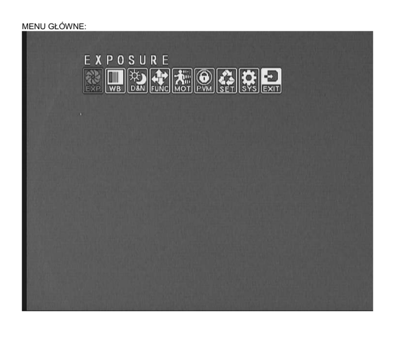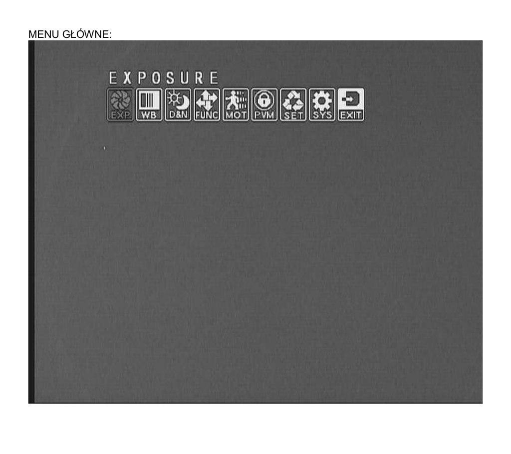 MENU GŁÓWNE: Ustawienia ekspozycji: USTAWIENIA OBIEKTYWU USTAWIENIA DLA OBIEKTYWU ZE STERWOANIEM PRZYSŁONY (DC) USTAWIENIA KOMPENSACJI ŚWIATŁA WSTECZNEGO (BLC) USTAWIENIA KOMPENSACJI ŚWIATŁA WSTECZNEGO (BLC) USTAWIENIA KOMPENSACJI ŚWIATŁA WSTECZNEGO (HLI) USTAWIENIA KOMPENSACJI ŚWIATŁA WSTECZNEGO (HBLC) USTAWIENIA STREF KOMPENSACJI ŚWIATŁA WSTECZNEGO (HBLC) USTAWIENIA SENSE-UP (MAX. x512) USTAWIENIA BALANSU BIELI USTAWIENIA TRYBU DZIEŃ/NOC FUNKCJE SPECJALNE KAMERY USTAWIENIA DETEKCJI RUCHU USTAWIENIA STREF PRYWATNOŚCI (MAKS. 8) USTAWIENIA JĘZYKA OSD USTAWIENIA DOMYŚLNE, ZAPIS USTAWIEŃ, WYJŚCIE Z MENU