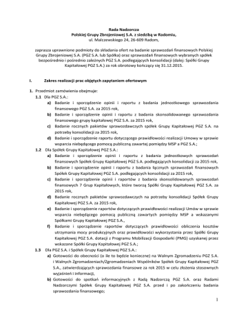 Rada Nadzorcza Polskiej Grupy Zbrojeniowej S.A. z siedzibą w Radomiu, ul. Malczewskiego 24, 26-609 Radom, zaprasza uprawnione podmioty do składania ofert na badanie sprawozdań finansowych Polskiej Grupy Zbrojeniowej S.A. (PGZ S.A. lub Spółka) oraz sprawozdań finansowych wybranych spółek bezpośrednio i pośrednio zależnych PGZ S.A. podlegających konsolidacji (dalej: Spółki Grupy Kapitałowej PGZ S.A.) za rok obrotowy kończący się 31.12.2015. I. Zakres realizacji prac objętych zapytaniem ofertowym 1. Przedmiot zamówienia obejmuje: 1.1 Dla PGZ S.A.: a) Badanie i sporządzenie opinii i raportu z badania jednostkowego sprawozdania finansowego PGZ S.A. za 2015 rok, b) Badanie i sporządzenie opinii i raportu z badania skonsolidowanego sprawozdania finansowego grupy kapitałowej PGZ S.A. za 2015 rok, c) Badanie rocznych pakietów sprawozdawczych spółek Grupy Kapitałowej PGZ S.A. na potrzeby konsolidacji za 2015 rok, d) Badanie i sporządzenie raportu dotyczącego prawidłowości realizacji Umowy w sprawie wsparcia niebędącego pomocą publiczną zawartej pomiędzy MSP a PGZ S.A.; 1.2 Dla Spółek Grupy Kapitałowej PGZ S.A.: a) Badanie i sporządzenie opinii i raportu z badania jednostkowych sprawozdań finansowych Spółek Grupy Kapitałowej PGZ S.A. podlegających konsolidacji za 2015 rok, b) Badanie i sporządzenie opinii i raportu z badania łącznych sprawozdań finansowych Spółek Grupy Kapitałowej PGZ S.A. podlegających konsolidacji za 2015 rok, c) Badanie i sporządzenie opinii i raportów z badania skonsolidowanych sprawozdań finansowych 7 Grup Kapitałowych, które tworzą Spółki Grupy Kapitałowej PGZ S.A. za 2015 rok, d) Badanie rocznych pakietów sprawozdawczych na potrzeby konsolidacji Spółek Grupy Kapitałowej PGZ S.A. za 2015 rok, e) Badanie i sporządzenie raportów dotyczących prawidłowości realizacji Umów w sprawie wsparcia niebędącego pomocą publiczną zawartych pomiędzy MSP a wskazanymi Spółkami Grupy Kapitałowej PGZ S.A., f) Badanie i sporządzenie raportów dotyczących prawidłowości obliczenia kosztów utrzymania mocy produkcyjnych oraz prawidłowości wykorzystania przez Spółki Grupy Kapitałowej PGZ S.A. dotacji z Programu Mobilizacji Gospodarki (PMG) uzyskanej przez wskazane Spółki Grupy Kapitałowej PGZ S.A.; 1.3 Dla PGZ S.A. i Spółek Grupy Kapitałowej PGZ S.A.: a) Gotowości do obecności (o ile to będzie konieczne) na Walnym Zgromadzeniu PGZ S.A. i Walnych Zgromadzeniach/Zgromadzeniach Wspólników Spółek Grupy Kapitałowej PGZ S.A., zatwierdzających sprawozdania finansowe za rok 2015 w celu złożenia stosownych wyjaśnień i informacji, b) Gotowości do spotkań informacyjnych z Radą Nadzorczą PGZ S.A. oraz Radami Nadzorczymi Spółek Grupy Kapitałowej PGZ S.A. przed i po zakończeniu badania sprawozdania finansowego; 1 1.4 Lista Spółek Grupy Kapitałowej PGZ S.A., wraz ze wskazaniem spółek, które sporządzają łączne sprawozdania finansowe, które utworzyły grupy kapitałowe, podlegające badaniu i które otrzymały dotację PMG oraz które zawarły Umowy w sprawie wsparcia niebędącego pomocą publiczną z MSP znajduje się w pkt IX Ogłoszenia; 2. Oferent ma prawo zgłaszać dodatkowe pytania dotyczące niniejszego postępowania ofertowego. Pytania można kierować w formie pisemnej (e-mail) na adres [email protected] nie później niż do dnia 23 września 2015 roku. Odpowiedzi zostaną przesłane do Oferenta niezwłocznie. II. 1. 2. 3. 4. 5. 6. III. Termin realizacji prac objętych zapytaniem ofertowym Rozpoczęcie badania wstępnego w PGZ S.A. oraz Spółkach Grupy Kapitałowej PGZ S.A. – do dnia 30 listopada 2015 roku; Sporządzenie opinii i raportów do jednostkowych sprawozdań finansowych PGZ S.A. i Spółek Grupy Kapitałowej PGZ S.A. – do dnia 15 marca 2015 roku; Sporządzenie opinii i raportów do skonsolidowanych sprawozdań finansowych Spółek Grupy Kapitałowej PGZ S.A. tworzących własne grupy kapitałowe – do dnia 30 kwietnia 2015 roku; Sporządzenie opinii i raportu do skonsolidowanego sprawozdania finansowego Grupy Kapitałowej PGZ S.A. – do dnia 30 maja 2015 roku; Sporządzenie raportu dotyczącego prawidłowości obliczenia kosztów utrzymania mocy produkcyjnych oraz prawidłowości wykorzystania przez wskazane Spółki Grupy Kapitałowej PGZ S.A. dotacji Programu Mobilizacji Gospodarki (PMG) uzyskanej przez te Spółki Grupy Kapitałowej PGZ S.A. – do dnia 5 lutego 2015 roku; Sporządzenia raportu dotyczącego prawidłowości realizacji Umów w sprawie wsparcia niebędącego pomocą publiczną zawartych pomiędzy MSP a PGZ S.A. oraz wskazanymi Spółkami Grupy Kapitałowej PGZ S.A. – do dnia 15 lutego 2015 roku. Warunki płatności 1. Płatność za czynności wskazane w pkt I Ogłoszenia nastąpi w II ratach: 1.1 10% w terminie 21 dni od dnia zawarcia umów; 1.2 90% w terminie 14 dni od daty wykonania umów; 2. Płatności za usługi audytu dokona: 2.1 PGZ S.A. – w odniesieniu do przedmiotu zamówienia, o którym mowa w pkt I 1.1; 2.2 Poszczególne Spółki Grupy Kapitałowej PGZ S.A., które podpiszą umowy z audytorem, w odniesieniu do przedmiotu zamówienia, o którym mowa w pkt I 1.2. IV. Wymogi dotyczące Oferty 1. Elementy Oferty - Zasady ogólne 1.1. Oferta winna zawierać cały Przedmiot Zamówienia, określony w pkt I 1; 1.2. W ramach Oferty należy wyodrębnić Oferty dla PGZ S.A. oraz dla każdej ze Spółek Grupy Kapitałowej PGZ S.A., wskazanej w pkt IX Ogłoszenia; 1.3. Oferent może przedstawić tylko jedną Ofertę. Nie dopuszcza się Ofert częściowych, zarówno jeśli chodzi o przedmiot zamówienia, jak i zakres podmiotowy. Spółka nie dopuszcza możliwości składania Ofert przez konsorcjum podmiotów; 1.4. Oferta powinna być sporządzona w języku polskim, winna być podpisana przez osobę uprawnioną do reprezentacji Oferenta bądź upoważnionego przedstawiciela Oferenta; 2 1.5. Wszystkie strony załączników do Oferty stanowiących 