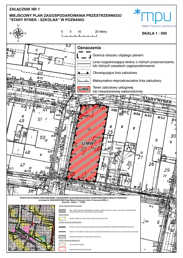 ZAŁĄCZNIK NR 1 MIEJSCOWY PLAN ZAGOSPODAROWANIA PRZESTRZENNEGO "STARY RYNEK - SZKOLNA" W POZNANIU µ 0 5 10 20 Metry SKALA 1 : 500 Oznaczenia Granica obszaru objętego planem Linia rozgraniczająca tereny o różnym przeznanczeniu lub różnych zasadach zagospodarowania U/MW # * Obowiązująca linia zabudowy Maksymalna nieprzekraczalna linia zabudowy Teren zabudowy usługowej lub mieszkaniowej wielorodzinnej # * @ # * # * # * # * # * # * # * @ # * # * ul. Sz k U/MW @ # * # * olna # * # * # * # * # * # * # * ewskieg o # * ul. Pade r @ @ # * # * # * # * # * # * # * ul. Koz i a WYRYS ZE STUDIUM UWARUNKOWAŃ I KIERUNKÓW ZAGOSPODAROWANIA PRZESTRZENNEGO MIASTA POZNANIA (uchwała Nr XXXI/299/V/2008 Rady Miasta Poznania z dnia 18 stycznia 2008 r.) Kierunki - Skala 1 : 15 000 TERENY PRZEZNACZONE POD ZABUDOWĘ UMsw - TERENY ZABUDOWY ŚRÓDMIEJSKIEJ, ZWARTEJ, ŚREDNIOWYSOKIEJ O FUNKCJI: USŁUGOWEJ, CENTROTWÓRCZEJ I OGÓLNOMIEJSKIEJ ORAZ MIESZKANIOWEJ WIELORODZINNEJ FORMY OCHRONY OBSZARY CENNE KULTUROWO OBJĘTE FORMĄ OCHRONY ZABYTKÓW ELEMENTY STRUKTURY PRZESTRZENNEJ PIERZEJE CIĄGÓW WYZNACZAJĄCE MINIMALNE GRANICE NAJWAŻNIEJSZYCH OBSZARÓW PRZESTRZENI PUBLICZNYCH A UMsw ORIENTACYJNY PRZEBIEG CIĄGÓW PIESZYCH ORAZ GRANIC PRZESTRZENI PUBLICZNYCH M. IN. PROJEKTOWANYCH RYNKÓW kt. 06 .1 kZs OBSZAR NAJWAŻNIEJSZYCH PRZESTRZENI PUBLICZNYCH A ZP . 06 A ZP .06 kZs.1.24 TERENY WYMAGAJĄCE REHABILITACJI ! ! ! ! ! ! ! ! ! ! ! ! ! ! ! ! ! ! ! ! ! ! ! ! ! ! ! ! ! ! ! ! ! ! ! ! ! ! ! ! ! ! ! ! ! HISTORYCZNYCH DZIELNIC GRANICA OBSZARU OBJĘTEGO PLANEM STARY RY NEK