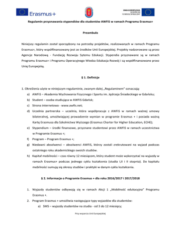 Regulamin przyznawania stypendiów dla studentów AWFiS w ramach Programu Erasmus+ Preambuła Niniejszy regulamin został sporządzony na potrzeby projektów, realizowanych w ramach Programu Erasmus+, który współfinansowany jest ze środków Unii Europejskiej. Projekty nadzorowane są przez Agencje Narodową - Fundację Rozwoju Sytemu Edukacji. Stypendia przyznawane są w ramach Programu Erasmus+ i Programu Operacyjnego Wiedza Edukacja Rozwój i są współfinansowane przez Unię Europejską. § 1. Definicje 1. Określenia użyte w niniejszym regulaminie, zwanym dalej „Regulaminem” oznaczają: a) AWFiS – Akademia Wychowania Fizycznego i Sportu im. Jędrzeja Śniadeckiego w Gdaosku; b) Student – osoba studiująca w AWFiS Gdaosk; c) Strona internetowa - www.awfis.net; d) Uczelnia partnerska – uczelnia, która współpracuje z AWFiS w ramach ważnej umowy bilateralnej, umożlwiającej prowadzenie wymian w programie Erasmus + i posiada ważną Kartę Erasmusa dla Szkolnictwa Wyższego (Erasmus Charter for Higher Education, ECHE); e) Stypendium – środki finansowe, przyznane studentowi przez AWFiS w ramach uczestnictwa w Programie Erasmus +; f) Program – Program Erasmus +; g) Niedawni absolwenci – absolwenci AWFiS, którzy zostali zrekrutowani na wyjazd podczas ostatniego roku akademickiego swoich studiów. h) Kapitał mobilności – czas równy 12 miesiącom, który student może wykorzystad na wyjazdy w ramach Erasmus+ podczas jednego cyklu kształcenia (studia I,II i II stopnia). Do kapitału mobilności sumują się okresy studiów i praktyki w danym cyklu kształcenia. § 2. Informacje o Programie Erasmus + dla roku 2016/2017 i 2017/2018 1. Wyjazdy studentów odbywają się w ramach Akcji 1 „Mobilnośd edukacyjna” Programu Erasmus +. 2. Program Erasmus + umożliwia następujące typy wyjazdów dla studentów: a) SMS – wyjazdy studentów na studia - od 3 do 12 miesięcy; Przy wsparciu Unii Europejskiej b) SMP - wyjazdy studentów na staż (praktykę) – od 2 do 12 miesięcy; 3. Wyjazdy w ramach kategorii wymienionych w § 2 pkt. 2 możliwe są tylko między uczelniami partnerskimi i/lub instytucjami funkcjonującymi na terenie Unii Europejskiej. 4. Finansowanie wjazdów dla studentów AWFiS obejmuje okres 01.06.2015-31.05.2018, z zastrzeżeniem, że w pierwszej kolejności realizowane będą wyjazdy, których termin zakooczenia przypada na 31.05.2017. 5. Szczegółowe informacje o funkcjonowaniu Programu znajdują się w niniejszym Regulaminie jak i na stronie internetowej uczelni w zakładce „Uczelnia / Erasmus”. § 3. Kryteria rekrutacji 1. Studenci w ramach wyjazdów SMS i SMP muszą spełnid następujące kryteria: a) posiadad status studenta studiów dziennych lub zaocznych w AWFiS; b) byd zarejestrowanym na studiach prowadzących do uzyskania stopnia/dyplomu: licencjata, magistra lub doktora w AWFiS; c) mied ukooczony min. pierwszy rok studiów pierwszego stopnia i otrzymad promocję na drugi rok studiów w przypadku wyjazdów SMS (warunek ten nie ma zastosowania dla wyjazdów typu SMP); d) posiadad dobre wyniki w nauce i znad język obcy w stopniu umożliwiającym uczestnictwo w zajęciach na zagranicznej uczelni; 2. Wyjazdy typu SMS i SMP wspierane są podczas krótkiego cyklu kształcenia na poziomie studiów wyższych. Programy studiów/ staży (praktyk) powinny stanowid integralną częśd programu studiów. 3. W ramach Erasmus+ student ma do wykorzystania „Kapitał mobilności” równy 12 miesiącom w ramach każdego cyklu kształcenia. 4. Niedawni absolwenci AWFiS mają możliwośd ubiegania się o wyjazdy typu SMP. Absolwenci muszą zostad zrekrutowani w czasie trwania ostatniego roku studiów oraz odbyd i ukooczyd praktykę (staż) w ciągu jednego roku po zakooczeniu studiów. 5. Wyjazd w ramach Programu Erasmus + typu SMS może odbywad się na ostatnim semestrze studiów jeśli student uzyska zgodę właściwego Prodziekana. 6. Wyjazd na studia Erasmus+ i praktykę (staż) nie może nastąpid w tym samym czasie (wyjazdy są możliwe w tym samym roku akademickim, ale nie w tym samym okresie). Przy wsparciu Unii Europejskiej 7. Student zakwalifikowany na stypendium musi byd w momencie wyjazdu studentem co najmniej drugiego roku studiów i nie może przebywad w trakcie stypendium na urlopie dziekaoskim, ani byd urlopowany. 8. Student przebywający na urlopie (w tym na urlopie dziekaoskim) ma prawo przystąpid do rekrutacji w ramach programu Erasmus +, o ile wyjazd będzie realizowany już podczas studiów (po powrocie z urlopu). 9. Uczestnictwo w rekrutacji na wyjazd typu SMS nie wyklucza z uczestnictwa w rekrutacji na wyjazd typu SMP. §4. Procedura rekrutacji (SMS) 1. Student zainteresowany uzyskaniem stypendium składa w Biurze Programu Erasmus następujące dokumenty: a) formularz zgłoszenia na wyjazd SMS w ramach Programu (Załącznik nr 1 - Formularz zgłoszeniowy SMS); b) dokument potwierdzający znajomośd języka obcego (jeśli student posiada); c) zaświadczenie o wysokości średniej ocen ze studiów uzyskanej w semestrze poprzedzającym semestr rekrutacji; d) opinia jednego z pracowników naukowo-dydaktycznych AWFiS na temat działalności naukowej studenta; e) dokument potwierdzający osiągnięcia studenta na polu akademickim (działalnośd w RSS, działalnośd w innych organizacjach studenckich, itp.). 2. Na etapie rekrutacji student ma obowiązek wskazad uczelnię i wydział tej uczelni, na którym chciałby realizowad studia. 3. Informacje nt uczelni, które student może wskazad znajdują się na stronie www http://www.awf.gda.pl/. 4. Dokumenty rekrutacyjne należy złożyd do dnia zakooczenia rekrutacji, której termin zostanie ogłoszony na stronie internetowej. 5. Po zakooczeniu procesu rekrutacji dokumentacja złożona przez studentów jest poddawana ocenie przez komisję kwalifikacyjną powołaną przez Rektora. 6. Prace komisji przebiegają w dwóch etapach – etap pierwszy obejmuje wstępną kwalifikację na podsta