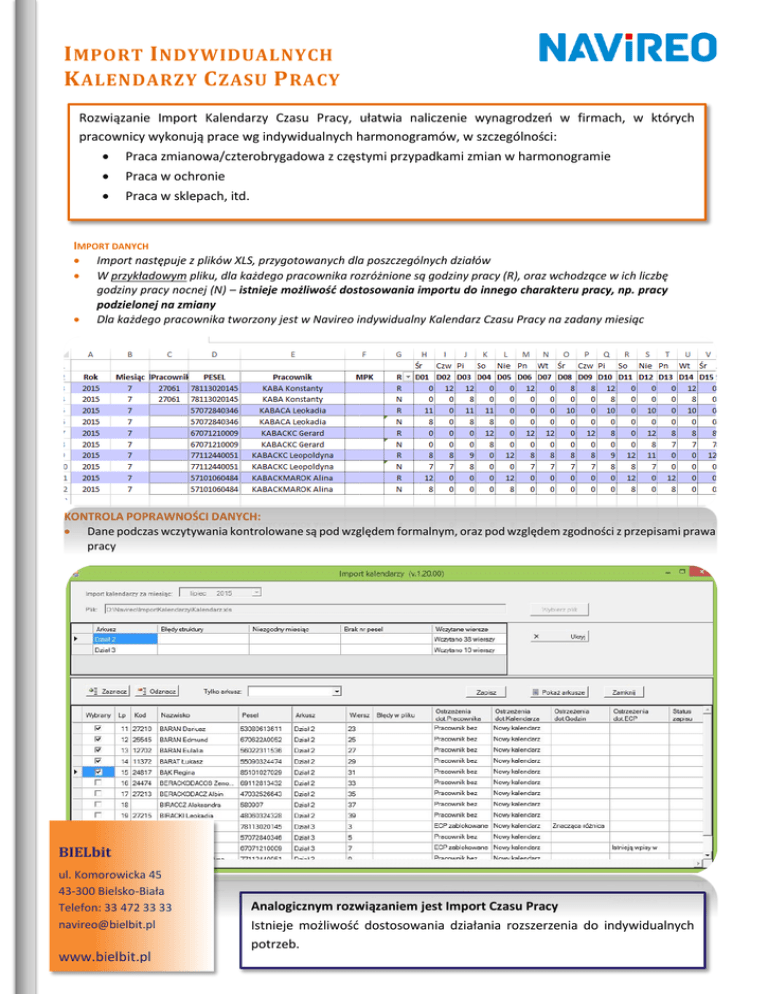 I MPORT I NDYWIDUALNYCH K ALENDARZY C ZASU P RACY Rozwiązanie Import Kalendarzy Czasu Pracy, ułatwia naliczenie wynagrodzeń w firmach, w których pracownicy wykonują prace wg indywidualnych harmonogramów, w szczególności: Praca zmianowa/czterobrygadowa z częstymi przypadkami zmian w harmonogramie Praca w ochronie Praca w sklepach, itd. IMPORT DANYCH Import następuje z plików XLS, przygotowanych dla poszczególnych działów W przykładowym pliku, dla każdego pracownika rozróżnione są godziny pracy (R), oraz wchodzące w ich liczbę godziny pracy nocnej (N) – istnieje możliwość dostosowania importu do innego charakteru pracy, np. pracy podzielonej na zmiany Dla każdego pracownika tworzony jest w Navireo indywidualny Kalendarz Czasu Pracy na zadany miesiąc KONTROLA POPRAWNOŚCI DANYCH: Dane podczas wczytywania kontrolowane są pod względem formalnym, oraz pod względem zgodności z przepisami prawa pracy BIELbit ul. Komorowicka 45 43-300 Bielsko-Biała Telefon: 33 472 33 33 [email protected] www.bielbit.pl Analogicznym rozwiązaniem jest Import Czasu Pracy Istnieje możliwość dostosowania działania rozszerzenia do indywidualnych potrzeb.