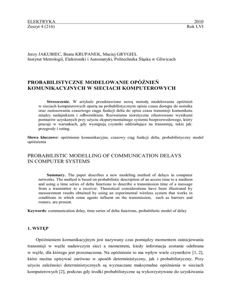 ELEKTRYKA Zeszyt 4 (216) 2010 Rok LVI Jerzy JAKUBIEC, Beata KRUPANEK, Maciej GRYGIEL Instytut Metrologii, Elektroniki i Automatyki, Politechnika Śląska w Gliwicach PROBABILISTYCZNE MODELOWANIE OPÓŹNIEŃ KOMUNIKACYJNYCH W SIECIACH KOMPUTEROWYCH Streszczenie. W artykule przedstawiono nową metodę modelowania opóźnień w sieciach komputerowych opartą na probabilistycznym opisie czasu dostępu do nośnika oraz zastosowaniu czasowego ciągu funkcji delta do opisu czasu transmisji komunikatu między nadajnikiem i odbiornikiem. Rozważania teoretyczne zilustrowano wynikami pomiarów uzyskanych przy użyciu eksperymentalnego systemu bezprzewodowego, który pracuje w warunkach, gdy występują czynniki oddziałujące na transmisję, takie jak: przegrody i ruting. Słowa kluczowe: opóźnienie komunikacyjne, czasowy ciąg funkcji delta, probabilistyczny model opóźnienia PROBABILISTIC MODELLING OF COMMUNICATION DELAYS IN COMPUTER SYSTEMS Summary. The paper describes a new modeling method of delays in computer networks. The method is based on probabilistic description of an access time to a medium and using a time series of delta functions to describe a transmission time of a message from a transmitter to a receiver. Theoretical considerations have been illustrated by measurement results obtained by using an experimental wireless system that works in conditions in which some agents influent on the transmission, such as barriers and routers, are present. Keywords: communication delay, time series of delta functions, probabilistic model of delay 1. WSTĘP Opóźnieniem komunikacyjnym jest nazywany czas pomiędzy momentem zainicjowania transmisji w węźle nadawczym sieci a momentem, kiedy informacja zostanie odebrana w węźle, dla którego jest przeznaczona. Na opóźnienie to ma wpływ wiele czynników [1, 2], które można opisywać zarówno w sposób deterministyczny, jak i probabilistyczny. Przy użyciu zależności deterministycznych są wyznaczane maksymalne opóźnienia w sieciach komputerowych [2], podczas gdy środki probabilistyczne są wykorzystywane do uzyskiwania 80 J. Jakubiec, B. Krupanek, M. Grygiel rozkładów opóźnień powstających na skutek czynników opisywanych losowo [3]. Tego rodzaju opis jest naturalną konsekwencją faktu, że decyzje użytkowników sieci o nawiązywaniu komunikacji są podejmowane w sposób przypadkowy. Ponadto, probabilistyczny opis opóźnień dostarcza pełnej informacji o ich właściwościach [3], a zatem wykorzystanie go do analizy właściwości sieci może być znacznie szersze niż opisu deterministycznego. W niniejszej pracy jest rozpatrywany najprostszy przypadek, kiedy dwa węzły A i B sieci komputerowej komunikują się ze sobą bez pośrednictwa jakichkolwiek urządzeń. Sytuację taką pokazano schematycznie na rysunku 1. A AB A B Rys. 1. Źródła opóźnień przy transmisji z węzła A do B, τA – czas uzyskania dostępu do nośnika, τAB – czas przesłania komunikatu Fig. 1. Sources of delays during transmission from node A to B, τA – time necessary to obtain an access to medium, τAB – time of a message transmission Oznaczmy symbolem τA czas potrzebny na uzyskanie dostępu do nośnika (medium komunikacyjnego), a jako τAB czas wymagany na przesłanie komunikatu z węzła A do B. Przyjmijmy, że transmisja jest inicjowana w chwili oznaczonej jako t0, a rozpoczęcie nadawania komunikatu do sieci następuje w chwili tA. W takim przypadku opóźnienie transmisji związane z dostępem do medium wynosi: A t A t0 . (1) Opóźnienie τB w przesyłaniu komunikatu z węzła A do węzła B jest różnicą między momentem tB zakończenia transmisji w węźle B a momentem jej inicjacji t0. Opóźnienie to, gdy uwzględni się zależność (1), wynosi: B t B t 0 AB t A t 0 A AB , (2) czyli jest sumą dwóch opóźnień cząstkowych, z których τA jest związane z dostępem do nośnika, a τAB z czasem przesyłania komunikatu. 2. ZASTOSOWANIE LOSOWEGO SZEREGU FUNKCYJNEGO DO OPISU OPÓŹNIEŃ KOMUNIKACYJNYCH Do probabilistycznego opisu składników wyrażenia (2) najdogodniej jest użyć funkcji gęstości prawdopodobieństwa. Biorąc pod uwagę, że opóźnienie nie może przyjmować wartości ujemnych, funkcję gęstości prawdopodobieństwa opóźnienia τA dostępu węzła A do medium transmisyjnego można opisać zależnością: Probabilistyczne modelowanie opóźnień… 81 dla A1 A A2 , gdzie A1 0 g A A , gA A dla innych 0 (3) przy czym gA(τA) jest funkcją ciągłą i ograniczoną, która spełnia warunek normalizujący: A2 g d A A A g A A d A 1 . (4) A1 Załóżmy, że funkcja gęstości prawdopodobieństwa gτAB(τAB), opisująca rozkład opóźnień spowodowanych transmisją przez medium, jest dana szeregiem o następującej postaci: g AB AB a 0 AB 0 a1 AB 1 a k AB k , (5) gdzie δ jest symbolem funkcji delta Dirac’a [4] definiowanej jako: AB i 0 AB i , i 0,1, , k AB i dla dla , (6) przy czym, gdy weźmie się pod uwagę właściwości funkcji delta, zachodzi: AB i d AB 1 , (7) gdzie i jest numerem chwili, a liczba wyrazów szeregu (5) jest ograniczona i wynosi k + 1. Współczynniki a0, a1, ..., ak ciągu (5) mają stałe i nieujemne wartości. Funkcja gAB(τAB) musi także spełniać warunek normalizujący, co oznacza, że: g d AB AB AB 1. (8) Po wprowadzeniu równania (5) do zależności (8) z uwzględnieniem wyrażenia (7) otrzymuje się: a 0 AB 0 a1 AB 1 a k AB k d AB a0 AB 0 d AB a1 AB 1 d AB a k AB k d AB (9) a 0 a1 a k 1. Zależność (5) jest efektem analizy zjawisk zachodzących podczas przesyłania komunikatu przez kanał transmisyjny, które jest realizowane, przy założeniu że w przypadku niepoprawnej transmisji jest ona powtarzana, a maksymalna liczba powtórzeń wynosi k. Ogólnie można powiedzieć, że poszczególne wyrazy szeregu (5) opisują powtórzenia 82 J. Jakubiec, B. Krupanek, M. Grygiel transmisji, przy czym czas τi wskazuje chwilę i-tego powtórzenia transmisji, i = 1, …, k, a wspó