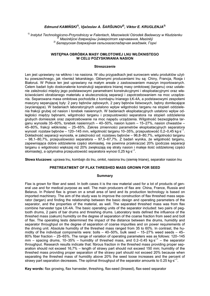 Edmund KAMIŃSKI , Vjačeslav A. ŠARŠUNOV , Viktor E. KRUGLENJA 1) 1) 2) 3) Instytut Technologiczno-Przyrodniczy w Falentach, Mazowiecki Ośrodek Badawczy w Kłudzienku 2) Магiлёўскі дзяржаўны ўніверсітэт харчавання, Магілёў 3) Беларуская дзяржаўная сельскагаспадарчая акадэмія, Горкі WSTĘPNA OBRÓBKA MASY OMŁOTOWEJ LNU WŁÓKNISTEGO W CELU POZYSKIWANIA NASION Streszczenie Len jest uprawiany na włókno i na nasiona. W obu przypadkach jest surowcem wielu produktów użytku powszechnego, jak również lekarskiego. Głównymi producentami lnu są: Chiny, Francja, Rosja i Białoruś. W Polsce len jest uprawiany na małym areale z zastosowaniem maszyn importowanych. Celem badań było doskonalenie konstrukcji separatora lnianej masy omłotowej (targanu) oraz ustalenie zależności między jego podstawowymi parametrami konstrukcyjnymi i eksploatacyjnymi oraz właściwościami obrabianego materiału a skutecznością separacji i zapotrzebowaniem na moc urządzenia. Separowana masa omłotowa pochodziła z kombajnu lnianego ŁK-4A, a podstawowymi zespołami maszyny separującej były: 2 pary bębnów zębowych, 2 pary bębnów listwowych, bębny domłacające (wycierające). W badaniach laboratoryjnych ustalono wpływ wilgotności targanu na stopień oddzielenia frakcji grubej od nasion i torebek nasiennych. W badaniach eksploatacyjnych ustalono wpływ odległości między bębnami, wilgotności targanu i przepustowości separatora na stopień oddzielenia grubych domieszek oraz zapotrzebowanie na moc napędu urządzenia. Wilgotność bezwzględna targanu wynosiła 35–60%, torebek nasiennych – 40–50%, nasion luzem – 15–27%, nasion chwastów – 45–80%, frakcji włóknistej – 25–65%. Zakres zmienności parametrów eksploatacyjnych separatora –1 wynosił: rozstaw bębnów – 120–145 mm, wilgotność targanu 10–35%, przepustowość 0,2–0,45 kg∙s . Dokładność separacji wynosiła, w zależności od: rozstawu bębnów – 96,8–80,7%, wilgotności targanu – 98,1–80,7%, przepustowości separatora – 97,5–67,7%. Z badań wynika, że wilgotność targanu, zapewniająca dobre oddzielenie części słomiastej, nie powinna przekraczać 20% (podczas separacji targanu o wilgotności większej niż 20% zwiększają się straty nasion i maleje ilość oddzielonej części –1 słomiastej), a optymalna przepustowość separatora wynosi 0,25 kg∙s . Słowa kluczowe: uprawa lnu, kombajn do lnu, omłot, nasiona lnu (siemię lniane), separator nasion lnu PRETREATMENT OF FLAX THRESHED MASS GROWN FOR SEED Summary Flax is grown for fiber and seed. In both cases it is the raw material used for a lot of products of general use and for medical purpose as well. The main producers of flax are: China, France, Russia and Belarus. In Poland flax is grown on a small area of land and its production technology is based on imported machinery. The aim of the study was to improve the construction of flax threshed mass separator (targan) and finding the relationship between the basic design and operating parameters of the separator, and the properties of the material, as well. The separated threshed mass was from flax combine harvester type ŁK-4A. The basic operating units of the separator included: two pairs of pegtooth drums, 2 pairs of bar drums and threshing drums. Laboratory tests defined the influence of the threshed mass (oakum) humidity on the degree of separation of the coarse fraction from seed and boll of flax. The operating tests determined the impact of the distance between the drums, humidity and separator throughput on the degree of separation of coarse impurities and on power requirements of the driving unit. Absolute humidity of the threshed mass ranged from 35 to 60%. In contrast, the humidity of the individual components were: bolls – 40–50%, bulk seed – 15–27% weed seeds – 45– 80% fiber fraction – 25–65%. The range of variation of operating parameters was as follows: 120–145 ─1 mm – spacing drums, 10–35% – humidity of threshed mass, and 0.2–0.45 kg∙s – the separator throughput. Research results indicate that: fibrous fraction in the threshed mass providing proper separation should not exceed 16,7% – length of strawy part should not exceed 150 mm; humidity of the threshed mass providing proper separation of the strawy part should not exceed 20% because when separating the threshed mass of humidity above 20% the seed loose increases and the percent of ─1 strawy part separation decreases. The optimal throughput of the separator amounts to 0.25 kg∙s . Key words: flax growing, flax harvester, threshing, flax-seed (linseed), flax-seed separator