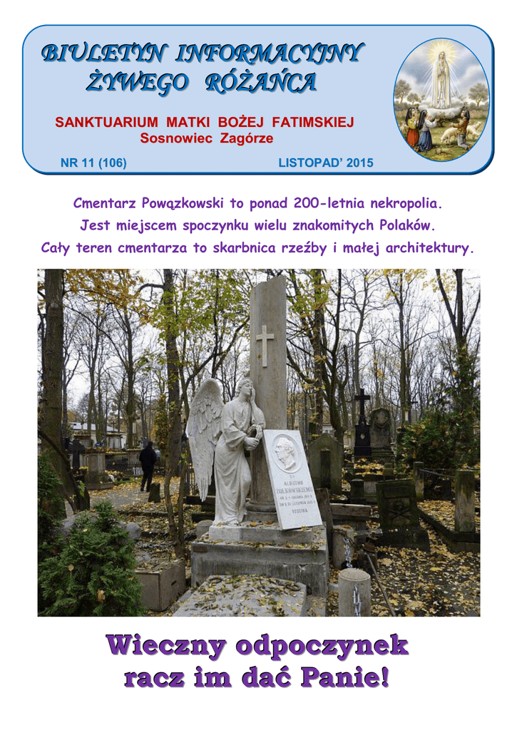 BIULETYN INFORMACYJNY ŻYWEGO RÓŻAŃCA SANKTUARIUM MATKI BOŻEJ FATIMSKIEJ Sosnowiec Zagórze NR 11 (106) LISTOPAD’ 2015 Cmentarz Powązkowski to ponad 200-letnia nekropolia. Jest miejscem spoczynku wielu znakomitych Polaków. Cały teren cmentarza to skarbnica rzeźby i małej architektury. Wieczny odpoczynek racz im dać Panie! P PA AP PIIE ES SK KIIE E IIN NT TE EN NC CJ JE E A APPO OS ST TO OLLS ST TW WA A M MO OD DLLIIT TW WY Y OGÓLNA Abyśmy umieli otworzyć się na osobiste spotkanie i dialog ze wszystkimi, nawet z tymi, którzy mają inne przekonania niż my. Tolerancja – to tak modne dzisiaj słowo. Szkoda, że często rozumiane jest jako zgoda na wszystko, nawet to, co jest wbrew jakimkolwiek zasadom moralnym. Każdy ma prawo mieć swoje przekonania i nie mogę nie podać ręki, nie odzywać się do kogoś, kto wyznaje inną religię, inny system wartości. Dialog z takimi osobami to świetna okazja, aby dawać świadectwo prawdzie. Tą prawdą jest Jezus Chrystus, jedyny Zbawiciel człowieka. ks. Szymon Mucha - „Różaniec” nr 11/2015 MISYJNA Aby pasterze Kościoła z głęboką miłością dla powierzonej im owczarni towarzyszyli jej w drodze i ożywiali jej nadzieję. Mamy wciąż przed oczyma ewangeliczny obraz Dobrego Pasterza, który zna swoje owce i gotów jest oddać za nie życie. Potrzeba wielkiej modlitwy za naszych pasterzy – za Ojca Świętego Franciszka, który o tę modlitwę prosi przy każdej niemal okazji, za naszych biskupów i kapłanów. Musimy im wyprosić wiarę silną i niezłomną, bo przecież na co dzień sami potrzebujemy ich wsparcia, podtrzymania na duchu, wskazania dobrej drogi. ks. Szymon Mucha - „Różaniec” nr 11/2015 IIN NT TE EN NC CJ JA A K KR RU UC CJ JA AT TY Y R RÓ ÓŻ ŻA AŃ ŃC CO OW WE EJ J zzaa O OJ JC CZ ZY YZ ZN NĘ Ę Z Maryją Królową Polski módlmy się o Polskę wierną Bogu, Krzyżowi i Ewangelii, o wypełnienie Jasnogórskich Ślubów Narodu. IIN NT TE EN NCCJ JE E PPA AR RA AFFIIA ALLN NE E Módlmy się: o dar nieba dla zmarłych kapłanów z naszej diecezji - w sposób szczególny dla śp. ks. Biskupa Adama ŚMIGIELSKIEGO, naszego pierwszego Ordynariusza oraz dla śp. ks. kan. Stanisława WYGANOWSKIEGO, który posługiwał w naszym Sanktuarium; o łaskę wiecznej szczęśliwości dla zmarłych członków z naszej wspólnoty Żywego Różańca : Zofii WIŚNIEWSKIEJ, Anieli PACEK, Władysławy MUSIALIK, Otylii WOŹNICZKO, Heleny TKACZYK, Anieli LOTKO, Heleny STAWOWSKIEJ, Marianny SIKORA, Ludwiki TABAKA, Czesławy KOSTUR, Stefani CISOWSKIEJ, Łucji KARWAT, Bronisława SZAFRAŃCA, Longiny STĘPIEŃ, Janiny SARWA, Henryki BULDAŃCZYK, Zofii JEDYNAK, Zofii GRZYBOWSKIEJ, Cecylii ŚMIESZALSKIEJ, Joanny WOŹNIAK, Władysławy RODAK, Marii GNATKIEWICZ, Alfredy ZĘBALA, Jana GILA, Janiny CHMIEL, Stanisławy DUDEK, Barbary GÓRSKIEJ, Janiny IZDEBSKIEJ, Teodozji CZELUŚNIAK, Teresy WITKO, Anieli STOLARCZYK, Marii LEŚNIAK, Zofii WĄSIEL, Janiny WOLSKIEJ, Wiesławy BONDASIEWICZ, Marii Gil; za dusze w czyśćcu cierpiące; o wieczny pokój i zbawienie dla poległych w obronie niepodległości naszej Ojczyzny; o łaskę zbawienia wiecznego dla naszych najbliższych - zmarłych rodziców, współmałżonków, rodzeństwa, dzieci i wszystkich krewnych; o Boże błogosławieństwo, opiekę Matki Bożej Fatimskiej, potrzebne łaski i dary Ducha Świętego dla ks. kan. Stanisława Łypa z racji Imienin; o Boże błogosławieństwo, dary Ducha Świętego i potrzebne łaski oraz opiekę Jasnogórskiej Pani dla diecezjalnych moderatorów Żywego Różańca, przeżywających w listopadzie rekolekcje na Jasnej Górze, w sposób szczególny w modlitwie polecajmy ks. kan. Andrzeja Stasiaka moderatora Żywego Różańca w naszej Diecezji; o dobre owoce prac synodalnych oraz o świętość naszych rodzin; o pomyślne rozwiązanie trudnych spraw rodzinnych; o uratowanie małżeństwa syna Marka przed rozpadem oraz by zdołał uświadomić sobie popełniane zło; o pomyślne rozwiązanie problemów w rodzinie; o Bożą pomoc oraz o cierpliwość w znoszeniu trudnych spraw rodzinnych; o rozwiązanie trudnych spraw w rodzinie Doroty i Romana; za tych młodych ludzi, którzy dopuszczają się czynów wandalizmu na terenie naszego Sanktuarium, by z pomocą łaski Bożej zrozumieli czynione zło, nawrócili się i zeszli ze złej drogi postępowania; o pomyślny przebieg dalszego leczenia, a w sposób szczególny o łaskę powrotu do zdrowia dla Zofii Bil; o potrzebne łaski i pełny powrót do zdrowia dla Wiesławy Augustyniak; o Boże błogosławieństwo, opiekę Matki Bożej Fatimskiej i łaskę zdrowia dla Kamila oraz o pomyślny przebieg ciąży dla Martyny; o Boże wspomożenie i łaskę pomyślnego wyleczenia trudnej choroby dla Beaty; o Boże błogosławieństwo i opiekę Matki Bożej Nieustającej Pomocy dla wnuczka Andrzeja; o Światło Ducha Świętego dla lekarzy w rozpoznaniu choroby, pomyślny przebieg leczenia i łaskę powrotu do zdrowia dla Anetki; o Bożą pomoc w przemianie serca dla syna i umocnienie więzi małżeńskiej; o szczęśliwy przebieg operacji dla Anny; o łaskę stabilizacji zdrowia dla Barbary; o potrzebne łaski i dobrych kolegów w szkole dla Piotrusia; o Boże błogosławieństwo, dary Ducha Świętego i zapał do nauki dla Kacpra i Wiktora; o pomyślny przebieg operacji dla dziesięcioletniej Kingi i łaskę powrotu do zdrowia; o Bożą interwencję oraz opiekę i wstawiennictwo Matki Bożej Fatimskiej w rozwiązaniu trudnych spraw rodzinnych, w sposób szczególny o łaskę poprawy zdrowia dla Eli; o pomyślny przebieg dalszego leczenia dla Basi; o wyleczenie z choroby alkoholizmu dla Romana; o łaskę zdrowia dla Anny Hoffman, a zwłaszcza dla jej wnuczków: Mateusza i Łukasza; o pomyślny przebieg rehabilitacji i łaskę powrotu do zdrowia po operacji dla Marii Boczar; o pomyślny przebieg nowej terapii w leczeniu trudnej choroby neurologicznej dla Zbigniewa; o pomyślny przebieg dalszego leczenia 