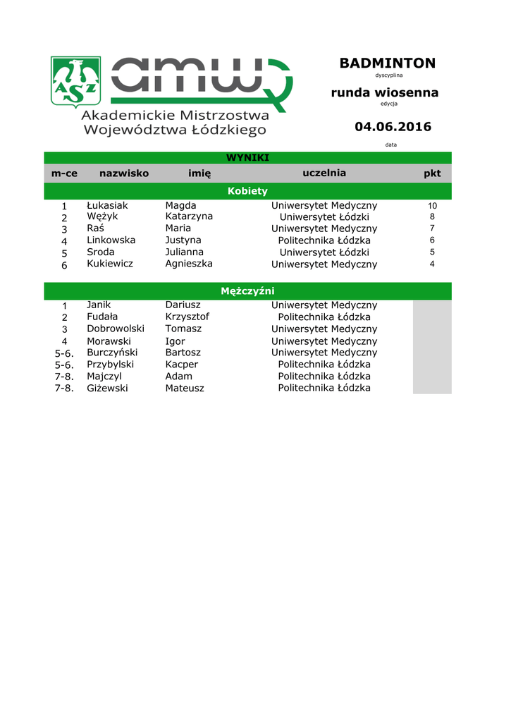 BADMINTON dyscyplina runda wiosenna edycja 04.06.2016 data WYNIKI m-ce nazwisko imię uczelnia pkt Uniwersytet Medyczny Uniwersytet Łódzki Uniwersytet Medyczny Politechnika Łódzka Uniwersytet Łódzki Uniwersytet Medyczny 10 8 7 6 5 4 Kobiety 1 2 3 4 5 6 1 2 3 4 5-6. 5-6. 7-8. 7-8. Łukasiak Wężyk Raś Linkowska Środa Kukiewicz Janik Fudała Dobrowolski Morawski Burczyński Przybylski Majczyl Giżewski Magda Katarzyna Maria Justyna Julianna Agnieszka Dariusz Krzysztof Tomasz Igor Bartosz Kacper Adam Mateusz Mężczyźni Uniwersytet Medyczny Politechnika Łódzka Uniwersytet Medyczny Uniwersytet Medyczny Uniwersytet Medyczny Politechnika Łódzka Politechnika Łódzka Politechnika Łódzka