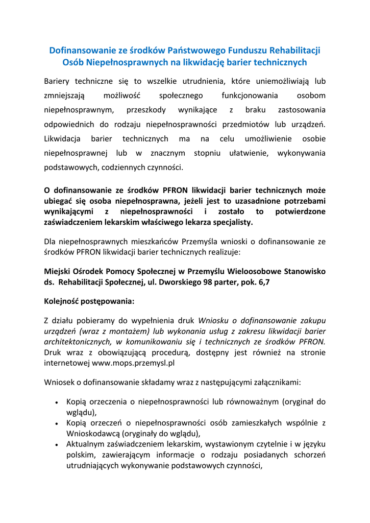 Dofinansowanie ze środków Państwowego Funduszu Rehabilitacji Osób Niepełnosprawnych na likwidację barier technicznych Bariery techniczne się to wszelkie utrudnienia, które uniemożliwiają lub zmniejszają możliwość niepełnosprawnym, społecznego przeszkody wynikające funkcjonowania z braku osobom zastosowania odpowiednich do rodzaju niepełnosprawności przedmiotów lub urządzeń. Likwidacja barier technicznych ma na celu umożliwienie osobie niepełnosprawnej lub w znacznym stopniu ułatwienie, wykonywania podstawowych, codziennych czynności. O dofinansowanie ze środków PFRON likwidacji barier technicznych może ubiegać się osoba niepełnosprawna, jeżeli jest to uzasadnione potrzebami wynikającymi z niepełnosprawności i zostało to potwierdzone zaświadczeniem lekarskim właściwego lekarza specjalisty. Dla niepełnosprawnych mieszkańców Przemyśla wnioski o dofinansowanie ze środków PFRON likwidacji barier technicznych realizuje: Miejski Ośrodek Pomocy Społecznej w Przemyślu Wieloosobowe Stanowisko ds. Rehabilitacji Społecznej, ul. Dworskiego 98 parter, pok. 6,7 Kolejność postępowania: Z działu pobieramy do wypełnienia druk Wniosku o dofinansowanie zakupu urządzeń (wraz z montażem) lub wykonania usług z zakresu likwidacji barier architektonicznych, w komunikowaniu się i technicznych ze środków PFRON. Druk wraz z obowiązującą procedurą, dostępny jest również na stronie internetowej www.mops.przemysl.pl Wniosek o dofinansowanie składamy wraz z następującymi załącznikami: Kopią orzeczenia o niepełnosprawności lub równoważnym (oryginał do wglądu), Kopią orzeczeń o niepełnosprawności osób zamieszkałych wspólnie z Wnioskodawcą (oryginały do wglądu), Aktualnym zaświadczeniem lekarskim, wystawionym czytelnie i w języku polskim, zawierającym informacje o rodzaju posiadanych schorzeń utrudniających wykonywanie podstawowych czynności, Dokumentami potwierdzającymi wysokość oświadczonych we wniosku dochodów Wnioskodawcy oraz osób pozostających we wspólnym gospodarstwie domowym osiągniętych w okresie trzech miesięcy poprzedzających złożenie wniosku, (nieobowiązkowo) Wstępną wycenę wnioskowanych urządzeń. W przypadku, gdy Wnioskodawca działa przez pełnomocnika lub opiekuna prawnego do wniosku należy załączyć odpowiednio uwierzytelnione pełnomocnictwo lub postanowienie Sądu o ustanowieniu opiekuna prawnego (do wniosku załączyć kserokopię – oryginał do wglądu). W przypadku negatywnego rozpatrzenia wniosku, Wnioskodawca otrzymuje pisemną informację wraz z uzasadnieniem, od której nie przysługuje odwołanie w rozumieniu kodeksu postępowania administracyjnego. Wysokość dofinansowania wynosi do 95% kosztów przedsięwzięcia, nie więcej jednak niż do wysokości piętnastokrotnego przeciętnego wynagrodzenia. Kwota przyznanego dofinansowania uzależniona jest od wysokości środków znajdujących się w dyspozycji MOPS oraz liczba osób i zasadność wniosku osoby ubiegającej się o dofinansowanie. Warunkiem przyznania dofinansowania jest posiadanie przez Wnioskodawcę udziału własnego w kwocie nie niższej niż 5% kosztów realizowanego przedsięwzięcia. Dofinansowanie nie może obejmować kosztów realizacji przedsięwzięcia poniesionych przed przyznaniem środków finansowych i zawarciem umowy o dofinansowanie ze środków PFRON. Przykładowy zakres rzeczowy dofinansowania: uchwyty, siedzisko wannowe, podnośnik wannowy, schodołaz, czasomierz, ciśnieniomierz, aparat do wykrywania przeszkód i innych urządzeń ułatwiających codzienne funkcjonowanie społeczne według uzasadnionych potrzeb osoby niepełnosprawnej. MOPS dokonuje kwalifikacji zakresu rzeczowego dofinansowania, oceniając indywidualne potrzeby osoby niepełnosprawnej wynikające z posiadanej niepełnosprawności oraz niezbędność planowanego przedsięwzięcia w procesie rehabilitacji społecznej. Z uwagi na charakter niepełnosprawności do dofinansowania likwidacji barier technicznych kwalifikowanie są głównie osoby z niepełnosprawnością motoryczną/ruchową osoby z dysfunkcją słuchu lub mowy oraz osoby z dysfunkcją wzroku. Podpowiedzi dobrych rozwiązań w zakresie likwidacji barier technicznych można znaleźć na stronie internetowej www.niepelnosprawni.pl Podstawa prawna Ustawa z dnia 27 sierpnia 1997 r. o rehabilitacji zawodowej i społecznej oraz zatrudnianiu osób niepełnosprawnych (tekst jednolity Dz.U. z 2011r. Nr 127 poz. 721), Rozporządzenie Ministra Pracy i Polityki Społecznej z dnia 25 czerwca 2002 r. w sprawie określenia rodzajów zadań powiatu, które mogą być finansowane ze środków Państwowego Funduszu Rehabilitacji Osób Niepełnosprawnych (tekst jednolity Dz.U. z 2013r., poz. 1190 z późn. zm.),