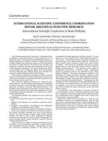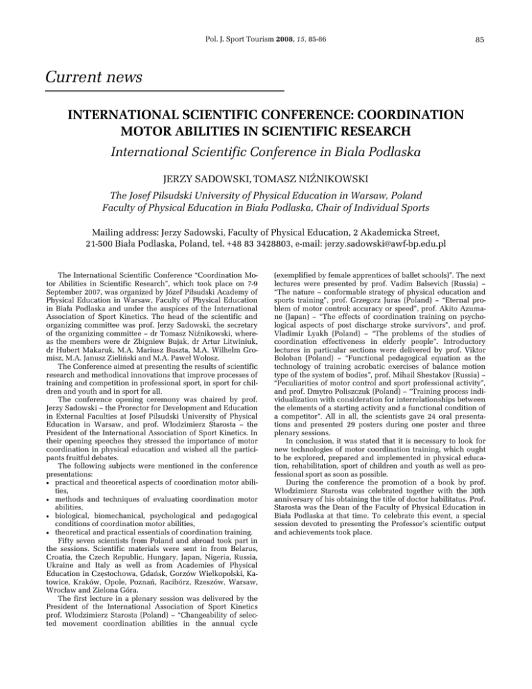 Pol. J. Sport Tourism 2008, 15, 85-86 85 Current news INTERNATIONAL SCIENTIFIC CONFERENCE: COORDINATION MOTOR ABILITIES IN SCIENTIFIC RESEARCH International Scientific Conference in Biala Podlaska JERZY SADOWSKI, TOMASZ NIŹNIKOWSKI The Josef Pilsudski University of Physical Education in Warsaw, Poland Faculty of Physical Education in Biała Podlaska, Chair of Individual Sports Mailing address: Jerzy Sadowski, Faculty of Physical Education, 2 Akademicka Street, 21-500 Biała Podlaska, Poland, tel. +48 83 3428803, e-mail: [email protected] The International Scientific Conference “Coordination Motor Abilities in Scientific Research”, which took place on 7-9 September 2007, was organized by Józef Piłsudski Academy of Physical Education in Warsaw, Faculty of Physical Education in Biała Podlaska and under the auspices of the International Association of Sport Kinetics. The head of the scientific and organizing committee was prof. Jerzy Sadowski, the secretary of the organizing committee – dr Tomasz Niźnikowski, whereas the members were dr Zbigniew Bujak, dr Artur Litwiniuk, dr Hubert Makaruk, M.A. Mariusz Buszta, M.A. Wilhelm Gromisz, M.A. Janusz Zieliński and M.A. Paweł Wołosz. The Conference aimed at presenting the results of scientific research and methodical innovations that improve processes of training and competition in professional sport, in sport for children and youth and in sport for all. The conference opening ceremony was chaired by prof. Jerzy Sadowski – the Prorector for Development and Education in External Faculties at Josef Pilsudski University of Physical Education in Warsaw, and prof. Włodzimierz Starosta – the President of the International Association of Sport Kinetics. In their opening speeches they stressed the importance of motor coordination in physical education and wished all the participants fruitful debates. The following subjects were mentioned in the conference presentations: • practical and theoretical aspects of coordination motor abilities, • methods and techniques of evaluating coordination motor abilities, • biological, biomechanical, psychological and pedagogical conditions of coordination motor abilities, • theoretical and practical essentials of coordination training. Fifty seven scientists from Poland and abroad took part in the sessions. Scientific materials were sent in from Belarus, Croatia, the Czech Republic, Hungary, Japan, Nigeria, Russia, Ukraine and Italy as well as from Academies of Physical Education in Częstochowa, Gdańsk, Gorzów Wielkopolski, Katowice, Kraków, Opole, Poznań, Racibórz, Rzeszów, Warsaw, Wrocław and Zielona Góra. The first lecture in a plenary session was delivered by the President of the International Association of Sport Kinetics prof. Włodzimierz Starosta (Poland) – “Changeability of selected movement coordination abilities in the annual cycle (exemplified by female apprentices of ballet schools)”. The next lectures were presented by prof. Vadim Balsevich (Russia) – “The nature – conformable strategy of physical education and sports training”, prof. Grzegorz Juras (Poland) – “Eternal problem of motor control: accuracy or speed”, prof. Akito Azumane (Japan) – “The effects of coordination training on psychological aspects of post discharge stroke survivors”, and prof. Vladimir Lyakh (Poland) – “The problems of the studies of coordination effectiveness in elderly people”. Introductory lectures in particular sections were delivered by prof. Viktor Boloban (Poland) – “Functional pedagogical equation as the technology of training acrobatic exercises of balance motion type of the system of bodies”, prof. Mihail Shestakov (Russia) – “Peculiarities of motor control and sport professional activity”, and prof. Dmytro Poliszczuk (Poland) – “Training process individualization with consideration for interrelationships between the elements of a starting activity and a functional condition of a competitor”. All in all, the scientists gave 24 oral presentations and presented 29 posters during one poster and three plenary sessions. In conclusion, it was stated that it is necessary to look for new technologies of motor coordination training, which ought to be explored, prepared and implemented in physical education, rehabilitation, sport of children and youth as well as professional sport as soon as possible. During the conference the promotion of a book by prof. Włodzimierz Starosta was celebrated together with the 30th anniversary of his obtaining the title of doctor habilitatus. Prof. Starosta was the Dean of the Faculty of Physical Education in Biała Podlaska at that time. To celebrate this event, a special session devoted to presenting the Professor’s scientific output and achievements took place. 86 Pol. J. Sport Tourism 2008, 15, 85-86 MIĘDZYNARODOWA KONFERENCJA NAUKOWA „KOORDYNACYJNE ZDOLNOŚCI MOTORYCZNE W BADANIACH NAUKOWYCH” Międzynarodowa Konferencja Naukowa w Białej Podlaskiej JERZY SADOWSKI, TOMASZ NIŹNIKOWSKI Akademia Wychowania Fizycznego Józefa Piłsudskiego w Warszawie Zamiejscowy Wydział Wychowania Fizycznego w Białej Podlaskiej, Katedra Sportów Indywidualnych Adres do korespondencji: Jerzy Sadowski, Zamiejscowy Wydział Wychowania Fizycznego, ul. Akademicka 2, 21-500 Biała Podlaska, tel. 083 3428803, e-mail: [email protected] Organizatorem Międzynarodowej Konferencji Naukowej „Koordynacyjne Zdolności Motoryczne w Badaniach Naukowych”, która odbyła się w dniach 7-9 września 2007 roku, była Akademia Wychowania Fizycznego Józefa Piłsudskiego w Warszawie, Zamiejscowy Wydział Wychowania Fizycznego w Białej Podlaskiej. Patronat nad Konferencją objęło Międzynarodowe Stowarzyszenie Motoryki Sportowej. Funkcję przewodniczącego komitetu naukowego i organizacyjnego konferencji pełnił dr hab. prof. AWF Jerzy Sadowski, sekretarzem komitetu organizacyjnego był dr Tomasz Niźnikowski, natomiast członkami byli d