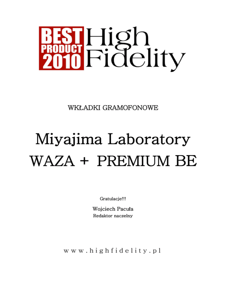 WKŁADKI GRAMOFONOWE Miyajima Laboratory WAZA + PREMIUM BE Gratulacje!!! Wojciech Pacuła Redaktor naczelny www.highfidelity.pl