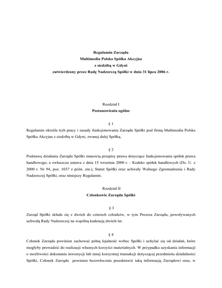 Regulamin Zarządu Multimedia Polska Spółka Akcyjna z siedzibą w Gdyni zatwierdzony przez Radę Nadzorczą Spółki w dniu 31 lipca 2006 r. Rozdział I Postanowienia ogólne §1 Regulamin określa tryb pracy i zasady funkcjonowania Zarządu Spółki pod firmą Multimedia Polska Spółka Akcyjna z siedzibą w Gdyni, zwanej dalej Spółką. §2 Podstawę działania Zarządu Spółki stanowią przepisy prawa dotyczące funkcjonowania spółek prawa handlowego, a zwłaszcza ustawa z dnia 15 września 2000 r. - Kodeks spółek handlowych (Dz. U. z 2000 r. Nr 94, poz. 1037 z późn. zm.), Statut Spółki oraz uchwały Walnego Zgromadzenia i Rady Nadzorczej Spółki, oraz niniejszy Regulamin. Rozdział II Członkowie Zarządu Spółki §3 Zarząd Spółki składa się z dwóch do czterech członków, w tym Prezesa Zarządu, powoływanych uchwałą Rady Nadzorczej na wspólną kadencję dwóch lat. §4 Członek Zarządu powinien zachować pełną lojalność wobec Spółki i uchylać się od działań, które mogłyby prowadzić do realizacji własnych korzyści materialnych. W przypadku uzyskania informacji o możliwości dokonania inwestycji lub innej korzystnej transakcji dotyczącej przedmiotu działalności Spółki, Członek Zarządu powinien bezzwłocznie przedstawić taką informację Zarządowi oraz, w zakresie określonym w § 14 poniżej, Radzie Nadzorczej, w celu rozważenia możliwości jej wykorzystania przez Spółkę. Wykorzystanie takiej informacji przez Członka Zarządu lub przekazanie jej osobie trzeciej może nastąpić tylko za zgodą Zarządu bądź, w zakresie określonym w § 14 poniżej, Rady Nadzorczej i jedynie wówczas, gdy nie narusza to interesu Spółki. §5 Członek Zarządu może pełnić funkcje w organach zarządzających lub nadzorczych innych podmiotów wyłącznie w przypadku uzyskania uprzedniej zgody Rady Nadzorczej. §6 Członkowie Zarządu są zobowiązani do niezwłocznego informowania Spółki o zaistnieniu wszelkich zdarzeń, w odniesieniu do których na Spółce ciążą obowiązki informacyjne wynikające z przepisów mających zastosowanie do spółek publicznych. §7 Członek Zarządu powinien traktować posiadane akcje Spółki oraz spółek wobec niej dominujących i zależnych jako inwestycję długoterminową. §8 Członkowie Zarządu powinni informować Radę Nadzorczą o każdym konflikcie interesów w związku z pełnioną funkcją lub o możliwości jego powstania. Rozdział III Kompetencje i obowiązki Zarządu Spółki §9 Zarząd Spółki prowadzi sprawy Spółki, zarządza jej majątkiem oraz reprezentuje Spółkę na zewnątrz wobec osób trzecich. W trakcie wykonywania swoich obowiązków członkowie Zarządu są zobowiązani działać zgodnie z postanowieniami Statutu oraz zasadami ładu korporacyjnego, do stosowania których Spółka się zobowiązała. § 10 Zarząd działa we wszystkich sprawach nie zastrzeżonych do kompetencji Walnego Zgromadzenia lub Rady Nadzorczej. 2 § 11 1. Zarząd, kierując się interesem Spółki, określa strategię oraz główne cele działania Spółki i przedkłada je Radzie Nadzorczej w formie projektu rocznego budżetu celem jego zatwierdzenia, po czym jest odpowiedzialny za jego wdrożenie i realizację. Zarząd dba o przejrzystość i efektywność systemu zarządzania Spółką oraz prowadzenie jej spraw zgodnie z przepisami prawa i dobrą praktyką. 2. Zarząd przekazuje Radzie Nadzorczej regularne i wyczerpujące informacje o wszystkich istotnych sprawach dotyczących działalności Spółki oraz o ryzyku związanym z prowadzoną przez Spółkę działalnością i sposobach zarządzania tym ryzykiem. § 12 Przy podejmowaniu decyzji w sprawach Spółki członkowie Zarządu powinni działać w granicach uzasadnionego ryzyka gospodarczego, tzn. po rozparzeniu wszystkich informacji, analiz i opinii, które w rozsądnej ocenie Zarządu powinny być w danym przypadku wzięte pod uwagę ze względu na interes Spółki. Przy ustalaniu interesu Spółki należy brać pod uwagę uzasadnione w długookresowej perspektywie interesy akcjonariuszy, wierzycieli, pracowników Spółki oraz innych podmiotów i osób współpracujących ze Spółką w zakresie jej działalności gospodarczej, a także interesy społeczności lokalnych. § 13 Przy dokonywaniu transakcji z akcjonariuszami oraz innymi osobami, których interesy wpływają na interes Spółki, Zarząd powinien działać ze szczególna starannością, aby transakcje były dokonywane na warunkach rynkowych. § 14 Dokonanie przez Zarząd następujących czynności wymaga uprzedniej zgody Rady Nadzorczej wyrażonej w formie uchwały: (i) nabycie, w ramach jednej lub kilku powiązanych ze sobą transakcji, przedsiębiorstwa lub zorganizowanej jego części, bądź składników majątkowych innego przedsiębiorstwa jeśli wartość takich składników przekracza równowartość kwoty 500.000 (pięćset tysięcy) euro według średniego kursu EUR/PLN opublikowanego przez Narodowy Bank Polski jako obowiązujący w dniu zawarcia umowy („Kurs”), (ii) nabycie lub zbycie nieruchomości (w tym prawa użytkowania wieczystego) lub udziału w niej, (iii) sprzedaż, dzierżawę, oddanie do używania innej osobie, bądź obciążenie prawami rzeczowymi lub obligacyjnymi składników majątku przedsiębiorstwa Spółki, których jednostkowa wartość księgowa netto przekracza równowartość 500.000 (pięćset tysięcy) euro według Kursu, za 3 wyjątkiem umów bądź czynności ujętych indywidualnie w rocznym planie działalności i budżecie zatwierdzonym przez Radę Nadzorczą, (iv) objęcie lub nabycie w imieniu Spółki udziałów (akcji) w innej spółce oraz zbycie udziałów (akcji) będących własnością Spółki, za wyjątkiem umów bądź czynności ujętych indywidualnie w rocznym planie działalności i budżecie zatwierdzonym przez Radę Nadzorczą, (v) zaciągnięcie pożyczki, kredytu bądź innego zobowiązania finansowego, którego jedn