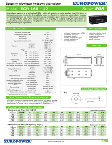 Szczelny, ołowiowo-kwasowy akumulator Model: EGR 160 - 12 Seria EGR Akumulator wykonany w technologii GEL - elektrolit uwięziony jest w postaci żelu. Eliminuje to niebezpieczeństwo wycieków i umożliwia pracę w dowolnym położeniu. Akumulator posiada samouszczelniające się zawory ciśnieniowe zapobiegające powstawaniu nadmiernego ciśnienia w ogniwie (VRLA). Seria EGR przeznaczona jest do pracy w skrajnie trudnych warunkach, jak wysoka temperatura otoczenia czy głębokie i długie czasy rozładowań. Nadaje się zarówno do pracy buforowej jak i cyklicznej. DANE TECHNICZNE ZASTOSOWANIA Żywotność projektowana wysokość długość szerokość Wymiary Waga Pojemność o w 25 C Dopuszczalny zakres temperatury otoczenia Rezystancja wewnętrzna 20h 8,00A @1,75V/ogn. 10h 15,3A @1,75V/ogn. 5h 27,1A @1,75V/ogn. 1h 97,4A @1,60V/ogn. podczas ładowania podczas rozładowania podczas składowania w pełni naładowany akumulator praca buforowa praca cykliczna Napięcie ładowania o w 20 C zalecany maksymalny Maksymalny prąd rozładowania (5s) Dostępna pojemność przy po 1 miesiącu samorozładowaniu po 6 miesiącach podczas składowania o po 12 miesiącach w 20 C standardowa Typ obudowy opcjonalna Końcówki biegunowe insert terminal Maksymalny moment dokręcania śrub odnawialne źródła energii pojazdy elektryczne urządzenia elektryczne jachty i łodzie sprzęt medyczny WYMIARY 522 ± 2 16 A 32 A 800 A 97 % 79 % 60 % ABS UL 94-HB ABS UL 94-V0** I3 10,0 Nm Prąd ładowania *) - Wg Eurobat (grupa High Performance) zasilacze bezprzerwowe (UPS) oświetlenie awaryjne oświetlenie uliczne siłownie telekomunikacyjne centrale telefoniczne telewizje kablowe 202 ± 2 219.5 ± 2 216 ± 2 12 V 160 Ah / C20 6 GEL 10~12 lat w 20oC* 8 lat w 25oC 220,0 mm 522,0 mm 202,0 mm ~55,0 kg 160,0 Ah 153,0 Ah 135,5 Ah 97,4 Ah 0oC ~ 40oC -20oC ~ 50oC -20oC ~ 40oC £5,0 mW 13,5V do 13,8V (-18 mV/oC) 14,4 V do 15,0V (-24 mV/oC) 105 Napięcie znamionowe Pojemność znamionowa Ilość ogniw Technologia 208 KOŃCÓWKI BIEGUNOWE I3 M8 x 1.25 **) - Trudnopalna 3.5 BRAK OGRANICZEŃ TRANSPORTOWYCH Akumulator dopuszczony do transportu drogą lotniczą, morską lub lądową. Sklasyfikowany jako materiał nie niebezpieczny (IATA/ICAO Special Provision A67, DOT-CFR Title 49 parts 171-189, IMDG amendment 27) [śruba M8] CHARAKTERYSTYKI ROZŁADOWAŃ o • Stałoprądowe (Prąd [A], 25 [ C]) Uk V/ogniwo 1,80 1,75 1,70 1,65 1,60 30 min 1h 2h 3h 4h 5h 6h 8h 10h 149,7 152,0 153,1 153,6 153,6 90,5 93,3 95,3 96,5 97,4 50,5 52,0 52,3 52,5 52,7 38,8 39,6 40,1 40,4 40,6 31,1 32,0 32,2 32,3 32,4 26,67 27,12 27,35 27,43 27,51 23,00 23,39 23,59 23,66 23,73 18,38 18,42 18,46 18,48 18,50 15,24 15,27 15,30 15,32 15,34 o • Stałomocowe (Moc [W/ogniwo], 25 [ C]) Uk V/ogniwo 1,80 1,75 1,70 1,65 1,60 30 min 1h 2h 3h 4h 5h 6h 8h 10h 299,5 304,0 306,3 306,7 307,2 177,2 182,5 186,3 188,5 190,5 101,1 104,0 104,7 105,1 105,5 77,3 78,9 79,9 80,5 80,9 62,2 64,0 64,4 64,7 64,9 53,3 54,2 54,6 54,9 55,0 46,0 46,8 47,1 47,3 47,4 36,77 36,83 36,91 36,95 37,03 30,48 30,53 30,60 30,63 30,70 www.europower.eu Czas rozładowania 12h 20h 12,50 12,87 12,95 13,00 13,04 7,77 8,00 8,05 8,08 8,11 Czas rozładowania 12h 20h 25,55 25,73 25,89 26,00 26,11 15,55 16,00 16,10 16,17 16,23 EGR EGR 160 - 12 Żywotność akumulatora przy pracy buforowej Żywotność akumulatora przy pracy cyklicznej 10 Temperatura: o 25[ C] 120 Napięcie ładowania 2.275 V/ogniwo 100 8 Pojemność [%] Projektowana żywotność [lata] 20 6 4 80 60 głębokość rozładowania 100[%] 40 głębokość rozładowania 30[%] głębokość rozładowania 50[%] głębokość rozładowania 80[%] 2 20 0 20 30 40 0 50 0 400 800 1200 o Temperatura pracy [ C] 1600 2000 Liczba cykli Charakterystyki rozładowania akumulatora Charakterystyki samorozładowania akumulatora 100 13.0 Temperatura: 25[oC] Zachowana pojemność [%] 12.0 0.17C[A] 0.096C[A] 0.25C[A] 0.05C[A] 10.0 0.6C[A] 9.0 8.0 2C[A] 7.0 1 2 3 5 10 80 5[oC] 60 40[oC] 20 30 60 2 3 5 10 20 30 0 2 4 6 [h] 140 14.0 Napięcie ładowania 0.15 13.0 Poziom na ładowania 12.0 120 100 80 Rozładowanie 100% (0.05C[A] x 20[h]) 50% (0.05C[A] x 10[h]) Ładowanie stałonapięciowe: 2.275[V/ogniwo] stałoprądowe: 0.1C[A] Temperatura: 20[oC] 10.0 0.03 60 40 20 0 0 5 10 15 20 Czas ładowania [h] 12 14 16 18 20 25 15.0 0.18 14.0 Napięcie ładowania 120 Poziom naład 0.15 0.12 0.09 0.06 140 owania 13.0 100 12.0 80 Rozładowanie 100% (0.05C[A] x 20[h]) 50% (0.05C[A] x 10[h]) Ładowanie stałonapięciowe: 2.45[V/ogniwo] stałoprądowe: 0.1C[A] o Temperatura: 20[ C] 11.0 10.0 60 40 0.03 20 Prąd ładowania Prąd ładowania 0 0.21 Napięcie ładowania [V] 0.18 Prąd ładowania [CxA] 15.0 0.06 10 Charakterystyki ładowania przy pracy cyklicznej Poziom naładowania akumulatora [%] 0.21 Napięcie ładowania [V] Prąd ładowania [CxA] Charakterystyki ładowania przy pracy buforowej 11.0 8 Okres składowania [miesiące] Czas rozładowania 0.09 20[oC] 40 1C[A] [min] 0.12 30[oC] Poziom naładowania akumulatora [%] Napięcie [V] 11.0 0 0 0 0 5 10 15 20 Czas ładowania [h] 25 0 Dopuszczalne końcowe napięcia rozładowania akumulatora Prąd rozładowania [A] Końcowe napięcie rozładowania [V/ogniwo] 0.2C > I 0.2C £ I < 0.5C 0.5C £ I < 1.0C 1.0C £ I 1.75 1.70 1.55 1.30 Pb *) C - pojemność akumulatora data wydania: 03.07.2014; numer zmiany: 0; data zmiany: 03.07.2014 www.europower.eu EGR
