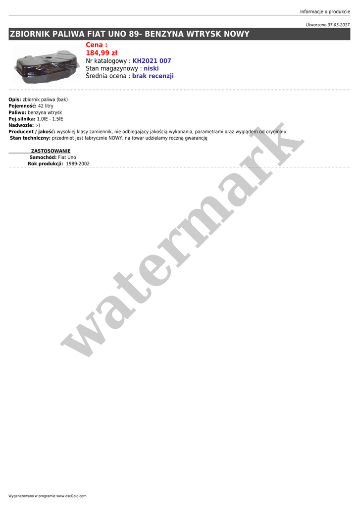 Informacje o produkcie Utworzono 07-03-2017 ZBIORNIK PALIWA FIAT UNO 89- BENZYNA WTRYSK NOWY Cena : 184,99 zł Nr katalogowy : KH2021 007 Stan magazynowy : niski Średnia ocena : brak recenzji w at ZASTOSOWANIE Samochód: Fiat Uno Rok produkcji: 1989-2002 er m ar k Opis: zbiornik paliwa (bak) Pojemność: 42 litry Paliwo: benzyna wtrysk Poj.silnika: 1.0IE - 1.5IE Nadwozie: :-) Producent / jakość: wysokiej klasy zamiennik, nie odbiegający jakością wykonania, parametrami oraz wyglądem od oryginału Stan techniczny: przedmiot jest fabrycznie NOWY, na towar udzielamy roczną gwarancję Wygenerowano w programie www.oscGold.com