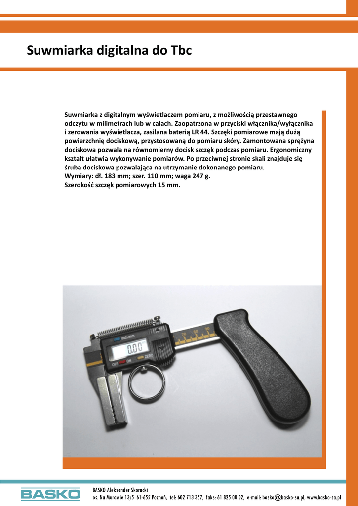Suwmiarka digitalna do Tbc Suwmiarka z digitalnym wyświetlaczem pomiaru, z możliwością przestawnego odczytu w milimetrach lub w calach. Zaopatrzona w przyciski włącznika/wyłącznika i zerowania wyświetlacza, zasilana baterią LR 44. Szczęki pomiarowe mają dużą powierzchnię dociskową, przystosowaną do pomiaru skóry. Zamontowana sprężyna dociskowa pozwala na równomierny docisk szczęk podczas pomiaru. Ergonomiczny kształt ułatwia wykonywanie pomiarów. Po przeciwnej stronie skali znajduje się śruba dociskowa pozwalająca na utrzymanie dokonanego pomiaru. Wymiary: dł. 183 mm; szer. 110 mm; waga 247 g. Szerokość szczęk pomiarowych 15 mm.