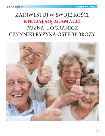 echo życia TEMAT NUMERU ZAINWESTUJ W SWOJE KOŚCI NIE DAJ SIĘ ZŁAMAĆ!!! POZNAJ I OGRANICZ CZYNNIKI RYZYKA OSTEOPOROZY 3 TEMAT NUMERU echo życia NIE PĘKAJ ! BĄDŹ TWARDY ! OSTEROPOROZA Rozwija się wiele lat, podstępnie i bezobjawowo. Może się pojawić w różnym wieku, najczęściej jednak dotyczy osób starszych – kobiet w okresie menopauzalnym i mężczyzn po 65. roku życia. Polega na powolnej demineralizacji i osłabianiu kości. Jej pierwszym klinicznym objawem, świadczącym jednocześnie o zaawansowaniu choroby, bywa złamanie. Osteoporoza. Co zrobić, by jej uniknąć? O zdrowe kości należy dbać przez całe życie. To, na ile będą silne, zależy od odżywiania się i sposobu życia już od najmłodszych lat. Rozwój kości trwa do około 35 roku życia – to wtedy osiągają swoją maksymalną gęstość. Wprawdzie proces ich odnowy nigdy się nie kończy, z upływem lat jednak zachowanie równowagi między procesami niszczenia i odbudowy ich struktury, okazuje się coraz trudniejsze. Zdrowa dieta Profilaktyka osteoporozy polega na dostarczeniu organizmowi odpowiedniej ilości wapnia. Układ kostny to prawdziwy magazyn tego pierwiastka. Od niego zależy twardość i odporność kości na złamania. Wapń jest jednak niezbędny do prawidłowego funkcjonowania wielu innych narządów, jeśli więc zabraknie go w pożywieniu, organizm sięga po zapasy zgromadzone w kościach. Dlatego warto zadbać, by w naszych posiłkach nigdy go nie zabrakło. Bogatym i łatwo dostępnym źródłem wapnia jest mleko i wszelkie jego przetwory, a także jajka, sardynki, łosoś, orzechy, migdały i suszone figi. Około 1500 mg wapnia dziennie zapewni naszym kościom zdrowie i dobrą kondycję. Nie można pominąć także witaminy D. To właśnie ona jest „katalizatorem” prawidłowego wchłaniania tego pierwiastka w organizmie. Witaminę D znajdziemy w maśle, żółtkach jaj, tłustych rybach i tranie. Przede wszystkim jednak jest ona wytwarzana w naszej skórze pod wpływem światła słonecznego. 15 minut przebywania na słońcu wystarczy, by organizm wyprodukował jej dzienną, niezbędną dawkę. 4 Pełnowartościowe białko to kolejny składnik, niezbędny do prawidłowej budowy kości. Źródłem białka, a ponadto wartościowych witamin, są też owoce, warzywa i zboża. Warto o nich pamiętać także z tego powodu, że przy diecie, w której przeważają pokarmy pochodzenia zwierzęcego, w szczególności mięso, wapń wypłukiwany jest z organizmu. Chcąc zachować zdrowe, silne kości powinniśmy zrezygnować, albo przynajmniej mocno ograniczyć spożywanie alkoholu, kawy i napojów gazowanych. Niekorzystny wpływ na procesy odnowy tkanki kostnej ma również palenie papierosów. Spacer po zdrowie Ogromną rolę w utrzymaniu zdrowych, silnych kości, odgrywa aktywność fizyczna. Równomierne, systematyczne obciążanie mięśni, kości i stawów jest czynnikiem pobudzającym procesy odbudowy układu kostnego. Warto zaznaczyć, że nie chodzi tu o forsowny wysiłek. Umiarkowane ćwiczenia, o średnim natężeniu, będą nie tylko przyjemniejsze – przyniosą dużo lepszy efekt. Najlepszą formą stymulacji procesów kościotwórczych przez ruch wydaje się spacer. Powinien on być nieco szybszy niż w trakcie zwyczajnej przechadzki. Dobry jest również jogging, taniec, czy zyskujący ostatnio ogromną popularność również wśród seniorów – nordic walking. Jeśli ktoś lubi pływać lub jeździć na rowerze – śmiało może się oddać swoim przyjemnościom. Za 30 minut codziennego ruchu nasze kości na pewno się odwdzięczą. oprac. Antonina Niekrasz echo życia TEMAT NUMERU Polki boją się osteoporozy, ale się nie badają! Aż 85 proc. Polek po 40. roku życia obawia się osteoporozy, mimo to aż trzy czwarte spośród nich nigdy jeszcze nie badało gęstości kości - wykazał sondaż TNS OBOP. Wyniki badań mówią, że 91 proc. badanych Polek wie, że osteoporoza to grożąca złamaniami choroba metaboliczna kości. Ale zdecydowana większość z nich lekceważy to zagrożenie. Prof. Ewa Marcinowska-Suchowierska, kierownik Kliniki Medycyny Rodzinnej Chorób Wewnętrznych i Chorób Metabolicznych Kości CMKP w Warszawie, przytoczyła dane wskazujące, że aż 20 proc. chorych ze złamaniami kości udowej umiera z powodu powikłań w ciągu sześciu miesięcy, a ponad 50 proc. - w następnym roku. - Osoby, które przeżywają takie złamanie, cierpią fizycznie z powodu bólu oraz psychicznie z powodu upośledzenia ruchowego. Ponad połowa chorych, którzy przeżyli złamania szyjki kości udowej, odczuwa pogorszenie jakości życia, a jedna trzecia nigdy nie powraca do pełnej samodzielności i wymaga długotrwałej opieki. Pierwszym objawem osteoporozy może być złamanie, najczęściej przedramienia, nadgarstka lub trzonów kręgów. Jednak wtedy mówimy już o zaawansowanej chorobie, która grozi kolejnym złamaniem, jeszcze poważniejszym, tym razem szyjki kości udowej - podkreśliła prof. Marcinowska-Suchowierska dodając, że leczenie opóźnia postęp osteoporozy - po pięciu latach terapii ryzyko złamania kości udowej jest o połowę mniejsze. Według WHO, indywidualne ryzyko złamania można ocenić z dziesięcioletnim wyprzedzeniem metodą FRAX (fracture risk assesment). Poza badaniem densymetrycznym szyjki kości udowej uwzględnia ono takie czynniki ryzyka jak wiek i płeć, niską masę ciała (wskaźnik BMI poniżej 20), złamania bliższego końca kości udowej u rodziców, przebyte złamania po 50. roku życia, palenie papierosów, zażywanie glikokortykosteroidów, reumatoidalne zapalenie stawów i nadużywanie alkoholu. Osobom z indywidualnym ryzykiem złamań, tzw. RB-10 niższym niż 10 proc. (zaleca się jedynie zdrowy styl życia i poprawę ogólnej sprawności fizycznej. Wysokie RB-10, powyżej 20 proc., wymaga zastosowania leczenia farmakologicznego). Przy średnim zagrożeniu złamaniem (RB-10 pomiędzy 10-20 proc.), o le