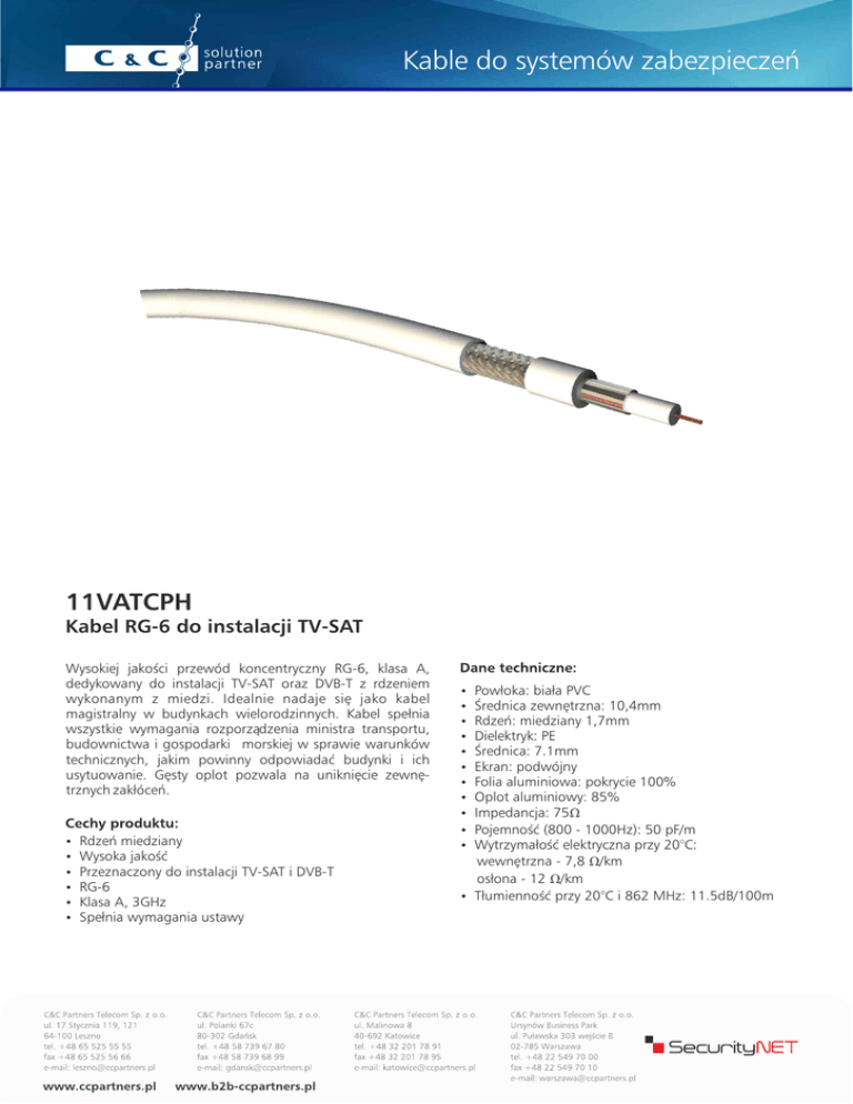 Kable do systemów zabezpieczeń 11VATCPH Kabel RG-6 do instalacji TV-SAT Wysokiej jakości przewód koncentryczny RG-6, klasa A, dedykowany do instalacji TV-SAT oraz DVB-T z rdzeniem wykonanym z miedzi. Idealnie nadaje się jako kabel magistralny w budynkach wielorodzinnych. Kabel spełnia wszystkie wymagania rozporządzenia ministra transportu, budownictwa i gospodarki morskiej w sprawie warunków technicznych, jakim powinny odpowiadać budynki i ich usytuowanie. Gęsty oplot pozwala na uniknięcie zewnętrznych zakłóceń. Rdzeń miedziany Wysoka jakość Przeznaczony do instalacji TV-SAT i DVB-T RG-6 Klasa A, 3GHz Spełnia wymagania ustawy Powłoka: biała PVC Średnica zewnętrzna: 10,4mm Rdzeń: miedziany 1,7mm Dielektryk: PE Średnica: 7.1mm Ekran: podwójny Folia aluminiowa: pokrycie 100% Oplot aluminiowy: 85% Impedancja: 75Ω Pojemność (800 - 1000Hz): 50 pF/m Wytrzymałość elektryczna przy 20°C: wewnętrzna - 7,8 Ω/km osłona - 12 Ω/km Tłumienność przy 20°C i 862 MHz: 11.5dB/100m