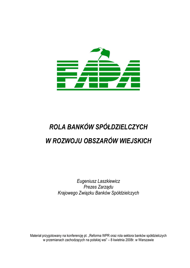 ROLA BANKÓW SPÓŁDZIELCZYCH W ROZWOJU OBSZARÓW WIEJSKICH Eugeniusz Laszkiewicz Prezes Zarządu Krajowego Związku Banków Spółdzielczych Materiał przygotowany na konferencję pt. „Reforma WPR oraz rola sektora banków spółdzielczych w przemianach zachodzących na polskiej wsi” – 8 kwietnia 2008r. w Warszawie 1. Stan wsi i rolnictwa po akcesji i udział sektora BS w jego utrzymaniu Polska jest członkiem UE już prawie 4 lata. W tym okresie uruchomiono w naszym kraju programy operacyjne UE, których zadaniem było częściowe refinansowanie inwestycji ze środków wspólnotowych. Wymagało to podjęcia ze strony Rządu RP rozlicznych działań, mających na celu przystosowanie polskiego rolnictwa do sprostania wymaganiom stawianym przez UE. Konieczna była, m.in. modyfikacja zasad przyznawania pomocy publicznej dla rolników, reorganizacja interwencjonizmu państwowego w sektorze rolnym oraz nowelizacja ustawy o funkcjonowaniu banków spółdzielczych. Dzięki tym staraniom możliwy był znaczący wzrost eksportu polskiej żywności, jak również widoczny rozwój cywilizacyjny obszarów wiejskich. Istotny udział w tym procesie miały banki spółdzielcze, które odpowiadając na potrzeby swoich członków - klientów, włożyły dużo wysiłku we wdrożenie nowych rozwiązań organizacyjnych i operacyjnych umożliwiających korzystanie ze środków UE. Dzięki temu, ponad 80% rachunków bankowych do obsługi tych dopłat zostało założonych właśnie w tych bankach. Do końca 2006 roku Agencja Restrukturyzacji i Modernizacji Rolnictwa dokonała należnych płatności na rzecz beneficjentów Programu SAPARD. Łącznie z Rocznych Umów Finansowych 2000-2003 (RUF 20002003), odsetek i środków Planu Rozwoju Obszarów Wiejskich na lata 2004-2006 wypłacono beneficjentom prawie 1,068 mld € (około 4,512 mld złotych), co stanowi prawie 113% środków pierwotnej alokacji przeznaczonych na Program SAPARD z RUF 2000-2003. Dofinansowanie sektora rolno-spożywczego realizowano także w ramach SPO „Restrukturyzacja i modernizacja sektora żywnościowego oraz rozwój obszarów wiejskich na lata 2004-2006”. Nie sprawdziły się obawy, że Polska nie wykorzysta przyznanych środków. W odniesieniu do zakończonego w sierpniu 2004 roku programu przedakcesyjnego SAPARD należy podkreślić pełne wykorzystanie jego środków finansowych, a banki spółdzielcze mogą z dumą podkreślić, że znacząca liczba ich klientów znalazła się w gronie beneficjentów tego programu. Mając na uwadze zwiększenie dostępności swoich usług dla klientów, banki przeprowadziły daleko idące zmiany, które dotyczyły: (1) modernizacji infrastruktury operacyjnej, (2) skorygowania zasad obsługi rozliczeniowej, (3) zwiększenia zakresu oferty handlowej, (4) uruchomienia „Punktów Doradztwa Unijnego” (PDU) w swoich placówkach bankowych. 2 W okresie 2004-2006, banki spółdzielcze stworzyły w swoich placówkach 1683 Punkty Doradztwa Unijnego na terenie całej Polski, głównie na obszarach wiejskich. 7 Punkty Doradztwa Unijnego rozpoczęły aktywną działalność od 2004 roku. W pierwszym okresie polegała ona na wsparciu rolników podczas wypełniania wniosków o wpis do ewidencji producentów i dopłaty bezpośrednie. Sukces tej akcji był wynikiem wspólnych działań podjętych przez banki i Agencję Restrukturyzacji i Modernizacji Rolnictwa (ARiMR). W 2003 roku na podstawie porozumienia podpisanego z ARiMR i bankami zrzeszającymi odbył się cykl szkoleń pracowników banków spółdzielczych w zakresie wypełniania wniosków o dopłaty wraz z pracownikami ODR-ów i ARiMR. Tak przygotowani przekazywali swoją wiedzę w tym zakresie rolnikom (łącznie kilka tysięcy spotkań) oraz pomagali wypełniać im wnioski w Punktach Doradztwa Unijnego. Przeszkolonych zostało blisko 7000 osób, pracowników PDU oraz komórek kredytowych. Ich kompetencje są nieustannie poszerzane i uaktualniane poprzez dalsze szkolenia, jak również specjalne „numerowane” komunikaty, które banki zrzeszające przesyłają do banków spółdzielczych i swoich jednostek. We wszystkich bankach zrzeszających powstały wyspecjalizowane komórki zajmujące się funduszami pomocowymi dla potrzeb wszystkich zrzeszonych banków, które są kanałem komunikacji pomiędzy bankami spółdzielczymi a instytucjami odpowiedzialnymi za absorpcję środków unijnych. Usługi doradcze świadczone przez banki z pewnością spowodują wzrost absorpcji środków unijnych. Wszelkie badania dowodzą, iż rolnicy i mieszkańcy wsi należą do najsłabiej poinformowanych grup społeczeństwa i każdy dodatkowy punkt informacyjny na terenach wiejskich jest wysoce pożądany. Biorąc 3 pod uwagę rozległą sieć placówek banków spółdzielczych (ponad 3800 punktów), profesjonalizm instytucji bankowych i kompleksowość oferowanych usług, beneficjenci będą fachowo poinformowani. Efektem tych działań będzie wzrost jakości składanych dokumentacji. Wraz z przystąpieniem Polski do Unii zmienił się sposób interwencji na rynkach rolnych. Agencja Rynku Rolnego realizuje obecnie zadania WPR, zgodnie z zasadami unijnymi. W 2004 roku, po raz pierwszy, ARR nie prowadziła interwencji rynkowej podczas żniw. Polska stając się członkiem Unii została m.in. objęta wspólną taryfą celną, co oznacza nieskrępowany obrót towarami w ramach UE. Widocznym efektem tych zmian był ok. 40% wzrost eksportu towarów rolno-spożywczych do Unii w pierwszych latach po akcesji. Kontynuowanie tego pozytywnego trendu jest możliwe poprzez działania MRiRW oraz partnerów wskazanych w „Programie Rozwoju Obszarów Wiejskich na lata 2007-2013”, służące poprawie warunków i jakości życia na wsi. Z tej perspektywy, banki spółdzielcze pozytywnie przyjęły uchwalenie we wrześniu 2000 roku ustawy o grupach producentów rolnych oraz nowe podejście do Programu LEADER w ramach nowego budżetu UE na lata 2007-2013. Wsparciem merytoryc