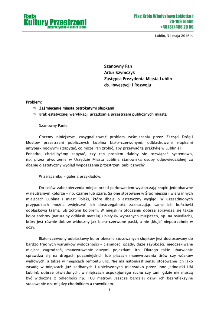 Plac Króla Władysława Łokietka 1 20-109 Lublin +48 (81) 466 20 00 Lublin, 31 maja 2016 r. Szanowny Pan Artur Szymczyk Zastępca Prezydenta Miasta Lublin ds. Inwestycji i Rozwoju Problem: • • Zaśmiecanie miasta pstrokatymi słupkami Brak estetycznej weryfikacji urządzania przestrzeni publicznych miasta Szanowny Panie, Chcemy niniejszym zasygnalizować problem zaśmiecania przez Zarząd Dróg i Mostów przestrzeni publicznych Lublina biało-czerwonymi, odblaskowymi słupkami antyparkingowymi i zapytać, co może Pan zrobić, aby przerwać tę praktykę w Lublinie? Ponadto, chcielibyśmy zapytać, czy ten problem dałoby się rozwiązać systemowo, np. przez utworzenie w Urzędzie Miasta Lublina stanowiska osoby odpowiedzialnej za dbanie o estetyczny wygląd wyposażenia przestrzeni publicznych? W załączniku – galeria przykładów. Do celów zabezpieczenia miejsc przed parkowaniem wystarczają słupki jednobarwne w neutralnym kolorze – np. czarne lub szare. Są one stosowane w Śródmieściu i wielu innych miejscach Lublina i miast Polski, które dbają o estetyczny wygląd. W uzasadnionych przypadkach można zwiększyć ich dostrzegalność zaznaczając same ich końcówki odblaskową taśma lub żółtym kolorem. W miejskim otoczeniu dobrze sprawdza się także kolor srebrny (naturalny odblask metalu) i biały (w wybranych miejscach, np. na osiedlach), który jest równie dobrze widoczny jak biało-czerwone paski, a nie „kłuje” niepotrzebnie w oczy. Biało-czerwony odblaskowy kolor obecnie stosowanych słupków jest dostosowany do bardzo trudnych warunków widoczności – ciemność, opady, duże szybkości, nieoczekiwane miejsca zagrodzeń, manewrowanie dużymi pojazdami itp. Dlatego takie ubarwienie sprawdza się na drogach pozamiejskich lub placach manewrowania tirów czy wózków widłowych, a także w miejscach remontu ulic. Nie ma natomiast sensu stosowanie ich jako zasadę w miejscach już zadbanych i upiększonych (nierzadko przez inne jednostki UM Lublin), dobrze oświetlonych, w miejscach uspokojonego ruchu czy tam, gdzie nie muszą być widoczne z odległości np. 100 metrów. Jeszcze bardziej dziwi ich bezrefleksyjne stosowanie np. między chodnikiem a trawnikiem. 1 „Ozdabianie” takimi słupkami ulic oszpeca Lublin, zamienia przestrzeni publiczne w miejsca nieprzyjazne użytkownikom i – skutkiem tego – jest dla gości widocznym znakiem braku troski o estetykę otoczenia i potrzeby mieszkańców. Godzi w wizerunek Miasta Inspiracji, kłóci się z postulatami Strategii Rozwoju Miasta i praktykami miast, z którymi Lublin chce konkurować. Z poważaniem Opracował: Marcin Skrzypek Redakcja techniczna: Jan Kamiński Przewodniczący RKP Katarzyna Kuzia Do wiadomości: Pani Joanna Żytkowska – Dyrektor Kancelarii Prezydenta Miasta Lublin, [email protected] Pan Zdzisław Strycharz – Koordynator projektu „Rewitalizacj Doliny Bystrzycy”, [email protected] Pani Marta Smal-Chudzik – Dyrektor Wydziału Ochrony Środowiska, [email protected] Pani Hanna Pawlikowska - Biuro Miejskiego Architekta Zieleni, [email protected] Pani Ludwika Stefańczyk – Dyrektor Wydział Gospodarki Komunalnej UM Lublin, [email protected] Redakcja „Kuriera Lubelskiego”, [email protected] Redakcja „Dziennika Wschodniego”, [email protected] Redakcja „Gazety w Lublinie”, [email protected] 2 Załącznik - galeria przykładów Ul. Bursztynowa - słupki przed odnowieniem, jeszcze białe. Dobrze widoczne i ładne. Ul. Bursztynowa - słupki po odnowieniu. Psujące widok, bardziej rzucające się w oczy niż pasy. Ul. Bursztynowa - inne słupki przed odnowieniem. Dziś stoją tu już biało-czerwone odblaskowe. Warszawa, Plac Grzybowski - neutralne słupki z odblaskiem i funkcją przypinania roweru. Czarne słupki na zamknięciu Żmigrodu. Takie są zupełnie wystarczające. Czarne słupki na nowym przejściu przy Centrum Kultury. 3 Ul. Radziszewskiego róg Uniwersyteckiej czarne i szare z odblaskiem przed zmianą. Ul. Radziszewskiego róg Uniwersyteckiej - po wymianie słupków szarych na biało-czerwone i dodaniu kolejnych. Ul. Radziszewskiego róg Uniwersyteckiej – czarne w głębi i biało-czerwone. Ul. Nadrzeczna. Zupełnie zbędne słupki między chodnikiem a trawnikiem na ul. Fabrycznej, naprzeciwko Gali. Ul. Wieniawska – jakby wyglądała, gdyby zainstalować na niej biało-czerwone odblaskowe słupki? 4