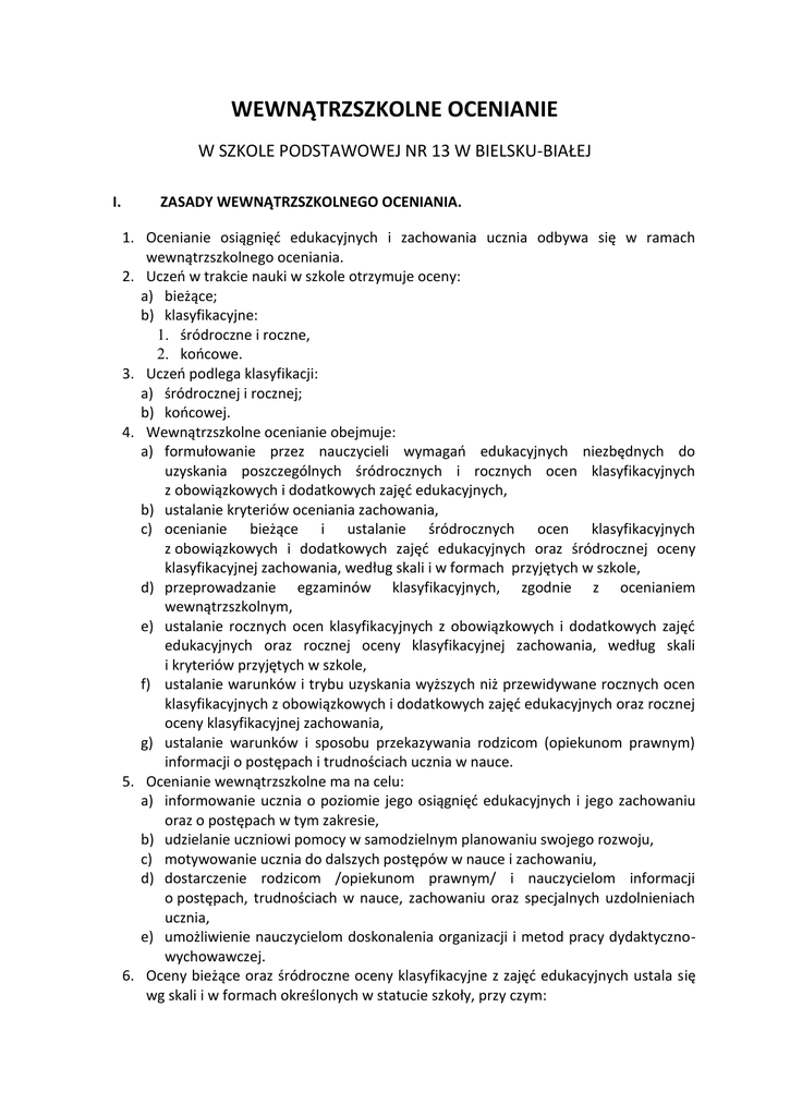 WEWNĄTRZSZKOLNE OCENIANIE W SZKOLE PODSTAWOWEJ NR 13 W BIELSKU-BIAŁEJ I. ZASADY WEWNĄTRZSZKOLNEGO OCENIANIA. 1. Ocenianie osiągnięć edukacyjnych i zachowania ucznia odbywa się w ramach wewnątrzszkolnego oceniania. 2. Uczeń w trakcie nauki w szkole otrzymuje oceny: a) bieżące; b) klasyfikacyjne: 1. śródroczne i roczne, 2. końcowe. 3. Uczeń podlega klasyfikacji: a) śródrocznej i rocznej; b) końcowej. 4. Wewnątrzszkolne ocenianie obejmuje: a) formułowanie przez nauczycieli wymagań edukacyjnych niezbędnych do uzyskania poszczególnych śródrocznych i rocznych ocen klasyfikacyjnych z obowiązkowych i dodatkowych zajęć edukacyjnych, b) ustalanie kryteriów oceniania zachowania, c) ocenianie bieżące i ustalanie śródrocznych ocen klasyfikacyjnych z obowiązkowych i dodatkowych zajęć edukacyjnych oraz śródrocznej oceny klasyfikacyjnej zachowania, według skali i w formach przyjętych w szkole, d) przeprowadzanie egzaminów klasyfikacyjnych, zgodnie z ocenianiem wewnątrzszkolnym, e) ustalanie rocznych ocen klasyfikacyjnych z obowiązkowych i dodatkowych zajęć edukacyjnych oraz rocznej oceny klasyfikacyjnej zachowania, według skali i kryteriów przyjętych w szkole, f) ustalanie warunków i trybu uzyskania wyższych niż przewidywane rocznych ocen klasyfikacyjnych z obowiązkowych i dodatkowych zajęć edukacyjnych oraz rocznej oceny klasyfikacyjnej zachowania, g) ustalanie warunków i sposobu przekazywania rodzicom (opiekunom prawnym) informacji o postępach i trudnościach ucznia w nauce. 5. Ocenianie wewnątrzszkolne ma na celu: a) informowanie ucznia o poziomie jego osiągnięć edukacyjnych i jego zachowaniu oraz o postępach w tym zakresie, b) udzielanie uczniowi pomocy w samodzielnym planowaniu swojego rozwoju, c) motywowanie ucznia do dalszych postępów w nauce i zachowaniu, d) dostarczenie rodzicom /opiekunom prawnym/ i nauczycielom informacji o postępach, trudnościach w nauce, zachowaniu oraz specjalnych uzdolnieniach ucznia, e) umożliwienie nauczycielom doskonalenia organizacji i metod pracy dydaktycznowychowawczej. 6. Oceny bieżące oraz śródroczne oceny klasyfikacyjne z zajęć edukacyjnych ustala się wg skali i w formach określonych w statucie szkoły, przy czym: a) w oddziale I-III dopuszcza się stosowanie ocen bieżących w skali od 1 do 6 z zakresu edukacji polonistycznej, liczenia i rozwiązywania zadań tekstowych, edukacji zdrowotno-ruchowej, środowiskowej, artystycznej, z zajęć komputerowych oraz języka angielskiego według ustalonych szczegółowych wymagań. Ocena klasyfikacyjna śródroczna i roczna jest oceną opisową. Polega ona na podsumowaniu osiągnięć edukacyjnych i zachowania ucznia, ustalenia jednej klasyfikacyjnej oceny z zajęć edukacyjnych i jednej oceny z zachowania. b) w oddziałach IV-VI stosowanie skali ocen i przypisanych wag tym ocenom określa §39 pkt 13. 7. Począwszy od klasy IV szkoły podstawowej uczeń otrzymuje promocję do klasy programowo wyższej, jeżeli ze wszystkich obowiązkowych zajęć edukacyjnych oraz zajęć mniejszości narodowej, mniejszości etnicznej lub języka regionalnego określonych w szkolnym planie nauczania uzyskał roczne oceny klasyfikacyjne wyższe od oceny niedostatecznej. 8. Począwszy od klasy IV szkoły podstawowej uczeń, który w wyniku klasyfikacji rocznej uzyskał z obowiązkowych zajęć edukacyjnych średnią rocznych ocen klasyfikacyjnych co najmniej 4,75 oraz co najmniej bardzo dobrą ocenę klasyfikacyjną zachowania, otrzymuje promocję do klasy programowo wyższej z wyróżnieniem. 9. Uczeń, który realizował obowiązek szkolny poza szkołą, który w wyniku klasyfikacji rocznej uzyskał z obowiązkowych zajęć edukacyjnych średnią ocen klasyfikacyjnych co najmniej 4,75, otrzymuje promocję do klasy programowo wyższej z wyróżnieniem. 10. W przypadku uczniów posiadających orzeczenie o potrzebie kształcenia specjalnego wydane ze względu na niepełnosprawność intelektualną w stopniu umiarkowanym lub znacznym klasyfikacji śródrocznej i rocznej dokonuje się z uwzględnieniem ustaleń zawartych w indywidualnym programie edukacyjno-terapeutycznym oraz ustaleniu: a) w oddziałach I-III jednej rocznej oceny klasyfikacyjnej z zajęć edukacyjnych w formie opisowej oraz rocznej oceny klasyfikacyjnej zachowania w formie opisowej, b) w oddziałach IV-VI rocznych ocen klasyfikacyjnych z zajęć edukacyjnych oraz rocznej oceny klasyfikacyjnej zachowania w formie opisowej. II. ROK SZKOLNY DZIELI SIĘ NA DWA PÓŁROCZA. Ustala się jedno klasyfikowanie śródroczne, którego termin przypada w piątym miesiącu nauki, przed ogłoszeniem ferii zimowych przez Kuratorium Oświaty w Katowicach. III. TRYB USTALANIA OCENY KLASYFIKACYJNEJ ŚRÓDROCZNEJ I ROCZNEJ Z OBOWIAZKOWYCH I DODATKOWYCH ZAJĘĆ EDUKACYJNYCH. 1. Nauczyciele ustalając śródroczną lub roczną ocenę klasyfikacyjną z zajęć edukacyjnych uwzględniają: - oceny cząstkowe z odpowiedzi ustnych i pisemnych – zgodnie z § 40 pkt 4, - udział ucznia w pisemnych pracach / sprawdzianach klasowych – systematyczność i terminowość, - przygotowanie do codziennych zajęć edukacyjnych – podręczniki, zeszyty, przybory szkolne, - aktywność na zajęciach, - udział w konkursach przedmiotowych szkolnych i pozaszkolnych, - w szkole lub oddziale ogólnodostępnym śródroczną i roczną ocenę klasyfikacyjną z zajęć edukacyjnych dla ucznia posiadającego orzeczenie o potrzebie kształcenia specjalnego ustala nauczyciel prowadzący dane zajęcia edukacyjne, a w przypadku gdy w szkole lub oddziale jest dodatkowo zatrudniony nauczyciel w celu współorganizowania kształcenia uczniów niepełnosprawnych, niedostosowanych społecznie i zagrożonych niedostosowaniem społecznym, po zasięgnięciu opinii tego nauczyciela. 2. Podczas ustalania oceny nauczyciele uwzględniają również możliwości edukacyjne uczniów (uzdolnienia oraz orzeczenia poradni psychologiczno-pedagogicznych wraz ze wskaza