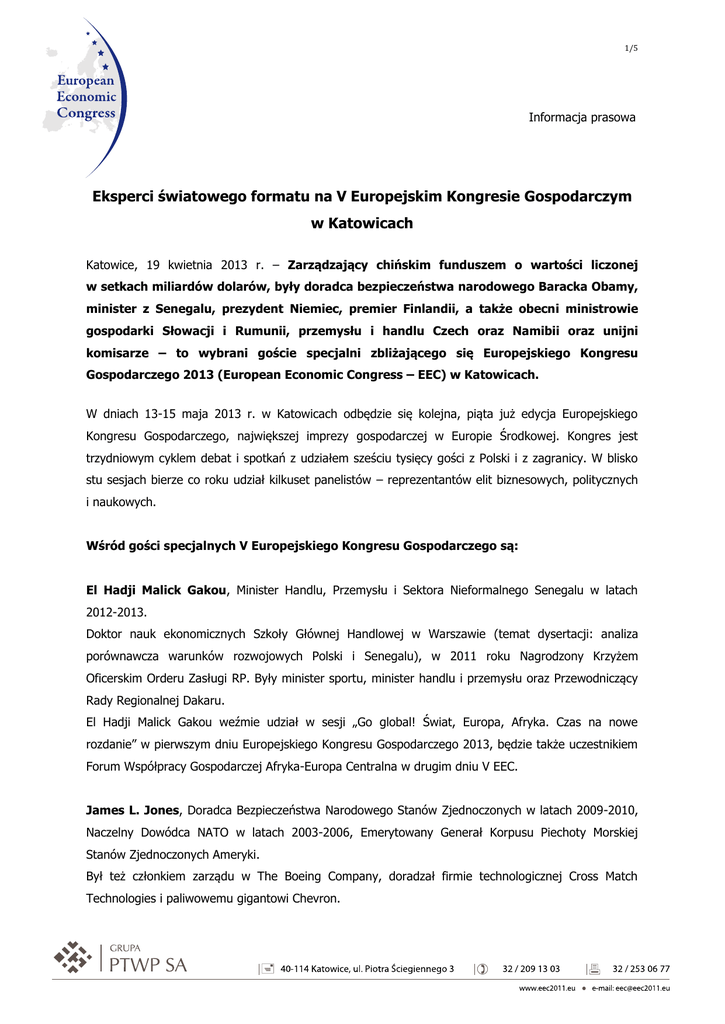 1/5 Informacja prasowa Eksperci światowego formatu na V Europejskim Kongresie Gospodarczym w Katowicach Katowice, 19 kwietnia 2013 r. – Zarządzający chińskim funduszem o wartości liczonej w setkach miliardów dolarów, były doradca bezpieczeństwa narodowego Baracka Obamy, minister z Senegalu, prezydent Niemiec, premier Finlandii, a także obecni ministrowie gospodarki Słowacji i Rumunii, przemysłu i handlu Czech oraz Namibii oraz unijni komisarze – to wybrani goście specjalni zbliżającego się Europejskiego Kongresu Gospodarczego 2013 (European Economic Congress – EEC) w Katowicach. W dniach 13-15 maja 2013 r. w Katowicach odbędzie się kolejna, piąta już edycja Europejskiego Kongresu Gospodarczego, największej imprezy gospodarczej w Europie Środkowej. Kongres jest trzydniowym cyklem debat i spotkań z udziałem sześciu tysięcy gości z Polski i z zagranicy. W blisko stu sesjach bierze co roku udział kilkuset panelistów – reprezentantów elit biznesowych, politycznych i naukowych. Wśród gości specjalnych V Europejskiego Kongresu Gospodarczego są: El Hadji Malick Gakou, Minister Handlu, Przemysłu i Sektora Nieformalnego Senegalu w latach 2012-2013. Doktor nauk ekonomicznych Szkoły Głównej Handlowej w Warszawie (temat dysertacji: analiza porównawcza warunków rozwojowych Polski i Senegalu), w 2011 roku Nagrodzony Krzyżem Oficerskim Orderu Zasługi RP. Były minister sportu, minister handlu i przemysłu oraz Przewodniczący Rady Regionalnej Dakaru. El Hadji Malick Gakou weźmie udział w sesji „Go global! Świat, Europa, Afryka. Czas na nowe rozdanie” w pierwszym dniu Europejskiego Kongresu Gospodarczego 2013, będzie także uczestnikiem Forum Współpracy Gospodarczej Afryka-Europa Centralna w drugim dniu V EEC. James L. Jones, Doradca Bezpieczeństwa Narodowego Stanów Zjednoczonych w latach 2009-2010, Naczelny Dowódca NATO w latach 2003-2006, Emerytowany Generał Korpusu Piechoty Morskiej Stanów Zjednoczonych Ameryki. Był też członkiem zarządu w The Boeing Company, doradzał firmie technologicznej Cross Match Technologies i paliwowemu gigantowi Chevron. 2/5 Informacja prasowa James L. Jones weźmie udział w dyskusji „Go global! Świat, Europa, Afryka. Czas na nowe rozdanie” w pierwszym dniu V Europejskiego Kongresu Gospodarczego. Horst Köhler, Prezydent Niemiec w latach 2004-2009, Dyrektor Zarządzający Międzynarodowym Funduszem Walutowym w latach 2000-2004, Prezes Europejskiego Banku Odbudowy i Rozwoju w latach 1998-2000. Doktor nauk ekonomicznych, odznaczony w 2005 roku Orderem Orła Białego. Horst Köhler Weźmie udział w dyskusji „Go global! Świat, Europa, Afryka. Czas na nowe rozdanie” w pierwszym dniu V Europejskiego Kongresu Gospodarczego. Martin Kuba, Minister Przemysłu i Handlu Republiki Czeskiej. Czeski lekarz i polityk, od listopada 2011 roku Minister Przemysłu i Handlu Republiki Czeskiej oraz pierwszy wiceprzewodniczący rządzącej Obywatelskiej Partii Demokratycznej (ODS), drugi po premierze Petrze Nečasie najbardziej wpływowy polityk w tej partii. Martin Kuba weźmie udział w sesji inauguracyjnej Europejskiego Kongresu Gospodarczego 2013, w spotkaniu ministrów gospodarek Grupy Wyszehradzkiej w rozszerzonej formule o kraje nadbałtyckie, Rumunię, Bułgarię oraz Chorwację. Tomáš Malatinský, Minister Gospodarki Słowacji. Od kwietnia 2012 roku Minister Gospodarki Słowacji w drugim gabinecie Roberta Fico, wcześniej m.in.: Prezes Związku Pracodawców Energetyki na Słowacji (ZZES) oraz Federacji Związków Pracodawców Republiki Słowackiej (SR FEA). Tomáš Malatinský weźmie udział w sesji inauguracyjnej Europejskiego Kongresu Gospodarczego 2013, w spotkaniu ministrów gospodarek Grupy Wyszehradzkiej w rozszerzonej formule o kraje nadbałtyckie, Rumunię, Bułgarię oraz Chorwację. Ivan Mikloš, Członek Narodowej Rady Słowacji, Wicepremier, Minister Finansów Słowacji 2010-2012. Polityk, wicepremier i minister gospodarki w latach 1998–2002, wicepremier i minister finansów w latach 2002–2006, wcześniej minister prywatyzacji oraz dyrektor ekonomicznego think-tanku M.E.S.A 10. Ivan Mikloš weźmie udział w V Europejskim Kongresie Gospodarczym w panelach poświęconych euro: „Przyszłość strefy euro” 13 maja oraz „Euro – system pod presją” 14 maja br. 3/5 Informacja prasowa Andris Piebalgs, Komisarz UE ds. Rozwoju. Polityk i dyplomata łotewski, obecnie Komisarz Europejski ds. Rozwoju w Komisji Europejskiej pod przewodnictwem José Barroso, wcześniej, jako Komisarz ds. Energii doprowadził do wprowadzenia zakazu dotyczącego sprzedaży tradycyjnych żarówek w państwach należących do UE. Andris Piebalgs weźmie udział w dyskusji „Go global! Świat, Europa, Afryka. Czas na nowe rozdanie” w pierwszym dniu V EEC oraz w inauguracji Forum Współpracy Gospodarczej Afryka-Europa Centralna. Janez Potočnik, Komisarz UE ds. Środowiska. Słoweński polityk i ekonomista, były minister ds. europejskich, w 2004 został Komisarzem ds. Rozszerzenia w Komisji Europejskiej Romano Prodiego. Jesienią tego samego roku, po powołaniu Komisji Europejskiej z José Barroso na czele, objął tekę Komisarza ds. Badań i Rozwoju. Od 2010 roku Komisarz ds. Środowiska. Janez Potočnik na V EEC weźmie udział w sesji „Gaz łupkowy – europejskie dylematy” 14 maja br. Calle Schlettwein, Minister Handlu i Przemysłu Namibii. Od początku uzyskania niepodległości Namibii (1990) stale jako sekretarz w różnych ministerstwach, w latach 2010-2012 Wiceminister Finansów, obecnie Minister Hadlu i Przemysłu Namibii. Calle Schlettwein weźmie udział w Forum Współpracy Gospodarczej Afryka-Europa Centralna podczas Europejskiego Kongresu Gospodarczego 2013. Matti Vanhanen, Premier Finlandii w latach 2003-2010, Dyrektor Zarządzający Związku Fińskich Firm Rodzinnych. Dziennikarz, w latach 1988–1991 redaktor naczelny pisma „Kehäsanomat”, w latach 1991–2010 sprawował mandat posła,