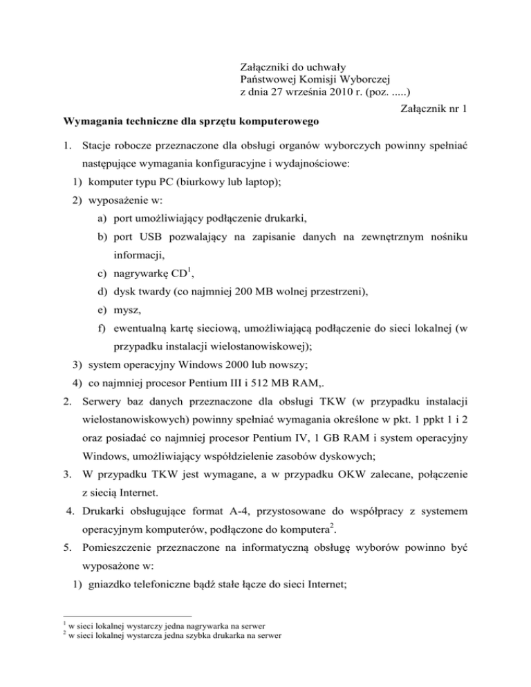 Załączniki do uchwały Państwowej Komisji Wyborczej z dnia 27 września 2010 r. (poz. .....) Załącznik nr 1 Wymagania techniczne dla sprzętu komputerowego 1. Stacje robocze przeznaczone dla obsługi organów wyborczych powinny spełniać następujące wymagania konfiguracyjne i wydajnościowe: 1) komputer typu PC (biurkowy lub laptop); 2) wyposażenie w: a) port umożliwiający podłączenie drukarki, b) port USB pozwalający na zapisanie danych na zewnętrznym nośniku informacji, c) nagrywarkę CD1, d) dysk twardy (co najmniej 200 MB wolnej przestrzeni), e) mysz, f) ewentualną kartę sieciową, umożliwiającą podłączenie do sieci lokalnej (w przypadku instalacji wielostanowiskowej); 3) system operacyjny Windows 2000 lub nowszy; 4) co najmniej procesor Pentium III i 512 MB RAM,. 2. Serwery baz danych przeznaczone dla obsługi TKW (w przypadku instalacji wielostanowiskowych) powinny spełniać wymagania określone w pkt. 1 ppkt 1 i 2 oraz posiadać co najmniej procesor Pentium IV, 1 GB RAM i system operacyjny Windows, umożliwiający współdzielenie zasobów dyskowych; 3. W przypadku TKW jest wymagane, a w przypadku OKW zalecane, połączenie z siecią Internet. 4. Drukarki obsługujące format A-4, przystosowane do współpracy z systemem operacyjnym komputerów, podłączone do komputera2. 5. Pomieszczenie przeznaczone na informatyczną obsługę wyborów powinno być wyposażone w: 1) gniazdko telefoniczne bądź stałe łącze do sieci Internet; 1 2 w sieci lokalnej wystarczy jedna nagrywarka na serwer w sieci lokalnej wystarcza jedna szybka drukarka na serwer 2) zasilanie 220-230 V prądem 6-10 A, z uziemieniem (ewentualnie zerowaniem) i zabezpieczeniem przeciwporażeniowym; 3) stolik i krzesło ergonomiczne dla operatora; 4) dodatkowy stół na dokumenty; 5) dodatkowe oświetlenie ergonomiczne. Załącznik nr 2 Zadania pełnomocnika komisarza wyborczego do spraw obsługi informatycznej 1. Pełnomocnik komisarza wyborczego do spraw obsługi informatycznej jest powoływany przez komisarza i jemu podlega przy wykonywaniu powierzonych mu zadań. 2. Do zadań merytorycznych pełnomocnika komisarza wyborczego do spraw obsługi informatycznej należy: 1) udział w szkoleniach; 2) nadzór nad informatyczną obsługą TKW na obszarze właściwości terytorialnej komisarza oraz szkolenie pełnomocników TKW do spraw obsługi informatycznej w zakresie rejestracji danych oraz obsługi wyborów; 3) rejestracja w systemie informatycznym użytkowników należących do zespołu informatycznej obsługi komisarza wyborczego oraz obsługi TK; 4) nadzór nad generowaniem i dystrybucją oraz zmianą haseł do pobrania licencji dla pełnomocników obsługi informatycznej TKW, operatorów i przewodniczących OKW; 5) nadzór nad generowaniem i dystrybucją oraz zmianą haseł dla przewodniczących i operatorów obsługi informatycznej OKW; 6) nadzór nad wprowadzaniem i aktualizowaniem w systemie informatycznym: a) katalogu obwodów głosowania i okręgów wyborczych oraz ich granic, b) liczby mandatów w radzie (sejmiku województwa) i okręgu wyborczym, c) słowników, d) liczby uprawnionych do głosowania w meldunku przedwyborczym; 7) nadzór nad wprowadzaniem i aktualizowaniem danych dotyczących komitetów wyborczych i kontrola tych danych; 8) nadzór nad wprowadzaniem i aktualizowaniem przez obsługę TKW katalogów list kandydatów na radnych i kandydatów na wójta, burmistrza, prezydenta oraz kontrola tych danych; 9) wprowadzenie do systemu numerów list kandydatów przyznanych przez Państwową Komisję Wyborczą i komisarza; 10) nadzór nad wprowadzaniem do systemu numerów list kandydatów nadanych przez gminne komisje wyborcze; 11) nadzór nad rejestracją składów TKW i OKW oraz kontrola tych danych, ze szczególnym uwzględnieniem zakazu kandydowania przez członków komisji; 12) wspomaganie komisarza w zakresie kontroli poprawności obwieszczeń o zarejestrowanych listach kandydatów do rad i kandydatach na wójta (burmistrza, prezydenta) oraz treści kart do głosowania; 13) nadzór nad dystrybucją (przez koordynatorów z obszaru właściwości komisarza wyborczego) oprogramowania i plików definicyjnych z danymi wyborczymi dla TKW i OKW; 14) monitorowanie poprawności plików definicyjnych z danymi wyborczymi; 15) nadzór nad pracą koordynatora dla obszaru właściwości komisarza wyborczego; 16) nadzór nad wprowadzaniem do systemu informatycznego informacji o liczbie wydanych kart w dniu głosowania; 17) wyrywkowa weryfikacja poprawności arytmetycznych wprowadzanych wyników głosowania w obwodach głosowania wskazanych przez komisarza wyborczego i wszystkich wyników głosowania i wyników wyborów w terytorialnych komisjach wyborczych na podstawie dostarczonych protokołów OKW i TKW; 18) w sytuacji awaryjnej - zapewnienie możliwości wprowadzania danych o wynikach głosowania w obwodach i wynikach wyborów za TKW; 19) przygotowanie projektu obwieszczenia o wynikach wyborów do rad na obszarze województwa (dotyczy pełnomocnika komisarza wyborczego wykonującego zadania o charakterze ogólnowojewódzkim) oraz wyciągów z obwieszczenia, stosownie do właściwości terytorialnej każdego komisarza wyborczego (dotyczy wszystkich pełnomocników komisarzy wyborczych); 20) przygotowanie projektu komunikatu o wynikach wyborów bezpośrednich wójtów, burmistrzów i prezydentów miast w sytuacji, o której mowa w art. 4 ust. 2 ustawy o bezpośrednim wyborze wójta, burmistrza i prezydenta miasta; 21) przygotowanie projektu obwieszczenia o wynikach wyborów bezpośrednich wójtów, burmistrzów i prezydentów miast na obszarze województwa (dotyczy pełnomocnika komisarza wyborczego wykonującego zadania o charakterze ogólnowojewódzkim) oraz wyciągów z obwieszczenia, stosownie do właściwości terytorialnej każdego komisarza wyborczego (dotyczy wszystkich pełnomocników komisarzy wyborczych); 22) współpraca z innymi pełnomocnikami i koordynatorami na obszarze wo