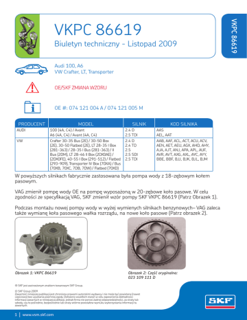 Biuletyn techniczny - Listopad 2009 Audi 100, A6 VW Crafter, LT, Transporter OE/SKF ZMIANA WZORU OE #: 074 121 004 A / 074 121 005 M PRODUCENT MODEL SILNIK KOD SILNIKA AUDI 100 (4A, C4) / Avant A6 (4A, C4) / Avant (4A, C4) 2.4 D 2.5 TDI AAS AEL, AAT VW Crafter 30-35 Bus (2E) / 30-50 Box (2E), 30-50 Flatbed (2E), LT 28-35 I Box (281-363) / 28-35 I Bus (281-363) / II Bus (2DM), LT 28-46 II Box (2DX0AE) / (2DX0FE), 40-55 I Box (291-512) / Flatbed (293-909), Transporter IV Box (70XA) / Bus (70XB, 70XC, 7DB, 7DW) / Flatbed (70XD) 2.4 D 2.4 TD 2.5 2.5 SDI 2.5 TDI AAB, AAF, ACL, ACT, ACU, ACV, AEN, AET, AEU, AGX, AHD, AHY, AJA, AJT, ANJ, APA, APL, AUF, AVR, AVT, AXG, AXL, AYC, AYY, BBE, BBF, BJJ, BJK, BJL, BJM W powyższych silnikach fabrycznie zastosowana była pompa wody z 18-zębowym kołem pasowym. VAG zmienił pompę wody OE na pompę wyposażoną w 20-zębowe koło pasowe. W celu zgodności ze specyfikacją VAG, SKF zmienił wzór pompy SKF VKPC 86619 (Patrz Obrazek 1). Podczas montażu nowej pompy wody w wyżej wymienych silnikach benzynowych– VAG zaleca także wymianę koła pasowego wałka rozrządu, na nowe koło pasowe (Patrz obrazek 2). Obrazek 1: VKPC 86619 Obrazek 2: Część oryginalna: 023 109 111 D ® SKF jest zastrzeżonym znakiem towarowym SKF Group. © SKF Group 2009 Zawartość niniejszej publikacji jest chroniona prawami autorskimi wydawcy i nie może być powielana (nawet częściowo) bez uzyskania pisemnej zgody. Dołożono wszelkich starań w celu zapewnienia dokładności informacji zawartych w niniejszej publikacji, jednak firma nie ponosi żadnej odpowiedzialności, za straty lub szkody, czy to pośrednie, bezpośrednie lub straty wtórne powstałew wyniuku wykorzystania informacji tu zawartych. 1 www.vsm.skf.com VKPC 86619 VKPC 86619