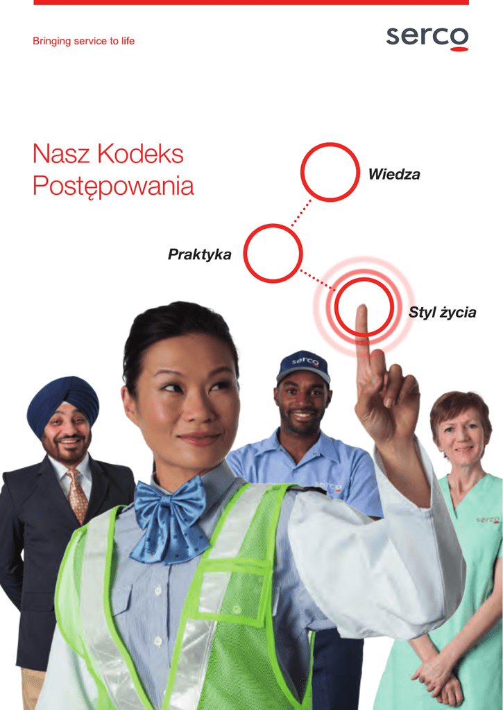 Nasz Kodeks Postępowania Wiedza Praktyka Styl życia Nasz Kodeks Postępowania Spis treści Zawsze będziemy szanować i chronić osoby, które mają odwagę uczynić Kodeks swoim stylem życia 02 Wiadomość od naszego dyrektora generalnego 04 Z asady, na których opiera się nasz Kodeks Nasz Kodeks Postępowania 06 Wiedza 10 Praktyka 12 Styl życia 14 Nasi pracownicy 16 Prawa człowieka 18 Uczciwe traktowanie 20Prześladowanie, nękanie i przemoc 22 Bezpieczne miejsce pracy 24 Zażywanie środków odurzających 26 Nasza firma 28 Nasz międzynarodowy profil 30 Uczciwe rynki 32Współpraca z partnerami i konkurentami 34 Współpraca z innymi 36Zatrudnianie pracowników rządowych i pracowników konkurentów 38 Działalność polityczna 40 Przekupstwo i korupcja 42 Prezenty i wydatki reprezentacyjne 44 Oszustwo 46Wykorzystywanie poufnych informacji 48 Konflikty interesów 50 Praca społeczna 52 Szacunek dla środowiska 54 56 58 60 62 64 66 Nasz Kodeks jako styl życia Co zrobić, jeśli stoisz w obliczu problemu Jeśli nie masz pewności, jak postąpić... 68Skorzystaj z naszego Przewodnika do podejmowania decyzji 70Lub wypróbuj zestaw narzędzi SayNo Jeśli masz pytanie lub coś Cię niepokoi... 72 Tutaj znajdziesz odpowiedź Jeśli wydaje Ci się, że coś należy zgłosić... 74Radzimy, jak korzystać z naszego procesu zgłaszania Speak Up Nasze informacje Informacje poufne Zabezpieczanie informacji Korzystanie z naszych systemów Media społecznościowe Komunikacja zewnętrzna Portal OurWorld Wszystkie dokumenty wymienione w naszym Kodeksie stanowią część systemu zarządzania firmy Serco (Serco Management System — SMS). Można je znaleźć w portalu OurWorld pod nagłówkiem The way we work/ Serco Management System. Jeśli nie masz dostępu do portalu OurWorld, zapytaj swojego przełożonego, w jaki sposób możesz uzyskać kopie tych dokumentów. 01 Nasz Kodeks Postępowania Witamy Firma Serco powinna być organizacją, która zawsze postępuje właściwie. Organizacją, która dotrzymuje obietnic złożonych swoim klientom i dba o ich interesy, a której pracownicy czują się pewni, obdarzeni zaufaniem i szacunkiem. Traktuj innych w sposób, w jaki sam(a) chciał(a)byś być traktowany(a). Innymi słowy nasza firma powinna być miejscem, z którego wszyscy jesteśmy dumni. Jak możemy tego dokonać? Odpowiedź nie tkwi w pięknych słowach, ale w sposobie, w jaki codziennie zachowujemy się w stosunku do naszych klientów, współpracowników, dostawców I szerszej społeczności. Jedno powiedzenie, o którym warto pamiętać podczas wykonywania swoich codziennych obowiązków służbowych w firmie Serco, to „Nie czyń drugiemu, co Tobie niemiłe“. Traktuj innych w sposób, w jaki sam(a) chciał(a)byś być traktowany(a). Jednak pojedyncze zdanie to za mało, aby dostarczać nam porad w każdej sytuacji. W związku z tym pragnę przedstawić nasz Kodeks Postępowania. Kodeks został stworzony, aby pomóc nam zrozumieć standardy i zachowania, których oczekuje się od pracowników firmy Serco. Mówiąc o wyznaczaniu nam wszystkim najwyższych standardów zachowania, mówię całkowicie poważnie. Dobre systemy i procedury oraz inteligentne propozycje handlowe nie mają znaczenia, jeśli nasi klienci i współpracownicy nie darzą nas zaufaniem. Niektórzy myślą, że firmy są nieszczere — deklarują jedno, a postępują inaczej. W naszej firmie tak nie będzie, nie za mojej kadencji. Proszę, abyście zapoznali się z treścią naszego Kodeksu Postępowania i postępowali zgodnie z jego zasadami, a zawsze będziecie mogli liczyć na moje wsparcie. Podstawami naszej firmy będą zaufanie, szacunek, energia, entuzjazm, zaangażowanie oraz dotrzymywanie obietnic. Rupert Soames, Oficer Orderu Imperium Brytyjskiego (OBE) dumny dyrektor generalny Serco Group plc 02 03 Zasady, na których opiera się nasz Kodeks Nasz Kodeks Postępowania Dotrzymujemy obietnic Chcemy być znani i obdarzeni zaufaniem jako najlepsza na świecie firma usługowa, która pozytywnie wpływa na życie ludzi. W związku z tym mamy zestaw Obowiązujących Zasad, które określają ważne dla nas sprawy oraz zachowania, których należy oczekiwać na terenie całej firmy Serco. Wszyscy musimy postępować zgodnie z tymi zasadami w kontaktach z współpracownikami, klientami, dostawcami, partnerami, akcjonariuszami i społecznościami, którym służymy. Wspieramy kulturę przedsiębiorczości Zależy nam na prowadzeniu innowacyjnej i przynoszącej sukcesy działalności. Odnieśliśmy sukces, zachęcając i generując nowe pomysły. Ufamy, że nasi pracownicy są w stanie dobrze wywiązywać się ze swoich zadań. Pozytywnie podchodzimy do zmian i podejmując wyważone ryzyko zachęcamy do kreatywnego myślenia. 04 Wspieramy kulturę przedsiębiorczości Budujemy zaufanie i szacunek Pomagamy pracownikom osiągać doskonałość Pomagamy pracownikom osiągać doskonałość Nasze sukcesy biorą się z zaangażowania i energii, dzięki którym robimy więcej niż inni. Jesteśmy w stosunku do siebie odpowiedzialni i możemy liczyć na wsparcie wtedy, kiedy najbardziej go potrzebujemy. Oczekujemy, że nasi pracownicy będą osiągać więcej dzięki rozpoznawaniu i wykorzystywaniu mocnych stron poszczególnych osób. Cenimy w ludziach wiedzę, a także pomysły oraz wnoszony przez nich potencjał, który pomaga osiągać sukcesy. Dotrzymujemy obietnic Budujemy zaufanie i szacunek Postępujemy zgodnie z obietnicami i spełniamy oczekiwania. Nie składamy obietnic, których nie możemy dotrzymać. Jeśli zdarzy nam się popełnić błąd, naprawiamy go. Stawiamy sobie jasne cele i spodziewamy się uczciwego zysku. Budujemy szacunek, działając w bezpieczny, społecznie odpowiedzialny, konskwentny i uczciwy sposób. Zawsze zwracamy uwagę na bezpieczeństwo, a także działamy w etyczny i odpowiedzialny sposób. Słuchamy innych, w ten sposób traktując ich tak, jak sami chcielibyśmy być traktowani. Ni