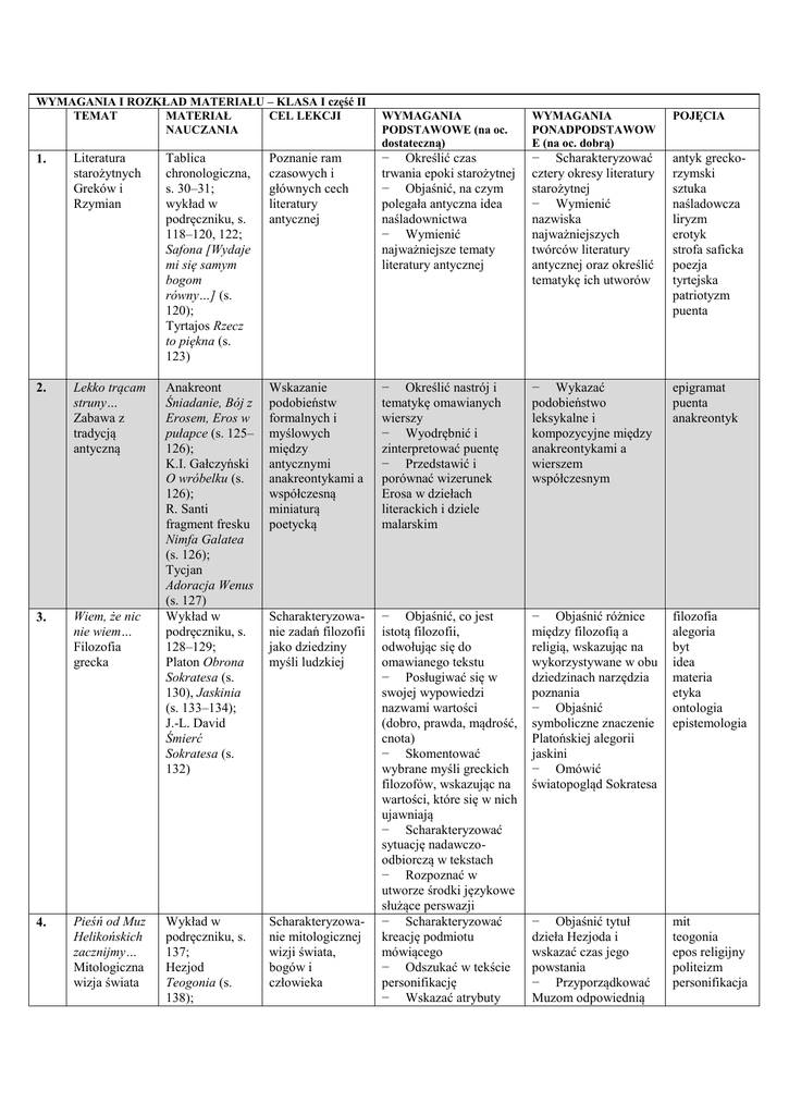 WYMAGANIA I ROZKŁAD MATERIAŁU – KLASA I część II TEMAT MATERIAŁ CEL LEKCJI NAUCZANIA WYMAGANIA PODSTAWOWE (na oc. dostateczną) WYMAGANIA PONADPODSTAWOW E (na oc. dobrą) POJĘCIA 1. Literatura starożytnych Greków i Rzymian Tablica chronologiczna, s. 30–31; wykład w podręczniku, s. 118–120, 122; Safona [Wydaje mi się samym bogom równy…] (s. 120); Tyrtajos Rzecz to piękna (s. 123) Poznanie ram czasowych i głównych cech literatury antycznej − Określić czas trwania epoki starożytnej − Objaśnić, na czym polegała antyczna idea naśladownictwa − Wymienić najważniejsze tematy literatury antycznej − Scharakteryzować cztery okresy literatury starożytnej − Wymienić nazwiska najważniejszych twórców literatury antycznej oraz określić tematykę ich utworów antyk greckorzymski sztuka naśladowcza liryzm erotyk strofa saficka poezja tyrtejska patriotyzm puenta 2. Lekko trącam struny… Zabawa z tradycją antyczną Wskazanie podobieństw formalnych i myślowych między antycznymi anakreontykami a współczesną miniaturą poetycką − Określić nastrój i tematykę omawianych wierszy − Wyodrębnić i zinterpretować puentę − Przedstawić i porównać wizerunek Erosa w dziełach literackich i dziele malarskim − Wykazać podobieństwo leksykalne i kompozycyjne między anakreontykami a wierszem współczesnym epigramat puenta anakreontyk 3. Wiem, że nic nie wiem… Filozofia grecka Anakreont Śniadanie, Bój z Erosem, Eros w pułapce (s. 125– 126); K.I. Gałczyński O wróbelku (s. 126); R. Santi fragment fresku Nimfa Galatea (s. 126); Tycjan Adoracja Wenus (s. 127) Wykład w podręczniku, s. 128–129; Platon Obrona Sokratesa (s. 130), Jaskinia (s. 133–134); J.-L. David Śmierć Sokratesa (s. 132) Scharakteryzowanie zadań filozofii jako dziedziny myśli ludzkiej − Objaśnić różnice między filozofią a religią, wskazując na wykorzystywane w obu dziedzinach narzędzia poznania − Objaśnić symboliczne znaczenie Platońskiej alegorii jaskini − Omówić światopogląd Sokratesa filozofia alegoria byt idea materia etyka ontologia epistemologia 4. Pieśń od Muz Helikońskich zacznijmy… Mitologiczna wizja świata Wykład w podręczniku, s. 137; Hezjod Teogonia (s. 138); Scharakteryzowanie mitologicznej wizji świata, bogów i człowieka − Objaśnić, co jest istotą filozofii, odwołując się do omawianego tekstu − Posługiwać się w swojej wypowiedzi nazwami wartości (dobro, prawda, mądrość, cnota) − Skomentować wybrane myśli greckich filozofów, wskazując na wartości, które się w nich ujawniają − Scharakteryzować sytuację nadawczoodbiorczą w tekstach − Rozpoznać w utworze środki językowe służące perswazji − Scharakteryzować kreację podmiotu mówiącego − Odszukać w tekście personifikację − Wskazać atrybuty − Objaśnić tytuł dzieła Hezjoda i wskazać czas jego powstania − Przyporządkować Muzom odpowiednią mit teogonia epos religijny politeizm personifikacja bogów przedstawionych we fragmencie N. Poussin Parnas (s. 139); G. Klimt Pallas Atena (s. 141) 5. Klasyczne piękno – Apollo Sauroktonos Praksytelesa dziedzinę sztuki, posługując się dostępnymi źródłami wiedzy − Określić relacje między człowiekiem a bogami przedstawioną w dziele − Objaśnić symbolikę jaszczurki oraz określić funkcje wykorzystanego motywu w dziele rzeźbiarskim − Scharakteryzować zastosowane w rzeźbie środki służące wyrażaniu emocji i prezentacji postaci Wykład w podręczniku, s. 142–143; Poliklet Doryforos (s. 142); Praksyteles Apollo zabijający jaszczurkę (Sauroktonos) (s. 143) J. Pasierb Sauroktonos (s. 145) Opisanie posągu Apolla jako wzorowego przykładu sztuki antycznej − Opisać postać boga oraz sytuację przedstawioną przez rzeźbiarza − Określić proporcje ciała przedstawionej postaci − Wskazać, w jaki sposób została podkreślona boskość wyrzeźbionego Określenie relacji pomiędzy rzeźbiarskim a literackim przedstawieniem tego samego motywu − Wskazać w wierszu nawiązania do dzieła rzeźbiarskiego − Określić funkcję motta i tytułu wiersza − Scharakteryzować sytuację liryczną w wierszu − Zaproponować i uzasadnić własną interpretację tekstu poetyckiego − Opowiedzieć dzieje boga − Wykazać niejednoznaczność mitologicznego wizerunku boga, odwołując się również do dzieła malarskiego − Scharakteryzować pojmowanie sprawiedliwości w starożytnych Atenach − Przywołać kanoniczną wersję mitu o Apollu i Marsjaszu − Wskazać główny temat poetyckiej opowieści Herberta − Opisać sytuację przedstawioną w utworze − Scharakteryzować postawy Apolla i Marsjasza − Wskazać związki pomiędzy religią starożytnych a ich prawodawstwem − Określić hierarchię wartości społeczeństwa starożytnej Grecji 6. Apollo między mrokiem a światłem. Wina i oczyszczenie w kulturze greckiej Z. Kubiak Apollo między mrokiem a światłem (s. 146–147); Apollo belwederski (s. 147); G. Moreau Apollo i Boreasz (s. 148) Poznanie świata wartości antycznej Grecji 7. Ponad wytrzymałość boga… Pojedynek boskości i człowieczeństwa J. Parandowski Marsjasz (s. 150–151); Z. Herbert Apollo i Marsjasz (s. 152–153); J. de Ribera Apollo i Marsjasz (s. 151) Interpretacja poezji Herberta jako dialogu z kulturą europejską 8. Tak wielki był jej smutek… Cierpienie w mitologii greckiej. Wykład w podręczniku, s. 156–157; Do Demeter (s. 157–158); D.G. Rossetti Prozerpina (s. Interpretacja archetypicznego sensu mitu o Demeter i Korze − Opowiedzieć historię Demeter i Kory − Scharakteryzować obie bohaterki przedstawione w hymnie, zwracając uwagę na przeżywane przez nie − Objaśnić, na czym polega i czemu służy połączenie w utworze rzeczowości relacji i obrazowania naturalistycznego − Porównać obrazy boskości i człowieczeństwa ukazane w wierszu − Ocenić postawę Apolla − Samodzielnie zinterp