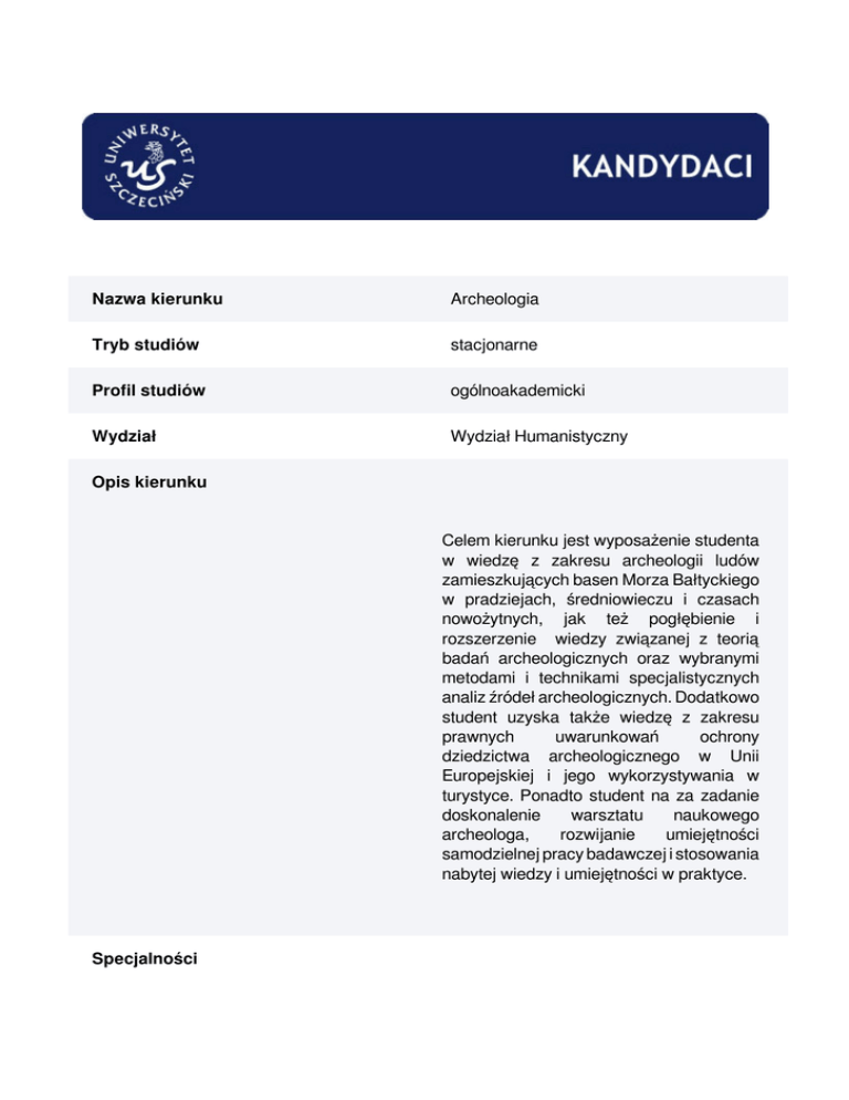 Nazwa kierunku Archeologia Tryb studiów stacjonarne Profil