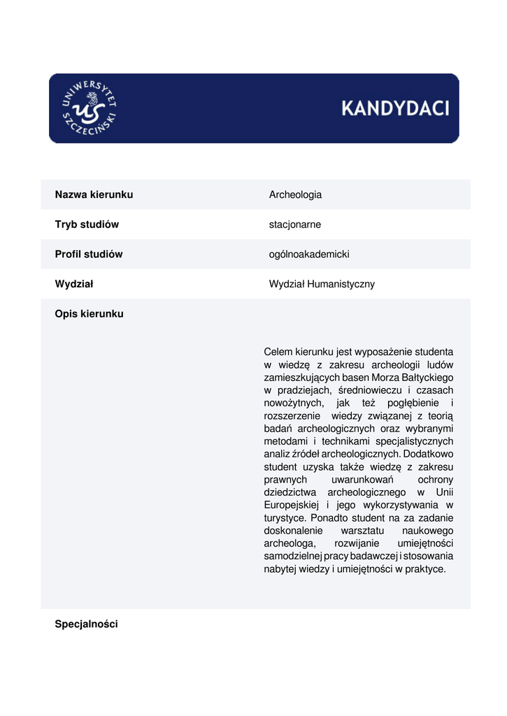 Nazwa kierunku Archeologia Tryb studiów stacjonarne Profil studiów ogólnoakademicki Wydział Wydział Humanistyczny Opis kierunku Celem kierunku jest wyposażenie studenta w wiedzę z zakresu archeologii ludów zamieszkujących basen Morza Bałtyckiego w pradziejach, średniowieczu i czasach nowożytnych, jak też pogłębienie i rozszerzenie wiedzy związanej z teorią badań archeologicznych oraz wybranymi metodami i technikami specjalistycznych analiz źródeł archeologicznych. Dodatkowo student uzyska także wiedzę z zakresu prawnych uwarunkowań ochrony dziedzictwa archeologicznego w Unii Europejskiej i jego wykorzystywania w turystyce. Ponadto student na za zadanie doskonalenie warsztatu naukowego archeologa, rozwijanie umiejętności samodzielnej pracy badawczej i stosowania nabytej wiedzy i umiejętności w praktyce. Specjalności brak Kryteria kwalifikacji Do postępowania kwalifikacyjnego mogą przystąpićosobylegitymującesiędyplomem ukończenia studiów co najmniej pierwszego stopnia. Kryterium kwalifiakcji jest ocena na dyplomie.Ukończonykierunekstudiówmusi mieścić się w następujących obszarach wiedzy: obszar nauk humanistycznych. Na studia II stopnia przyjmowani będą absolwenci studiów I stopnia na kierunku archeologia o ile przewidziany limit nie zostanie wypełniony, w dalszej kolejności przyjmowani będą absolwenci studiów I stopnia lub jednolitych studiów magisterskich na kierunkach: historia, etnologia, etnografia, historia sztuki, geografia, geologia, turystyka, kulturoznastwo. O kolejności na liście obecności decyduje ocena na dyplomie. Przykładowe przedmioty Laboratorium archeologiczne - Kartografia i dane przestrzenne w archeologii, Słowianie nadbałtyccy, Normanowie i ich sąsiedzi we wczesnym średniowieczu, Archeologia Bałtyku - badania podwodne i krajobrazy zatopione, Archeoturystyka, Archeologia współczesności Możliwości zatrudnienia Wiedza, umiejętności i kompetencje społeczne zdobyte w trakcie studiów pozwalająabsolwentowiarcheologiiubiegać się o zatrudnienie w: - uczelniach wyższych, - instytucjach naukowych, - muzeach, - prywatnych firmach archeologicznych, - Wojewódzkich Zabytków, Urzędach Ochrony - instytucjach samorządowych zajmujących się ochroną dziedzictwa kulturowego, popularyzacją regionu i turystyką, - innych instytucjach związanych z ochroną dziedzictwa narodowego. Kontynuacja nauki Absolwenci studiów II stopnia na kierunku Archeologia,mogąkontynuowaćkształcenie na: - 3. stopniu studiów archeologicznych, - studiach podyplomowych w zakresie ochrony i konserwacji dziedzictwa kulturowego, - innych kierunkach studiów związanych z tematyką ochrony dziedzictwa kulturowego, historią sztuki, naukami społecznymi, naukami geograficznymi, Terminy Terminy postępowania rekrutacyjnego na studia stacjonarne i niestacjonarne na rok akademicki 2017/2018 w przygotowaniu. Dokumenty Kandydaci zakwalifikowani do II etapu postępowania rekrutacyjnego na wszystkie kierunki i specjalności studiów w Uniwersytecie Szczecińskim mają obowiązek złożenia kompletu dokumentów. Wykaz dokumentów w przygotowaniu. Olimpiady dla tego kierunku Opłaty Wysokość opłaty rekrutacyjnej w postępowaniu na rok akademicki 2016/2017 wynosiła 85 zł. Dodatkowe informacje Kontakt Masz pytania? [email protected] Biuro ds. Rekrutacji tel.: +48 91 444 10 29, +48 91 444 10 31, +48 91 444 11 60 Powered by TCPDF (www.tcpdf.org)