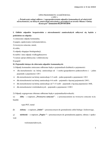 Załącznik nr 8 do SIWZ OPIS PRZEDMIOTU ZAMÓWIENIA ( OPZ ) „ Świadczenie usługi odbioru i zagospodarowania odpadów komunalnych od właścicieli nieruchomości, na których zamieszkują mieszkańcy, powstałych na terenie Miasta i Gminy Koniecpol” oznaczone AO.ZP/7/07/2016 I. Odbiór odpadów bezpośrednio z nieruchomości zamieszkałych odbywać się będzie z podziałem na odpady: 1) zmieszane odpady komunalne, 2) papier, opakowania wielomateriałowe, 3) tworzywa sztuczne, metal, 4) szkło, 5) odpady ulegające biodegradacji, 6) meble i inne odpady wielkogabarytowe 7) zużyty sprzęt elektryczny i elektroniczny 8) popiół II. Pojemniki służące do zbierania odpadów komunalnych: 1) Odpady komunalne zmieszane odbierane będą w pojemnikach (kubłach) o pojemności: dla nieruchomości na której zamieszkuje od 1 osoba (gospodarstwo jednoosobowe ) – jeden pojemnik o pojemności 120 l dla nieruchomości na której zamieszkuje 2-3 osób – jeden pojemnik o pojemności 120 l dla nieruchomości na której zamieszkuje 4-6 osób – pojemnik o łącznej pojemności 240 l, dla nieruchomości na której zamieszkuje od 7-15 osób – pojemnik o łącznej pojemności 360l, dla nieruchomości wielolokalowych – pojemnik o pojemności 1100 l 2) Odpady segregowane zbierane odbierane będą w pojemnikach(workach): żółty – z napisem „Tworzywa sztuczne” - z przeznaczeniem na tworzywa sztuczne m.in. butelki typu PET, metal zielony – z napisem „Szkło” – przeznaczonym do gromadzenia szkła białego i kolorowego, niebieski - z napisem „Papier ” – przeznaczonym do gromadzenia papieru, tektury i opako- wań wielomateriałowych, 1 Załącznik nr 8 do SIWZ brązowy – z napisem „Bioodpady” – z przeznaczeniem na odpady biodegradowalne, szary - z napisem „Popiół” - z przeznaczeniem na gromadzenie popiołu ; 3) Odpady komunalne segregowane należy gromadzić w pojemnikach (workach) uwzględniając następujące normy dla wyżej opisanych frakcji: 1. dla nieruchomości na której zamieszkuje 1 osoba (gospodarstwo jednoosobowe) – jeden po- jemnik (worek) o pojemności 120 l na zbieranie każdej frakcji odpadów selektywnie zebranych , 2. dla nieruchomości na której zamieszkuje od 2 –3 osób – jeden pojemnik (worek) o pojemności 120 l na zbieranie każdej frakcji odpadów selektywnie zebranych, 3. dla nieruchomości na której zamieszkuje od 4- 6 osób - pojemniki (worki) o łącznej pojemno- ści 240 l na zbieranie każdej frakcji odpadów selektywnie zebranych, 4. dla nieruchomości na której zamieszkuje od 7-15- osób - pojemniki (worki) o łącznej pojem- ności 360 l na zbieranie każdej frakcji odpadów selektywnie zebranych, 5. dla nieruchomości wielolokalowych– jeden pojemnik o pojemności 1100 l na zbieranie każdej frakcji odpadów III. Częstotliwość odbioru odpadów komunalnych z nieruchomości: Częstotliwość odbierania odpadów komunalnych z terenu nieruchomości określa poniższa tabela: RODZAJ ODPADU NIERUCHOMOŚC NIERUCHOMOSCI NIERUCHOMOŚC I ZAMIESZKAŁE ZAMIESZKAŁE I ZAMIESZKAŁE W ZABUDOWIE W ZABUDOWIE W ZABUDOWIE JEDNORODZINN WIELOLOKALOWE JEDNORODZINN EJ (teren miasta) J EJ (teren wiejski) Odpady komunalne 1 x 2 tygodnie zmieszane w miesiącach 1 x tydzień 1 x miesiąc kwiecień-październik, 1 x m-c w miesiącach listopad- marzec Papier 1 x miesiąc 1 x miesiąc 1 x miesiąc Tworzywo sztuczne 1 x miesiąc 2 x miesiąc 1 x miesiąc 2 Załącznik nr 8 do SIWZ Szkło Odpady biodegradowalne 1 x 2 miesiące 1 x 2 tygodnie 2 x miesiąc 1 x 2 miesiące 1 x tydzień 1 x miesiąc X 1 x m-c w miesiącach w miesiącach kwiecień-październik, 1 x m-c w miesiącach listopad- marzec , Popiół 1 x m-c w miesiącach listopad-marzec , 1 x listopad-marzec , 1 x 2 m-ce w miesiącach 2 m-ce w miesiącach kwiecień-październik kwiecień-październik Odpady wielkogabarytowe w tym problemowe oraz zużyty sprzęt elektryczny oraz elektroniczny będą odbierane z posesji dwa razy w roku (wiosna, jesień) . W zakresie zamówienia jest : - odbiór i zagospodarowanie zmieszanych odpadów komunalnych , odpadów biodegradowalnych i popiołu , - odbiór odpadów segregowanych : papier, opakowania wielomateriałowe , tworzywa sztuczne , metal , szkło i przekazanie ich do gminnej sortowni odpadów zlokalizowanej w Koniecpolu przy ul. Słowackiego (dawne składowisko odpadów), - odbiór i zagospodarowanie mebli i innych odpadów wielkogabarytowych oraz zużytego sprzętu elektrycznego i elektronicznego , przekazanych przez właścicieli nieruchomości położonych na terenie Miasta Koniecpol, na których zamieszkują mieszkańcy, i Gminy Szacunkowe zapotrzebowanie na pojemniki ( kubły) na odpady zmieszane – przyjmując założenia zawarte w Regulaminie utrzymania czystości … : Pojemniki na odpady zmieszane : - ilość pojemników o pojemności 120 l – 1 650 szt , - ilość pojemników o pojemności 240 l – 730 szt , - ilość pojemników o pojemności 1100 l – 40 szt ; Zapotrzebowanie na pojemniki (worki) na odpady segregowane - przyjmując założenia zawarte w Regulaminie utrzymania czystości … : 1. Pojemniki na odpady segregowane : - ilość pojemników na szkło o pojemności 80 l – 2 300 szt , - ilość pojemników na popiół o pojemności 120 l – 2 300 szt ; 3 Załącznik nr 8 do SIWZ 2. Worki na odpady segregowane : – – – worki kolor żółty 120 l – 35 500 szt worki kolor niebieski 120 l – 35 500 szt worki kolor brązowy 120 l – 56 500 szt Podane wielkości są wielkościami szacunkowymi i mogą ulec zmianie w trakcie obowiązywania umowy. Wymagania jakościowe worków do selektywnej zbiórki odpadów: - materiał – folia polietylenowa LDPE, - pojemność – min 120 dm3 w kolorach i nadruku zgodnie z frakcjami odpadów, - grubość – min. 30 mikronów ; Uwaga worki na odpady zbierane selektywnie Wykonawca zobowiązany jest dostarczać do poszczególnych gospodarstw domowych regularnie w dniu odbioru odpadów 