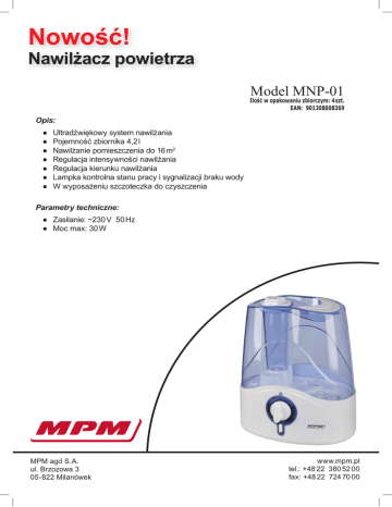 Nowość! Nawilżacz powietrza Model MNP-01 Ilość w opakowaniu zbiorczym: 4 szt. EAN: 901308008369 Opis: ●● ●● ●● ●● ●● ●● ●● Ultradźwiękowy system nawilżania Pojemność zbiornika 4,2 l Nawilżanie pomieszczenia do 16 m2 Regulacja intensywności nawilżania Regulacja kierunku nawilżania Lampka kontrolna stanu pracy i sygnalizacji braku wody W wyposażeniu szczoteczka do czyszczenia Parametry techniczne: ●● Zasilanie: ~230 V 50 Hz ●● Moc max: 30 W MPM agd S.A. ul. Brzozowa 3 05-822 Milanówek www.mpm.pl tel.: +48 22 380 52 00 fax: +48 22 724 70 00