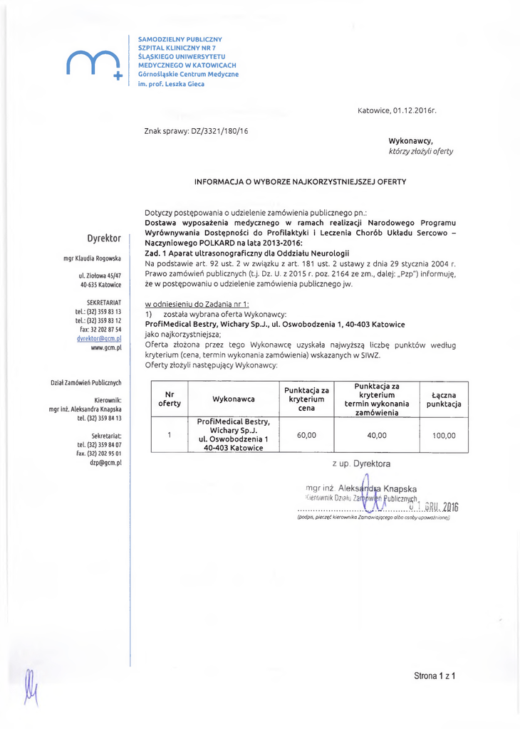 m SA M O D ZIE LN Y PUBLICZNY SZPIT AL KLINICZN Y N R 7 ŚLĄ SK IEG O UNIW ERSYTETU M ED Y CZN EG O W KATOW ICACH Górnośląskie Centrum Medyczne im. prof. Leszka Gieca Katowice, 01.12.2016r. Znak sprawy: DZ/3321/180/16 Wykonawcy, którzy złożyli oferty IN F O R M A C JA O W Y B O R Z E N AJK O RZYST N IEJSZEJ OFERTY Dyrektor mgr Klaudia Rogowska ul. Ziołowa 45/47 40-635 Katowice SEKRETARIAT tel.: (32) 359 83 13 teL: (32) 359 83 12 Fax: 32 202 87 54 dvrektor(5)qcm.ol www.gcm.pl Dotyczy postępow ania o udzielenie zamówienia publicznego pn.: D ostaw a wyposażenia medycznego w ramach realizacji N arodow ego Programu W yrównywania Dostępności do Profilaktyki i Leczenia Chorób Układu Sercowo N aczyniowego P O LK A R D na lata 2013-2016: Zad. 1 Aparat ultrasonograficzny dla Oddziału Neurologii Na podstaw ie art. 92 ust. 2 w związku z art. 181 ust. 2 ustawy z dnia 29 stycznia 2004 r. Praw o zamówień publicznych (t.j. Dz. U. z 2015 r. poz. 2164 ze zm., dalej: „Pzp") informuję, że w postępow aniu o udzielenie zamówienia publicznego jw. w odniesieniu do Zadania nr 1: 1) została wybrana oferta Wykonawcy: ProfiM edical Bestry, Wichary Sp.J., ul. O sw obodzenia 1, 40-403 Katowice jako najkorzystniejsza; Oferta złożona przez tego W ykonawcę uzyskała najwyższą liczbę punktów według kryterium (cena, termin wykonania zamówienia) wskazanych w SIWZ. Oferty złożyli następujący Wykonawcy: Dział Zamówień Publicznych Kierownik: mgr inż. Aleksandra Knapska tel. (32) 359 8413 Sekretariat tel. (32) 359 84 07 fax. (32) 202 95 01 [email protected] Nr oferty Wykonawca Punktacja za kryterium cena Punktacja za kryterium termin wykonania zamówienia Łączna punktacja 1 ProfiMedical Bestry, Wichary Sp.J. ul. O sw obodzenia 1 40-403 Katowice 60,00 40,00 100,00 z up. D y re k to ra m g r in ż. A le k s in ld s a K n a p s k a Kierownik Działu Zarrpw p Publicznych ....................... ................. 5 . .1. GRU... .21)16 (podpis, pieczęć kierownika Zamawiającego albo osoby upoważnionej) Strona 1 z 1