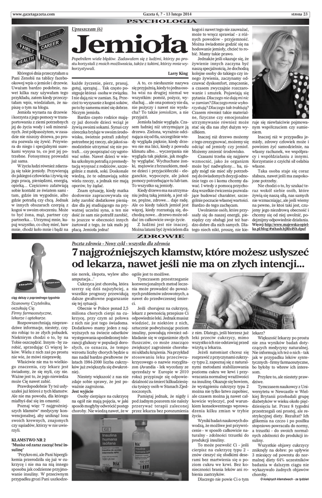 www.gazetagazeta.com Gazeta 6, 7 - 13 lutego 2014 strona 23 PSYCHOLOGIA Upraszczam (6) Jemioła Popełniłem wiele błędów. Zadawałem się z ludźmi, którzy po prostu korzystali z moich możliwościa, także z takimi, którzy mnie wykorzystywali. Któregoś dnia przeczytałam u Larry King Pani Zenobii na tablicy facebookowej wpis o jemiole i drzewie. każde życzenie, pierz, prasuj, A to, co niesłusznie nazywa Uważam bardzo podobnie, na- gotuj, sprzątaj… Tak często po- się przyjaźnią, kiedy to jedna osowet kilka razy używałam tego stępuje któraś osoba w związku. ba wisi na drugiej niemal we przykładu, zatem kiedy przeczy- I nie dają nic w zamian. Są. Prze- wszystkim: pomóż, pożycz, wytałam wpis, wiedziałam, że na- cież to wysysanie z kogoś soków, słuchaj… ale ona pomocy nie da, piszę o tym na blogu. po to by samemu mieć się dobrze. nie pożyczy i nawet nie wysłu Jemioła wyrasta na drzewie Niczym jemioła. cha? To także jemiolizm, a nie i korzysta z jego pomocy w transprzyjaźń. Bardzo często rodzice mająportowaniu z ziemi potrzebnych cy już dorosłe dzieci wciąż je Jemioła ładnie wygląda. Czajej do życia wody i soli mineral- żywią swoimi sokami. Synuś czy sem ładniej niż utrzymujące ją nych. Jest półpasożytem, w zasa- córeczka bryluje w swoim środo- drzewo. Zielona, wyraźnie odcidzie nie niszczy drzewa, po pro- wisku, świetnie potrafi zdobyć nająca się od tła, szczególnie wtestu pozwala się żywić. Przywie- potrzebne jej rzeczy, ale jakoś sa- dy wygląda pięknie, kiedy drzera do niego i specjalnymi ssaw- modzielnie utrzymać się nie po- wo nie ma liści, kiedy z powodu kami wysysa to, co jest jej po- trafi… czy posprzątać czy ugoto- klimatu albo… wyczerpania nie trzebne. Fotosyntezę prowadzi wać sobie. Nawet dzieci w wie- wygląda tak pięknie, jak mogłojuż sama. ku szkolnym potrafią z premedy- by wyglądać. Wychuchane żonW życiu ludzi również zdarza- tacją wysysać z rodziców, szcze- ki, mężowie z brzuszkiem, modją się takie jemioły. Przywierają gólnie z matek, soki. Doskonale ne dzieci i przyjaciółeczki - eledo jakiegoś człowieka i żywią się wiedzą, że te odmawiają sobie ganckie, wypoczęte, ale jakoś jego pracą, pieniędzmi, energią, wielu rzeczy, a jednak nie mają pomocy potrzebujące tu lub tam. opieką… Częściowo załatwiają oporów, by żądać. To wszystko są jemioły. sobie kontakt ze światem sami Kiedy drzewo ma na utrzymaZnam sytuację, kiedy matka tam, gdzie im wygodnie, albo dosłownie zapracowywała się niu jedną taką jemiołę, a jest silgdzie potrafią czy chcą. Jednak żeby zarobić dodatkowe pienią- ne, prężne, zdrowe… daje radę. w innych obszarach czerpią z dze dla jej studiującego na pry- Ale co kiedy takich jemioł jest kogoś w swoim otoczeniu. Może watnej uczelni syna, a ten nie więcej, kiedy rozrastają się, doto być żona, mąż, partner czy dość że sam nie potrafił zarobić, chodzą nowe…drzewo może odpartnerka… Utrzymuj mnie, ku- to jeszcze w obecności innych dać im całkowicie swoje życie. puj wszystko, co chcę mieć, baw żartował z tego, że tak mało jej Z ludźmi jest nie inaczej. mnie, chodź koło mnie i bądź na płacą.Jemioła jedna! Można latami być żywicielem dla kogoś i nawet tego nie zauważać, może to wręcz sprawiać - z różnych powodów - przyjemność. Można świadomie godzić się na hodowanie jemioły, chcieć to robić. Mamy takie prawo. Jednakże jeśli okazuje się, że żywienie innych zaczyna być naszą specjalnością, że dochodzą kolejne osoby do takiego czy innego żywienia, zaczynamy odczuwać dyskomfort, zmęczenie, a czasem zwyczajnie rozczarowanie i smutek. Pojawiają się pytania: Dlaczego nie dają mi nic w zamian? Dlaczego mnie wykorzystują? Dlaczego tak traktują? Czasem również takie materialne, fizyczne czy emocjonalne utrzymywanie również może stać się dla nas zbyt dużym wysiłkiem. Inaczej niż drzewo możemy z tego zrezygnować, możemy się odciąć od jemioły czy jemioł. Możemy zmienić środowisko. Czasami trzeba się najpierw wzmocnić, jako że organizm może być nadwątlony… ba, nigdy mógł nie mieć siły potrzebnej do świadomych decyzji odnośnie tego co i komu chcemy dawać. I wtedy z pomocą przychodzą wszelkie ćwiczenia pozwalające budować charakter, szczególnie poczucie własnej wartości. Bardzo do tego zachęcam. Uwolnienie osób, które przyssały się do naszej energii, pieniędzy czy obsługi jest też bardzo dobre dla nich samych. Dlatego niech nikt, proszę, nie kie- ruje się niewłaściwie pojmowanym współczuciem czy sumieniem. Inaczej niż w przypadku jemioły, zdrowy człowiek może i powinien żyć samodzielnie, na własny rachunek, we współpracy i współdziałaniu z innymi. Korzystanie z czyichś sił osłabia własne. Taka osoba staje się coraz słabsza, nawet jeśli ma zaspokojone potrzeby. Nie chodzi o to, by szukać teraz wokół siebie osób, które żywią się naszą siłą, nas samych nie wzmacniając, ale jeśli wiemy na pewno, że ktoś taki jest, czujemy jego niezdrową obecność i chcemy się od niej uwolnić, podejmijmy odpowiednie działania. Więcej: http://www.majewska-opielka.pl/blog/#sthash.bjRls4Sh.dpuf ZDROWIE Poczta zdrowia - Nowy cykl - wszystko dla zdrowia 7 najgroźniejszych kłamstw, które możesz usłyszeć od lekarza, nawet jeśli nie ma on złych intencji... ciąg dalszy z poprzednego tygodnia Szanowny Czytelniku, oszukują Cię. Firmy farmaceutyczne, lekarze i aptekarze. Rozpowszechniają nieprawdziwe informacje, niestety, często robiąc to ze złych pobudek. Niektórym chodzi o to, by na Tobie oszczędzić. Innym - by zarobić, sprzedając Ci więcej leków. Wielu z nich zaś po prostu nie wie, że mówi nieprawdę. Właściwie nie ma to wielkiego znaczenia, czy lekarz jest świadomy, że się myli, czy nie. Ważne jest to, że jego niewiedza może Cię nawet zabić. Prawdopod