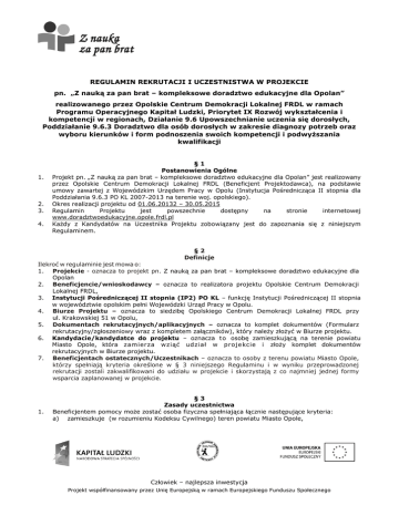REGULAMIN REKRUTACJI I UCZESTNISTWA W PROJEKCIE pn. „Z nauką za pan brat – kompleksowe doradztwo edukacyjne dla Opolan” realizowanego przez Opolskie Centrum Demokracji Lokalnej FRDL w ramach Programu Operacyjnego Kapitał Ludzki, Priorytet IX Rozwój wykształcenia i kompetencji w regionach, Działanie 9.6 Upowszechnianie uczenia się dorosłych, Poddziałanie 9.6.3 Doradztwo dla osób dorosłych w zakresie diagnozy potrzeb oraz wyboru kierunków i form podnoszenia swoich kompetencji i podwyższania kwalifikacji 1. 2. 3. 4. §1 Postanowienia Ogólne Projekt pn. „Z nauką za pan brat – kompleksowe doradztwo edukacyjne dla Opolan” jest realizowany przez Opolskie Centrum Demokracji Lokalnej FRDL (Beneficjent Projektodawca), na podstawie umowy zawartej z Wojewódzkim Urzędem Pracy w Opolu (Instytucja Pośrednicząca II stopnia dla Poddziałania 9.6.3 PO KL 2007-2013 na terenie woj. opolskiego). Okres realizacji projektu od 01.06.20132 – 30.05.2015 Regulamin Projektu jest powszechnie dostępny na stronie internetowej www.doradztwoedukacyjne.opole.frdl.pl Każdy z Kandydatów na Uczestnika Projektu zobowiązany jest do zapoznania się z niniejszym Regulaminem. §2 Definicje Ilekroć w regulaminie jest mowa o: 1. Projekcie - oznacza to projekt pn. Z nauką za pan brat – kompleksowe doradztwo edukacyjne dla Opolan 2. Beneficjencie/wnioskodawcy – oznacza to realizatora projektu Opolskie Centrum Demokracji Lokalnej FRDL, 3. Instytucji Pośredniczącej II stopnia (IP2) PO KL – funkcję Instytucji Pośredniczącej II stopnia w województwie opolskim pełni Wojewódzki Urząd Pracy w Opolu. 4. Biurze Projektu – oznacza to siedzibę Opolskiego Centrum Demokracji Lokalnej FRDL przy ul. Krakowskiej 51 w Opolu, 5. Dokumentach rekrutacyjnych/aplikacyjnych – oznacza to komplet dokumentów (Formularz rekrutacyjny/zgłoszeniowy wraz z kompletem załączników), który należy złożyć w Biurze projektu. 6. Kandydacie/kandydatce do projektu – oznacza to osobę zamieszkującą na terenie powiatu Miasto Opole, która zamierza wziąć udział w projekcie i złoży komplet dokumentów rekrutacyjnych w Biurze projektu. 7. Beneficjentach ostatecznych/Uczestnikach – oznacza to osoby z terenu powiatu Miasto Opole, którzy spełniają kryteria określone w § 3 niniejszego Regulaminu i w wyniku przeprowadzonej rekrutacji zostali zakwalifikowani do udziału w projekcie i skorzystają z co najmniej jednej formy wsparcia zaplanowanej w projekcie. 1. §3 Zasady uczestnictwa Beneficjentem pomocy może zostać osoba fizyczna spełniająca łącznie następujące kryteria: a) zamieszkuje (w rozumieniu Kodeksu Cywilnego) teren powiatu Miasto Opole, Człowiek – najlepsza inwestycja Projekt współfinansowany przez Unię Europejską w ramach Europejskiego Funduszu Społecznego b) jest w wieku 18 – 64 lat, c) chce dobrowolnie skorzystać z doradztwa edukacyjno-szkoleniowego w ramach projektu, d) złoży poprawnie wypełniony formularz zgłoszeniowy wraz z załącznikami. 2. Do projektu zakwalifikowanych zostanie 500 uczestników/uczestniczek. Każdy/a z uczestników/czek projektu ma obowiązek skorzystać z Fazy I - Budowa zaufania. Udział w każdej kolejnej fazie projektu jest uzależniony od udziału w fazie poprzedniej. Udział w pozostałych fazach jest dobrowolny. O udziale w kolejnych fazach decyduje uczestnik/czka po konsultacjach z doradcą edukacyjnym. 1. 2. 3. 4. 5. 1. 2. 3. 4. 5. 6. 7. 8. §4 Formy wsparcia Wstępne spotkania z doradcą edukacyjnym – skierowane do 500 osób, indywidualne spotkanie w wymiarze ok. 0,5 h/os. mające na celu diagnozę potrzeb i oczekiwań uczestnika/czki projektu oraz dostosowanie celu i przebiegu kolejnego spotkania do indywidualnych potrzeb. Indywidualne doradztwo edukacyjno-zawodowe – skierowane do 300 osób, indywidualne spotkania z doradcą edukacyjnym w wymiarze 4 h/os. mające na celu wypracowanie indywidualnej ścieżki edukacyjnej dla każdego/ej uczestnika/czki. Monitoring i opieka na etapie uczestnictwa w kształceniu – nakierowanie uczestników projektu przez doradców edukacyjnych na właściwe wykorzystanie wiedzy zdobytej w trakcie edukacji, wskazywanie nowych kierunków rozwoju w zakresie wykorzystania zdobytej wiedzy. Targi ofert edukacyjnych – prezentacja szerszej oferty szkoleniowej większej grupie odbiorców. Pomoc w samodzielnym korzystaniu z zasobów – pomoc w zakresie korzystania z bazy ofert edukacyjnych. §5 Proces rekrutacji kwalifikacji do udziału w projekcie Rekrutacja do projektu prowadzona będzie w systemie ciągłym do zakończenia projektu. Osoba ubiegająca się o uczestnictwo w projekcie składa formularz rekrutacyjny wraz z wymaganymi załącznikami w Biurze projektu. Komplet dokumentów aplikacyjnych zawiera: a) Formularz zgłoszeniowy – załącznik nr 1. b) Oświadczenie o kwalifikowalności kandydata/ki – załącznik nr 2. c) Oświadczenie o zapoznaniu się i zaakceptowaniu treści niniejszego Regulaminu – złącznik nr 3. Niekompletna dokumentacja rekrutacyjna (tj. brak załączników, brak daty, podpisu, puste pola w formularzu, skreślenia itp.) będzie odrzucona, ze względu na niespełnienie kryteriów formalnych, z możliwością ponownego złożenia formularza. Ostatecznym warunkiem decydującym o zakwalifikowaniu osoby do projektu będzie podpisanie deklaracji uczestnictwa w projekcie (załącznik nr 4), oświadczenia o wyrażeniu zgody na przetwarzanie danych osobowych (załącznik nr 5) Kandydaci/tki powiadamiani są o zakwalifikowaniu lub niezakwalifikowaniu się do projektu pisemnie, elektronicznie lub telefonicznie. Realizator projektu informuje uczestnika/czkę projektu o terminie spotkania z doradca edukacyjnym. Realizator zastrzega sobie możliwość zmiany terminu spotkania z doradcą edukacyjnym bez podania przyczyny. Informacja o ewentualnej zmianie zostanie przekazana uczestnikowi/uczestniczce projektu droga elektroniczną lub telefoniczną. §6 Prawa i obowiązki uczestnika pr