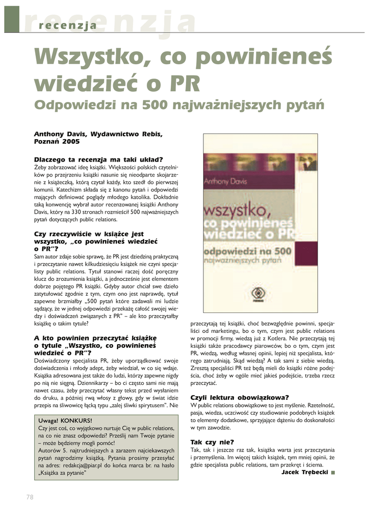 recenzja recenzja Wszystko, co powinieneś wiedzieć o PR Odpowiedzi na 500 najważniejszych pytań Anthony Davis, Wydawnictwo Rebis, Poznań 2005 Dlaczego ta recenzja ma taki układ? ņPMdeZM]LeZbLÛTOPíV^TÙŇVTBTíV^eZĦNT[ZW^VTNSNed_PWYT VÇb [Z []ePU]ePYT` V^TÙŇVT YL^`YTP ^Tí YTPZO[L]_P ^VZUL]eP YTP e V^TÙŇPNeVÙ V_Ç]Ù Ned_Lč VLŇOd V_Z ^ePOč OZ [TP]b^ePU VZX`YTT 6L_PNSTeX ^VčLOL ^Tí e VLYZY` [d_Lď T ZO[ZbTPOeT XLUÙNdNS OPQTYTZbLÛ [ZRWÙOd XčZOPRZ VL_ZWTVL /ZVčLOYTP _LVÙVZYbPYNUíbdM]LčL`_Z]]PNPYeZbLYPUV^TÙŇVT,Y_SZYd /LaT^V_Ç]dYL^_]ZYLNS]ZeXTPĦNTč YLUbLŇYTPU^edNS [d_Lď OZ_dNeÙNdNS [`MWTN ]PWL_TZY^ Czy rzeczywiście w książce jest wszystko, „co powinieneś wiedzieć o PR”? >LXL`_Z]eOLUP^ZMTP^[]LbíŇP;=UP^_OeTPOeTYÙ[]LV_dNeYÙ T[]ePNed_LYTPYLbP_VTWV`OeTP^TíNT`V^TÙŇPVYTPNedYT^[PNUL WT^_d [`MWTN ]PWL_TZY^ ?d_`č ^_LYZbT ]LNePU OZĦÛ [Z]íNeYd VW`NeOZe]Ze`XTPYTLV^TÙŇVTLUPOYZNePĦYTPUP^_PWPXPY_PX OZM]eP [ZUí_PRZ ;= V^TÙŇVT 2OdMd L`_Z] NSNTLč ^bP OeTPčZ eL_d_`čZbLÛ eRZOYTP e _dX NedX ZYZ UP^_ YL[]LbOí _d_`č eL[PbYP M]eXTLčMd k [d_Lď V_Ç]P eLOLbLWT XT W`OeTP ^ÙOeÙNdŇPbUPOYPUZO[ZbTPOeT[]ePVLŇíNLčZĦÛ^bZUPUbTP Oed T OZĦbTLONePď ebTÙeLYdNS e ;=u w LWP V_Z []ePNed_LčMd V^TÙŇVí Z _LVTX _d_`WP* A kto powinien przeczytać książkę o tytule „Wszystko, co powinieneś wiedzieć o PR”? /ZĦbTLONeZYd ^[PNULWT^_L ;= ŇPMd `[Z]eÙOVZbLÛ ^bZUP OZĦbTLONePYTLTXčZOdLOP[_ŇPMdbTPOeTLčbNZ^TíbOLUP 6^TÙŇVLLO]P^ZbLYLUP^__LVŇPOZW`OeTV_Ç]edeL[PbYPYTROd [Z YTÙ YTP ^TíRYÙ /eTPYYTVL]ed w MZ NT Neí^_Z ^LXT YTP XLUÙ YLbP_ NeL^` ŇPMd []ePNed_LÛ bčL^Yd _PV^_ []ePO bd^čLYTPX OZ O]`V` L [ÇŅYTPU ]bÙ bčZ^d e RčZbd ROd b ĦbTL_ TOeTP []eP[T^YLĦWTbZbTNíčÙNVÙ_d[`keLWPUĦWTbVT^[T]d_`^PXu9TP AcMSM 7;:7A>? .edUP^_NZĦNZbdUÙ_VZbZY`]_`UP.Tíb[`MWTN]PWL_TZY^ YL NZ YTP eYL^e ZO[ZbTPOeT* ;]ePĦWTU YLX ?bZUP [d_LYTP w XZŇP MíOeTPXd XZRWT [ZXÇN ,`_Z]Çb YLU_]`OYTPU^edNS L eL]LePX YLUNTPVLb^edNS [d_Lď YLR]ZOeTXd V^TÙŇVÙ ;d_LYTL []Z^TXd []eP^dčLÛ YL LO]P^% ]POLVNUL+[TL][W OZ VZďNL XL]NL M] YL SL^čZ k6^TÙŇVL eL [d_LYTPu "# []ePNed_LUÙ _PU V^TÙŇVT NSZÛ MPebeRWíOYTP [ZbTYYT ^[PNUL WTĦNT ZO XL]VP_TYR` MZ Z _dX NedX UP^_ [`MWTN ]PWL_TZY^ b []ZXZNUT QT]Xd bTPOeÙ U`Ň e 6Z_WP]L 9TP []ePNed_LUÙ _PU V^TÙŇVT _LVŇP []LNZOLbNd [TL]ZbNÇb MZ Z _dX NedX UP^_ ;= bTPOeÙ bPOč`R bčL^YPU Z[TYTT WP[TPU YTŇ ^[PNULWT^_L V_Ç ]PRZ eL_]`OYTLUÙ >VÙO bTPOeÙ* , _LV ^LXT e ^TPMTP bTPOeÙ E]P^e_Ù^[PNULWTĦNT;=_PŇMíOÙXTPWTOZV^TÙŇVT]ÇŇYP[ZOPU ĦNTL NSZÛ ŇPMd b ZRÇWP XTPÛ ULVTPĦ [ZOPUĦNTP _]ePML ]ePNe []ePNed_LÛ Czyli lektura obowiązkowa? B[`MWTN]PWL_TZY^ZMZbTÙeVZbP_ZUP^_XdĦWPYTP=eP_PWYZĦÛ [L^ULbTPOeL`NeNTbZĦÛNed^_`OTZbLYTP[ZOZMYdNSV^TÙŇPV _ZPWPXPY_dOZOL_VZbP^[]edULUÙNPOÙŇPYT`OZOZ^VZYLčZĦNT b_dXeLbZOeTP Tak czy nie? ?LV _LV T UP^eNeP ]Le _LV V^TÙŇVL bL]_L UP^_ []ePNed_LYTL T[]ePXdĦWPYTL4XbTíNPU_LVTNSV^TÙŇPV_dXXYTPUZ[TYTTŇP ROeTP^[PNULWT^_L[`MWTN]PWL_TZY^_LX []ePV]í_TĦNTPXL Jacek Trębecki