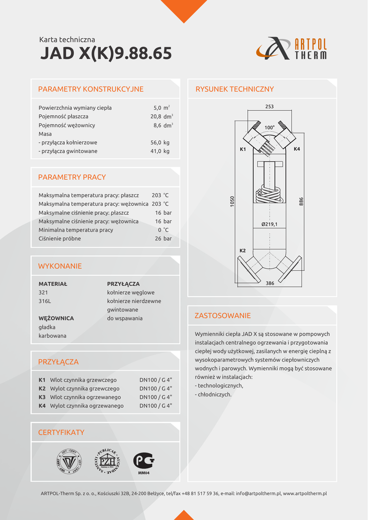 Karta techniczna JAD X(K)9.88.65 PARAMETRY KONSTRUKCYJNE RYSUNEK TECHNICZNY 253 5,0 m2 Powierzchnia wymiany ciepła Pojemność płaszcza 20,8 dm 3 8,6 dm3 Pojemność wężownicy 100° Masa - przyłącza kołnierzowe 56,0 kg - przyłącza gwintowane 41,0 kg K4 K1 Maksymalna temperatura pracy: wężownica 203 oC Maksymalne ciśnienie pracy: płaszcz 16 bar Maksymalne ciśnienie pracy: wężownica 16 bar 886 203 oC Maksymalna temperatura pracy: płaszcz 1050 PARAMETRY PRACY Ø219,1 0 oC Minimalna temperatura pracy Ciśnienie próbne 26 bar K2 WYKONANIE MATERIAŁ PRZYŁĄCZA 321 kołnierze węglowe 316L kołnierze nierdzewne gwintowane WĘŻOWNICA do wspawania 386 ZASTOSOWANIE gładka Wymienniki ciepła JAD X są stosowane w pompowych karbowana instalacjach centralnego ogrzewania i przygotowania ciepłej wody użytkowej, zasilanych w energię cieplną z wysokoparametrowych systemów ciepłowniczych PRZYŁĄCZA wodnych i parowych. Wymienniki mogą być stosowane K1 Wlot czynnika grzewczego DN100 / G 4" również w instalacjach: K2 Wylot czynnika grzewczego DN100 / G 4" - technologicznych, K3 Wlot czynnika ogrzewanego DN100 / G 4" - chłodniczych. K4 Wylot czynnika ogrzewanego DN100 / G 4" CERTYFIKATY ARTPOL-Therm Sp. z o. o., Kościuszki 32B, 24-200 Bełżyce, tel/fax +48 81 517 59 36, e-mail: [email protected], www.artpoltherm.pl