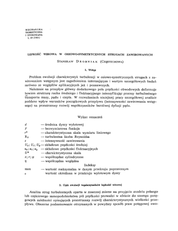 P roblem ewolucji ch arakterystyk turbulencji w osiowo- symetrycznych strugach z zawirowaniem wstę pn ym jest zagadn ien iem interesują cym i wartym szczegół owych ba d a ń