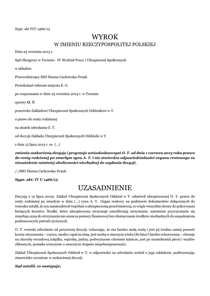 Sygn. akt IVU 1466/13 WYROK W IMIENIU RZECZYPOSPOLITEJ POLSKIEJ Dnia 25 września 2013 r. Sąd Okręgowy w Toruniu - IV Wydział Pracy i Ubezpieczeń Społecznych w składzie: Przewodniczący SSO Hanna Cackowska-Frank Protokolant referent stażysta E. G. po rozpoznaniu w dniu 25 września 2013 r. w Toruniu sprawy O. T. przeciwko Zakładowi Ubezpieczeń Społecznych Oddziałowi w T. o prawo do renty rodzinnej na skutek odwołania O. T. od decyzji Zakładu Ubezpieczeń Społecznych Oddziału w T. z dnia 15 lipca 2013 r. nr (...) zmienia zaskarżoną decyzję i przyznaje wnioskodawczyni O. T. od dnia 1 czerwca 2013 roku prawo do renty rodzinnej po zmarłym synu A. T. i nie stwierdza odpowiedzialności organu rentowego za nieustalenie ostatniej okoliczności niezbędnej do wydania decyzji. /-/SSO Hanna Cackowska-Frank Sygn. akt: IV U 1466/13 UZASADNIENIE Decyzją z 15 lipca 2013r. Zakład Ubezpieczeń Społecznych Oddział w T. odmówił ubezpieczonej O. T. prawa do renty rodzinnej po zmarłym w dniu (...) synu A. T.. Organ rentowy na podstawie dokumentów dołączonych do wniosku ustalił, że syn zamieszkiwał wspólnie z ubezpieczoną przed śmiercią, co wiąże wszystkie strony do pokrywania bieżących kosztów. Środki, które ubezpieczona otrzymuje umożliwiają utrzymanie, natomiast przyczynianie się zmarłego syna do utrzymania nie oznacza pomocy finansowej lecz dostarczanie środków niezbędnych do zaspokojenia podstawowych potrzeb życiowych. O. T. wniosła odwołanie od powyższej decyzji, wskazując, że ma bardzo małą rentę i jest jej trudno samej ponosić koszty utrzymania – czynsz, media i opał na zimę, jest osobą w starszym wieku (82 lata) i bardzo schorowaną – choruje na chorobę wrzodową żołądka, wątrobę, jaskrę, podwyższone ciśnienie tętnicze, jest po mastektomii piersi i węzłów chłonnych, posiada orzeczenie o znacznym stopniu niepełnosprawności. Zakład Ubezpieczeń Społecznych Oddział w T. w odpowiedzi na odwołanie wniósł o jego oddalenie, podtrzymując stanowisko wyrażone w zaskarżonej decyzji. Sąd ustalił, co następuje; O. T. ma 82 lata (urodziła się (...).). Od 9.05.1991r. otrzymuje rentę rodzinną po mężu F. T. w wysokości od marca 2013r. do wypłaty wraz z dodatkiem pielęgnacyjnym w kwocie 1147,63 zł. Ubezpieczona zamieszkiwała razem z synem A. T. w mieszkaniu o powierzchni około 50 m 2 . Czynsz za mieszkanie wynosił miesięcznie 382,70 zł ( na rzecz (...) Zrzeszenia (...) w G.), opłaty za węgiel (około 2 -2,5 tony na zimę) stanowiły około 790 zł za tonę, opłaty za wodę około 40,00 zł miesięcznie, za gaz – po około 35 zł miesięcznie, około 50 zł miesięcznie za prąd, 35,49 zł miesięcznie za telewizję kablową oraz około 40 zł opłaty abonamentowej za telefon, około 99 zł kwartalnie składki (...), około 150 zł miesięcznie za leki. Syn ubezpieczonej pracował w tym okresie w (...) SA w W., gdzie zarabiał około 4000 zł netto miesięcznie. Syn wyjeżdżał do pracy na okresy około 2 tygodni, po czym wracał na weekendy. Syn opłacał opłaty za mieszkanie, poza tym zostawiał ubezpieczonej około 700 zł na wyżywienie. Gdy przyjeżdżał na weekendy ubezpieczona przygotowywała posiłki dla nich obojga. Niezależnie od pozostawianych matce pieniędzy A. T. często sam robił zakupy artykułów spożywczych i owoców, kupował ubezpieczonej lekarstwa i opłacał wizyty u prywatnych lekarzy. Ubezpieczona jest osobą schorowaną, po wycięciu raka piersi i węzłów chłonnych, leczy się na jaskrę, żołądek, stosuje też leki przeciwbólowe z powodu bólów kręgosłupa i stawów. Z powodu wrzodów żołądka musi stosować specjalną dietę, przyjmować witaminy. A. T. zmarł w dniu (...)2013r. W dniu 26 czerwca 2013r. ubezpieczona złożyła wniosek o rentę rodziną po zmarłym synu A. T.. Po śmierci syna po opłaceniu wszelkich opłat, na żywność i środki czystości (papier toaletowy, krem, mydło) pozostaje ubezpieczonej niecałe 270 zł. Za ostatnie miesiące po śmierci syna ubezpieczona zmuszona była na utrzymanie przeznaczać środki pieniężne uzyskane z polisy syna. /dowód: decyzja z 13.06.1991r., k. 62 akt rentowych, plik I, rachunki, k-24-31 akt rentowych plik II oraz 11-19 akt sądowych, zeznania świadka K. S., protokół elektroniczny z 25.09.2013r., od 00:44;43,zeznania ubezpieczonej w charakterze strony, protokół elektroniczny z 25.09.2013r., od 00:04:31, wniosek, k. 1-4 akt rentowych plik II/ Sąd zważył, co następuje; Stan faktyczny w niniejszej sprawie został ustalony w oparciu o dokumenty zgromadzone w aktach sprawy i aktach organu rentowego, których treść nie budziła wątpliwości Sądu i nie była kwestionowana przez strony, a także zeznania świadka K. S. i przesłuchanie ubezpieczonej w charakterze strony. Sąd dał wiarę zeznaniom świadka i ubezpieczonej, gdyż były szczere, spontaniczne i zgodne z zebranymi dokumentami. Pełnomocnik organu rentowego po zapoznaniu się z materiałem dowodowym w sprawie nie kwestionował zeznań świadka i ubezpieczonej oraz faktu przyczyniania się A. T. do utrzymania ubezpieczonej, oświadczając że pozostawia rozstrzygniecie do uznania sądu (vide: stanowisko pełnomocnika organu rentowego, protokół elektroniczny z 25.09.2013r. od 00:50:08, protokół skrócony, k-28 akt). Stosownie do treści art. 65 ust. 1 ustawy z dnia 17 grudnia 1998r. o emeryturach i rentach z Funduszu Ubezpieczeń Społecznych (tekst jedn. Dz.U. z 2009r. Nr 153, poz.1227 ze zm. zwanej w dalszej części uzasadnienia „ustawą emerytalną”) renta rodzinna przysługuje uprawnionym członkom rodziny osoby, która chwili śmierci miała ustalone prawo do emerytury lub renty z tytułu niezdolności do pracy lub spełniała warunki wymagane do uzyskania jednego z tych świadczeń. Zgodnie z art. 71 ustawy emerytalnej rodzice mają prawo do renty rodzinnej, jeżeli: 1) ubezpieczony (emeryt lub rencista) bezpośrednio przed ś
