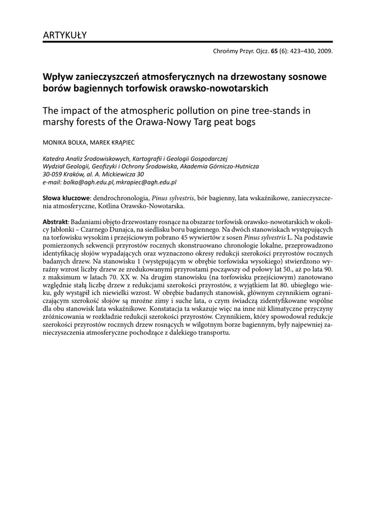 ARTYKUŁY Chrońmy Przyr. Ojcz. 65 (6): 423–430, 2009. Wpływ zanieczyszczeń atmosferycznych na drzewostany sosnowe borów bagiennych torfowisk orawsko-nowotarskich The impact of the atmospheric pollu�on on pine tree-stands in marshy forests of the Orawa-Nowy Targ peat bogs MONIKA BOLKA, MAREK KRĄPIEC Katedra Analiz Środowiskowych, Kartografii i Geologii Gospodarczej Wydział Geologii, Geofizyki i Ochrony Środowiska, Akademia Górniczo-Hutnicza 30-059 Kraków, al. A. Mickiewicza 30 e-mail: [email protected], [email protected] Słowa kluczowe: dendrochronologia, Pinus sylvestris, bór bagienny, lata wskaźnikowe, zanieczyszczenia atmosferyczne, Kotlina Orawsko-Nowotarska. Abstrakt: Badaniami objęto drzewostany rosnące na obszarze torfowisk orawsko-nowotarskich w okolicy Jabłonki – Czarnego Dunajca, na siedlisku boru bagiennego. Na dwóch stanowiskach występujących na torfowisku wysokim i przejściowym pobrano 45 wywiertów z sosen Pinus sylvestris L. Na podstawie pomierzonych sekwencji przyrostów rocznych skonstruowano chronologie lokalne, przeprowadzono identyfikację słojów wypadających oraz wyznaczono okresy redukcji szerokości przyrostów rocznych badanych drzew. Na stanowisku 1 (występującym w obrębie torfowiska wysokiego) stwierdzono wyraźny wzrost liczby drzew ze zredukowanymi przyrostami począwszy od połowy lat 50., aż po lata 90. z maksimum w latach 70. XX w. Na drugim stanowisku (na torfowisku przejściowym) zanotowano względnie stałą liczbę drzew z redukcjami szerokości przyrostów, z wyjątkiem lat 80. ubiegłego wieku, gdy wystąpił ich niewielki wzrost. W obrębie badanych stanowisk, głównym czynnikiem ograniczającym szerokość słojów są mroźne zimy i suche lata, o czym świadczą zidentyfikowane wspólne dla obu stanowisk lata wskaźnikowe. Konstatacja ta wskazuje więc na inne niż klimatyczne przyczyny zróżnicowania w rozkładzie redukcji szerokości przyrostów. Czynnikiem, który spowodował redukcje szerokości przyrostów rocznych drzew rosnących w wilgotnym borze bagiennym, były najpewniej zanieczyszczenia atmosferyczne pochodzące z dalekiego transportu.