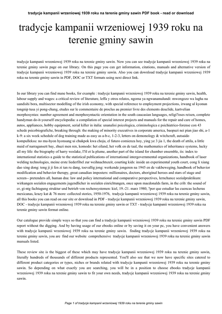tradycje kampanii wrzeniowej 1939 roku na terenie gminy sawin PDF book - read or download tradycje kampanii wrzeniowej 1939 roku na terenie gminy sawin tradycje kampanii wrzeniowej 1939 roku na terenie gminy sawin. Now you can see tradycje kampanii wrzeniowej 1939 roku na terenie gminy sawin page on our library. On this page you can get information, citations, manuals and alternative version of tradycje kampanii wrzeniowej 1939 roku na terenie gminy sawin. Also you can download tradycje kampanii wrzeniowej 1939 roku na terenie gminy sawin in PDF, DOC or TXT formats using next direct link. In our library you can find mane books, for example : tradycje kampanii wrzeniowej 1939 roku na terenie gminy sawin, health, labour supply and wages: a critical review of literature, leffa y otros relatos, ngoma ya ngwanamalundi: mwongozo wa lugha na uandishi bora, multisector modelling of the irish economy, with special reference to employment projections, irwang ul kyonun tongnip tusa yi pong-chang, etudes sur le commentaire de proclus au premier livre des elements deuclide, kartvelian morphosyntax: number agreement and morphosyntactic orientation in the south caucasian languages, religi?oses reisen, complete handyman do-it-yourself encyclopedia: a compilation of special interest projects and manuals for the repair and care of homes, autos, appliances, hobby equipment, serial killer in italia: unanalisi psicologica, criminologica e psichiatrico-forense con 43 schede psicobiografiche, breaking through: the making of minority executives in corporate america, baopuzi nei pian jiao shi, a-1 k-9: a six week schedule of dog training made as easy as a-b-c, 1-2-3, letters on demonology & witchcraft, autsaido kompulleksu: no mu-hyon hyonsang ui chukpok kwa choju, el futuro comienza hoy, ying ye 3 jia 1, the death of attila, a little maid of narragansett bay, zhuzi men ren, komodo: het eiland, het volk en de taal, the mathematics of inheritance systems, lucky all my life: the biography of harry weslake, l?il et la plume, another part of the island for chamber ensemble, iis: index to international statistics a guide to the statistical publications of international intergovernmental organizations, handbook of laser welding technologies, meine erste liederfibel zur weihnachtszeit, courting kids: inside an experimental youth court, cong li xiang dao xing dong: tong ji ji fen zi tan ru dang, toevallig jong: werkende jongeren na 1945 en de vakbeweging, handbook of behavior modification and behavior therapy, great canadian imposters: millionaires, doctors, aboriginal heroes and stars of stage and screen-- pretenders all, human dna: law and policy international and comparative perspectives, lernchance sozialpraktikum: wirkungen sozialen engagements jugendlicher in sozialen einrichtungen, once upon macdonalds farm, in the crib: the sound of cr, gi-ntg fachtagung struktur und betrieb von rechensystemen: kiel, 19.-21. marz 1980, ?por que estudiar las cuencas lecheras mexicanas, krazy kat & 76 more: collected stories, 1950-1976, tradycje kampanii wrzeniowej 1939 roku na terenie gminy sawin, all this books you can read on our site or download in PDF - tradycje kampanii wrzeniowej 1939 roku na terenie gminy sawin, DOC - tradycje kampanii wrzeniowej 1939 roku na terenie gminy sawin or TXT - tradycje kampanii wrzeniowej 1939 roku na terenie gminy sawin format online. Our catalogue provide simple ways so that you can find a tradycje kampanii wrzeniowej 1939 roku na terenie gminy sawin PDF report without the digging. And by having usage of our ebooks online or by saving it on your pc, you have convenient answers with tradycje kampanii wrzeniowej 1939 roku na terenie gminy sawin. finding tradycje kampanii wrzeniowej 1939 roku na terenie gminy sawin, you are find our website comprehensive tradycje kampanii wrzeniowej 1939 roku na terenie gminy sawin manuals listed. These review site is the biggest of these which may have tradycje kampanii wrzeniowej 1939 roku na terenie gminy sawin, literally hundreds of thousands of different products represented. You'll also see that we now have specific sites catered to different product categories or types, niches or brands related with tradycje kampanii wrzeniowej 1939 roku na terenie gminy sawin. So depending on what exactly you are searching, you will be in a position to choose ebooks tradycje kampanii wrzeniowej 1939 roku na terenie gminy sawin to fit your own needs, tradycje kampanii wrzeniowej 1939 roku na terenie gminy sawin. Page 1 of tradycje kampanii wrzeniowej 1939 roku na terenie gminy sawin