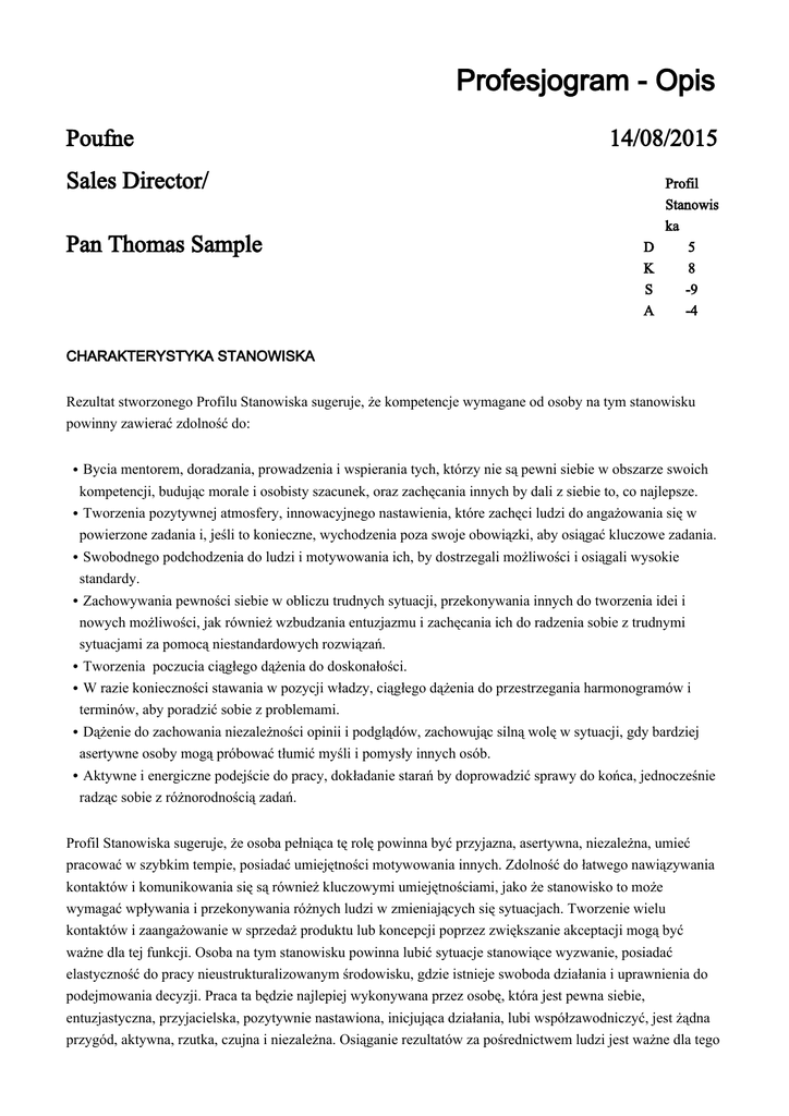 Profesjogram - Opis Poufne 14/08/2015 Sales Director/ Pan Thomas Sample D K S A Profil Stanowis ka 5 8 -9 -4 CHARAKTERYSTYKA STANOWISKA Rezultat stworzonego Profilu Stanowiska sugeruje, że kompetencje wymagane od osoby na tym stanowisku powinny zawierać zdolność do: • Bycia mentorem, doradzania, prowadzenia i wspierania tych, którzy nie są pewni siebie w obszarze swoich kompetencji, budując morale i osobisty szacunek, oraz zachęcania innych by dali z siebie to, co najlepsze. • Tworzenia pozytywnej atmosfery, innowacyjnego nastawienia, które zachęci ludzi do angażowania się w powierzone zadania i, jeśli to konieczne, wychodzenia poza swoje obowiązki, aby osiągać kluczowe zadania. • Swobodnego podchodzenia do ludzi i motywowania ich, by dostrzegali możliwości i osiągali wysokie standardy. • Zachowywania pewności siebie w obliczu trudnych sytuacji, przekonywania innych do tworzenia idei i nowych możliwości, jak również wzbudzania entuzjazmu i zachęcania ich do radzenia sobie z trudnymi sytuacjami za pomocą niestandardowych rozwiązań. • Tworzenia poczucia ciągłego dążenia do doskonałości. • W razie konieczności stawania w pozycji władzy, ciągłego dążenia do przestrzegania harmonogramów i terminów, aby poradzić sobie z problemami. • Dążenie do zachowania niezależności opinii i podglądów, zachowując silną wolę w sytuacji, gdy bardziej asertywne osoby mogą próbować tłumić myśli i pomysły innych osób. • Aktywne i energiczne podejście do pracy, dokładanie starań by doprowadzić sprawy do końca, jednocześnie radząc sobie z różnorodnością zadań. Profil Stanowiska sugeruje, że osoba pełniąca tę rolę powinna być przyjazna, asertywna, niezależna, umieć pracować w szybkim tempie, posiadać umiejętności motywowania innych. Zdolność do łatwego nawiązywania kontaktów i komunikowania się są również kluczowymi umiejętnościami, jako że stanowisko to może wymagać wpływania i przekonywania różnych ludzi w zmieniających się sytuacjach. Tworzenie wielu kontaktów i zaangażowanie w sprzedaż produktu lub koncepcji poprzez zwiększanie akceptacji mogą być ważne dla tej funkcji. Osoba na tym stanowisku powinna lubić sytuacje stanowiące wyzwanie, posiadać elastyczność do pracy nieustrukturalizowanym środowisku, gdzie istnieje swoboda działania i uprawnienia do podejmowania decyzji. Praca ta będzie najlepiej wykonywana przez osobę, która jest pewna siebie, entuzjastyczna, przyjacielska, pozytywnie nastawiona, inicjująca działania, lubi współzawodniczyć, jest żądna przygód, aktywna, rzutka, czujna i niezależna. Osiąganie rezultatów za pośrednictwem ludzi jest ważne dla tego stanowiska. Należy pamiętać, że przy porównaniu Profilu Osobowego z Profilem Stanowiska należy brać pod uwagę pełną analizę i wszystkie wnioski, a także, co równie istotne, wszelkie dane biograficzne. SUGESTIE DLA OSOBY PRZEPROWADZAJĄCEJ WYWIAD - OPIS STANOWISKA Sales Director Poniższe stwierdzenia mają zastosowanie w odniesieniu do Profilu Stanowiska który został stworzony dla pozycji Sales Director. Jeśli zgadza się Pan/ Pani z większością tych stwierdzeń, można sądzić, że Profil Stanowiska stworzony dla tej funkcji będzie właściwy i odpowiadający rzeczywistym wymaganiom roli. Komunikacja (Wysokie K) • Od zwycięskiego kandydata będzie się czasami wymagać działań socjalnych i wypełniania obowiązków na rzecz społeczności poza organizacją. • Optymalne byłoby, by pozycja ta została obsadzona przez kogoś o pewnym siebie i spokojnym podejściu. • Poszukiwani będą kandydaci przejawiający naturalną pewność siebie. • Ważnym atrybutem będzie umiejętność robienia korzystnego wrażenia na innych. • Istotnym elementem pracy jest zdobywanie entuzjastycznego zaangażowania innych. Dominacja (Wysokie D) • Umiejętność rozwiązywania problemów i stosowania odpowiednich środków zaradczych będzie korzystna dla wybranej osoby. • Styl asertywny lecz nie agresywny może być oczekiwany na tym stanowisku. • Umiejętność dostosowywania się i łagodność mogą niekoniecznie być wymagane od zwycięskiego kandydata. • Zdolność do ustanawiania trudnych celów może być ważnym wymogiem roli. • Szybka reakcja na zmiany spotka się z pozytywnym przyjęciem. Adaptacja (Niskie A) • Kandydaci posiadający silną wolę i niezależni będą pasować do szeregu ważnych elementów roli. • Zdecydowana, a nawet czasami niekonwencjonalna niezależność będzie wymagana na tym stanowisku. • Osoba działająca w zgodzie z polityką, systematyczna i perfekcjonistyczna może nie pasować do kluczowych wymogów tej posady. © Thomas International Limited 1990-2008 2 • Wydaje się, że na stanowisko to potrzebni są ludzie wytrwali oraz posiadający zdecydowane opinie i w taki sposób podejmujący decyzje. • Rekomendowani kandydaci w większości przypadków będą wytrwali i czasem nieprzewidywalni w postawach jakie mogą przyjmować. Stabilizacja (Niskie S) • Samokrytyka i poszukiwanie winy będą odgrywać istotną rolę w osiąganiu najlepszych wyników. • Na stanowisko to potrzebni są kandydaci którzy niecierpliwie dążą do osiągnięć na wysokim poziomie, a których nie satysfakcjonuje tylko status quo. • Kandydaci którzy nieustannie poszukują nowych i lepszych sposobów wykonywania zadań będą pasować do tej roli. • Mobilność i czujność będą wymagane od wybranych osób chcących osiągać satysfakcjonujące rezultaty na tym stanowisku. • Osoby niecierpliwie dążące do wyników będą się kwalifikować do wstępnej selekcji na to stanowisko. © Thomas International Limited 1990-2008 3 Profil Stanowiska D K S A © Thomas International Limited 1990-2008 4