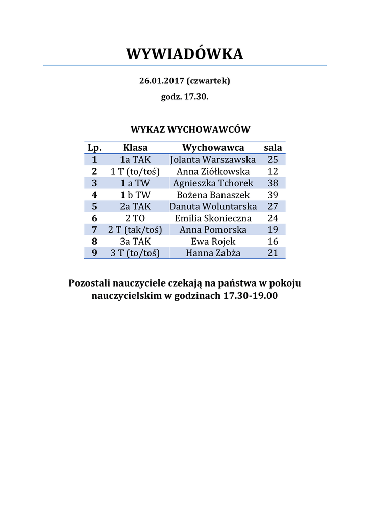 WYWIADÓWKA 26.01.2017 (czwartek) godz. 17.30. WYKAZ WYCHOWAWCÓW Lp. Klasa Wychowawca sala 1 1a TAK Jolanta Warszawska 25 2 1 T (to/toś) Anna Ziółkowska 12 3 1 a TW Agnieszka Tchorek 38 4 1 b TW Bożena Banaszek 39 5 2a TAK Danuta Woluntarska 27 6 2 TO Emilia Skonieczna 24 7 2 T (tak/toś) Anna Pomorska 19 8 3a TAK Ewa Rojek 16 9 3 T (to/toś) Hanna Zabża 21 Pozostali nauczyciele czekają na państwa w pokoju nauczycielskim w godzinach 17.30-19.00