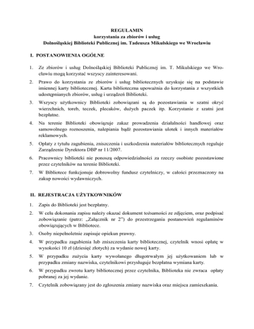 REGULAMIN korzystania za zbiorów i usług Dolnośląskiej Biblioteki Publicznej im. Tadeusza Mikulskiego we Wrocławiu I. POSTANOWIENIA OGÓLNE 1. Ze zbiorów i usług Dolnośląskiej Biblioteki Publicznej im. T. Mikulskiego we Wrocławiu mogą korzystać wszyscy zainteresowani. 2. Prawo do korzystania ze zbiorów i usług bibliotecznych uzyskuje się na podstawie imiennej karty bibliotecznej. Karta biblioteczna upoważnia do korzystania z wszystkich udostępnianych zbiorów, usług i urządzeń Biblioteki. 3. Wszyscy użytkownicy Biblioteki zobowiązani są do pozostawiania w szatni okryć wierzchnich, toreb, teczek, plecaków, dużych paczek itp. Korzystanie z szatni jest bezpłatne. 4. Na terenie Biblioteki obowiązuje zakaz prowadzenia działalności handlowej oraz samowolnego roznoszenia, nalepiania bądź pozostawiania ulotek i innych materiałów reklamowych. 5. Opłaty z tytułu zagubienia, zniszczenia i uszkodzenia materiałów bibliotecznych reguluje Zarządzenie Dyrektora DBP nr 11/2007. 6. Pracownicy biblioteki nie ponoszą odpowiedzialności za rzeczy osobiste pozostawione przez czytelników na terenie Biblioteki. 7. W Bibliotece funkcjonuje dobrowolny fundusz czytelniczy, w całości przeznaczony na zakup nowości wydawniczych. II. REJESTRACJA UŻYTKOWNIKÓW 1. Zapis do Biblioteki jest bezpłatny. 2. W celu dokonania zapisu należy okazać dokument tożsamości ze zdjęciem, oraz podpisać zobowiązanie (patrz: „Załącznik nr 2”) do przestrzegania postanowień regulaminów obowiązujących w Bibliotece. 3. Osoby niepełnoletnie zapisuje opiekun prawny. 4. W przypadku zagubienia lub zniszczenia karty bibliotecznej, czytelnik wnosi opłatę w wysokości 10 zł (dziesięć złotych) za wydanie nowej karty. 5. W przypadku zużycia karty wywołanego długotrwałym jej użytkowaniem lub w przypadku zmiany nazwiska, czytelnikowi przysługuje bezpłatna wymiana karty. 6. W przypadku zwrotu karty bibliotecznej przez czytelnika, Biblioteka nie zwraca opłaty pobranej za jej wydanie. 7. Czytelnik zobowiązany jest do zgłoszenia zmiany nazwiska oraz miejsca zamieszkania. 8. Konto czytelnika ważne jest przez rok od momentu zapisu. Po tym czasie czytelnik zobowiązany jest do uaktualnienia danych osobowych w zapisie. III. UDOSTĘPNIANIE NA ZEWNĄTRZ 1. W każdym dziale Biblioteki można wypożyczyć 6 dowolnych egzemplarzy zbiorów, z wyjątkiem udostępnianych wyłącznie na miejscu, przy czym całkowita liczba wypożyczeń w Bibliotece nie może przekroczyć 20 egzemplarzy. 2. Książki, nuty, audiobooki, kasety magnetofonowe, płyty analogowe oraz płyty CD do nauki języków obcych można wypożyczyć na okres 1 miesiąca. 3. Płyty CD, DVD, DVD Blu Ray oraz edycje elektroniczne typu Playway można wypożyczyć na 7 dni. 4. Czytelnia nie wypożycza książek wydanych przed 1951 rokiem. 5. Termin zwrotu wypożyczonych zbiorów można prolongować dwukrotnie. 6. Prolongacie nie podlegają egzemplarze zamówione przez innych czytelników. 7. Prolongaty można dokonać w Bibliotece osobiście, telefonicznie, mailowo lub za pośrednictwem internetu (konto użytkownika jest dostępne na stronie katalogu elektronicznego www.dzb.pl). 8. Za przekroczenie terminu zwrotu zbiorów Biblioteka pobiera opłaty w wysokości: a. za przetrzymanie książek, audiobooków, kaset magnetofonowych, płyt analogowych oraz płyt CD do nauki języków obcych 0,15 zł za dzień, b. za przetrzymanie płyt CD i DVD, DVD Blu Ray oraz edycji elektronicznych typu Playway wynosi 1 zł za dzień. 9. Czytelnikom do 16 roku życia nie jest naliczana opłata w żadnym z działów biblioteki. 10. Jeżeli termin zwrotu wypożyczonych zbiorów przypada na dzień zamknięcia Biblioteki, użytkownik ma obowiązek oddania zbiorów pierwszego dnia pracy Biblioteki następującego po tym terminie. Każdy kolejny dzień, z pominięciem dni zamknięcia Biblioteki, wliczany jest do opłaty karnej. 11. Jeżeli łączna wielkość kary z tytułu przetrzymania wszystkich wypożyczonych zbiorów ponad ustalony termin przekroczy 5 zł – nastąpi blokada konta czytelnika i dostępu do wszystkich usług bibliotecznych. 12. Użytkownik może ponownie korzystać z usług po uregulowaniu wszystkich zobowiązań wobec Biblioteki. 13. Użytkownikom, którzy podczas zapisu podali adres poczty elektronicznej, Biblioteka przed upływem terminu zwrotu materiałów wysyła przypomnienie o terminie zwrotu. Powiadomienia niniejsze mają charakter pomocniczy oraz informacyjny, a ich niedostarczenie do skrzynki poczty elektronicznej Użytkownika nie stanowi podstawy do obniżenia bądź anulowania nałożonej opłaty za przetrzymanie materiałów bibliotecznych. 14. Biblioteka zastrzega sobie prawo do wpisania do Krajowego Rejestru Długów tych czytelników, którzy w wyznaczonym terminie nie wniosą opłat z tytułu kar za nieterminowy zwrot wypożyczonych materiałów bibliotecznych, ich uszkodzenie, zniszczenie lub zagubienie, oraz prawo dochodzenia wobec nich swoich roszczeń na drodze sądowej. 15. Użytkownik Biblioteki może zamówić zbiory drogą elektroniczną. Liczba zamówień kierowana do jednego działu nie może przekroczyć 6, a maksymalna liczba zamówień – 20. 16. Możliwe jest zamówienie maksymalnie do 6 egzemplarzy w każdym dziale Biblioteki. Zamawiać można egzemplarze wypożyczone i aktualnie znajdujące się na półkach. 17. Zamówione egzemplarze należy odebrać w ciągu 3 dni. Po tym terminie zamówienie traci ważność. 18. Użytkownik otrzymuje powiadomienie o terminie odbioru zamówionych zbiorów na własne czytelnicze konto internetowe lub e-mailem (jeśli podał swój adres mailowy). 19. Katalog Biblioteki jest dostępny pod adresem www.dzb.pl. Konto czytelnika zawiera informacje o bieżących wypożyczeniach, zamówieniach i karach, oraz umożliwia zamawianie zbiorów. IV. UDOSTĘPNIANIE NA MIEJSCU 1. W działach biblioteki znajdują się wyodrębnione i specjalnie oznaczone zbiory przeznaczone do ud