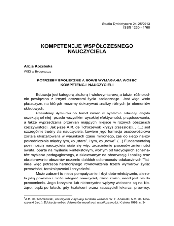 Studia Dydaktyczne 24-25/2013 ISSN 1230 - 1760 KOMPETENCJE WSPÓŁCZESNEGO NAUCZYCIELA Alicja Kozubska WSG w Bydgoszczy POTRZEBY SPOŁECZNE A NOWE WYMAGANIA WOBEC KOMPETENCJI NAUCZYCIELI Edukacja jest kategorią złożoną i wielowymiarową a także różnorodnie powiązana z innymi obszarami życia społecznego. Jest więc wiele płaszczyzn, na których możemy dokonywać analizy różnych jej elementów składowych. Uczestnicy dyskursu na temat zmian w systemie edukacji często oczekują od niej przede wszystkim wysokiej efektywności, przystosowania, a także wyprzedzania przemian mających miejsce w różnych obszarach rzeczywistości. Jak pisze A.M. de Tchorzewski kryzys przeszłości, „ (...) jest szczególnie trudny dla nauczyciela, bowiem jego formacja osobowościowa została ukształtowana w warunkach czasu minionego, zaś do niego należy pośredniczenie między tym, co „stare”, i tym, co „nowe”. (...) Fundamentalną powinnością nauczyciela staje się więc zrozumienie procesów zmienności świata, oparte na myśleniu kontekstowym, wolnym od tradycyjnych schematów myślenia pedagogicznego, a skierowanym na obserwację i analizę oraz eksplorowanie obszarów pozornie dalekich od procesów edukacyjnych.”1Istnieje więc potrzeba harmonijnego równoważenia trzech wymiarów życia: przeszłości, teraźniejszości i przyszłości. Może zabrzmi to nieco pompatycznie i zbyt deterministycznie, ale rola jaką powinien i może odegrać nauczyciel, mimo zmian, nadal jest nie do przecenienia. Jego korzystne lub niekorzystne wpływy widoczne są na bieżąco, bądź po latach, gdy kształceni przez nauczycieli lekarze, prawnicy, 1 A.M. de Tchorzewski, Nauczyciel w sytuacji konfliktu wartości. W: F. Adamski, A.M. de Tchorzewski (red.): Edukacja wobec dylematów moralnych współczesności. Kraków 1999, s. 34 132 POTRZEBY SPOŁECZNE A NOWE WYMAGANIA WOBEC KOMPETENCJI NAUCZYCIELI informatycy i przedstawiciele pozostałych zawodów podejmują swoje zadania w innych niż edukacja płaszczyznach życia społecznego. W jakiejś mierze ich wiedza, umiejętności, postawy na pewno zależą od nauczycieli z jakimi dane było im się zetknąć na wszystkich etapach swojej edukacji. Uzyskiwanie nowej jakości kształcenia i wychowania wymaga głębokich przeobrażeń w myśleniu o edukacji i o roli nauczyciela. Przeobrażenia te są niejako wymuszane przez tempo zmian zachodzących w rzeczywistości pozaedukacyjnej.Procesy demokratyzacji jakie miały i nadal mają miejsce w krajach Europy, głównie Środkowo – Wschodniej na przełomie XX i XXI wieku „…sprawiły, że ich niepodległościowe aspiracje wywołały potrzebę określenia orientacyjnych punktów odniesienia, wyznaczających granice wolności.”2Zaktualizowanie oczekiwań wobec nauczycieli wymaga uwzględnienia wielowymiarowości ich funkcjonowania, bowiem rzeczywistość edukacyjna splata się z innymi wymiarami rzeczywistości społecznej. Nadal jednak w myśleniu i analizowaniu kompetencji nauczycieli występuje tendencja do idealizowania wizji nauczyciela i wymieniania jego cech pożądanych z punktu widzenia rozwoju osobowego uczniów, społeczeństwa czy też samych nauczycieli.Możemy więc, w zależności od typologii mówić o : kompetencjach merytorycznych, dydaktycznych i psychologicznych nazywanych też meta umiejętnościami pracy z innymi ludźmi ( H. Hammer); czy też o kompetencjach pragmatycznych, interpretacyjnokomunikacyjnych, kooperacyjnych, kreatywnych, informatyczno-medialnych i autokreacyjnych.3 Możemy zastanawiać się jak powinny być rozłożone akcenty w poszczególnych grupach kompetencji u nauczycieli pracujących na różnych poziomach kształcenia. Wreszcie, jako nauczyciele akademiccy, często zastanawiamy się, jak skutecznie owe kompetencje rozwijać? Niepokój jednak budzi to, iż w praktyce edukacyjnejzbyt wiele mamy przykładów świadczących o braku kompetencji, bądź może ich nieadekwatności. Są to nauczyciele, którzy nie potrafią zapanować nad dyscypliną w klasie, którzy swoją nieudolnością wręcz przyczyniają się do demoralizacji uczniów, którzy płaczą na lekcji, bądź ujawniają wiele zachowań o charakterze agresywnym, nauczyciele, którzy unikają wychowania skupiając się tylko na dydaktyce i już na początku swojej profesjonalnej drogi czują się wypale2 A. Kwatera,Wymiary autorytetu nauczyciela akademickiego a optymalizacja jego oddziaływań, w: Współczesne wyzwania dydaktyki szkoły wyższej (red.) A. Domagała- Kręcioch, O. Wyżga, Wyd. Naukowe Uniwersytetu Pedagogicznego, Kraków 2009, s. 33 3 Tamże, ss. 43-45 Studia Dydaktyczne 24/2012 ISSN 1230 - 1760 133 ALICJA KOZUBSKA ni zawodowo. W takich sytuacjach zadajemy sobie pytanie: dlaczego tak się dzieje?Dlaczego kompetencje, które wcześniej okazywały się być wystarczającymi, współcześnie takimi nie są? Oczywiście mam pełną świadomość tego, że przyczyny negatywnych zjawisk w szkole nie tkwią tylko w nauczycielu. Może więc precyzując należy zapytać, dlaczego niektórzy z nauczycieli nie potrafią odnaleźć się w procesie szeroko rozumianych zmian społecznych, w tym edukacyjnych? ? Jakie zmiany w procesie kształcenia i dokształcania nauczycieli należy wprowadzać, aby stworzyć szansę na poprawę stanu rzeczy? Sądzę, iż przydatne w tych analizach i próbie poszukiwania odpowiedzi na postawione pytania mogą okazać się kategorie „sprzeczności i ambiwalencji”. O kategorii ambiwalencji pisał między innymi Lech Witkowski. „Ambiwalencji, która sytuuje praktykę edukacyjną w kontekście takich wyznaczników współczesnej kultury, jak wieloznaczność, niestałość, chaos zmieniających się ofert, złożoność. Ambiwalencji, którą należy rozumieć jako konieczność ciągłego oscylowania pomiędzy różnoimiennymi wartościami, które wzajemnie się przenikają, pomiędzy skrajnościami postaw i zachowań, pomiędzy empatią a dystansem, naciski
